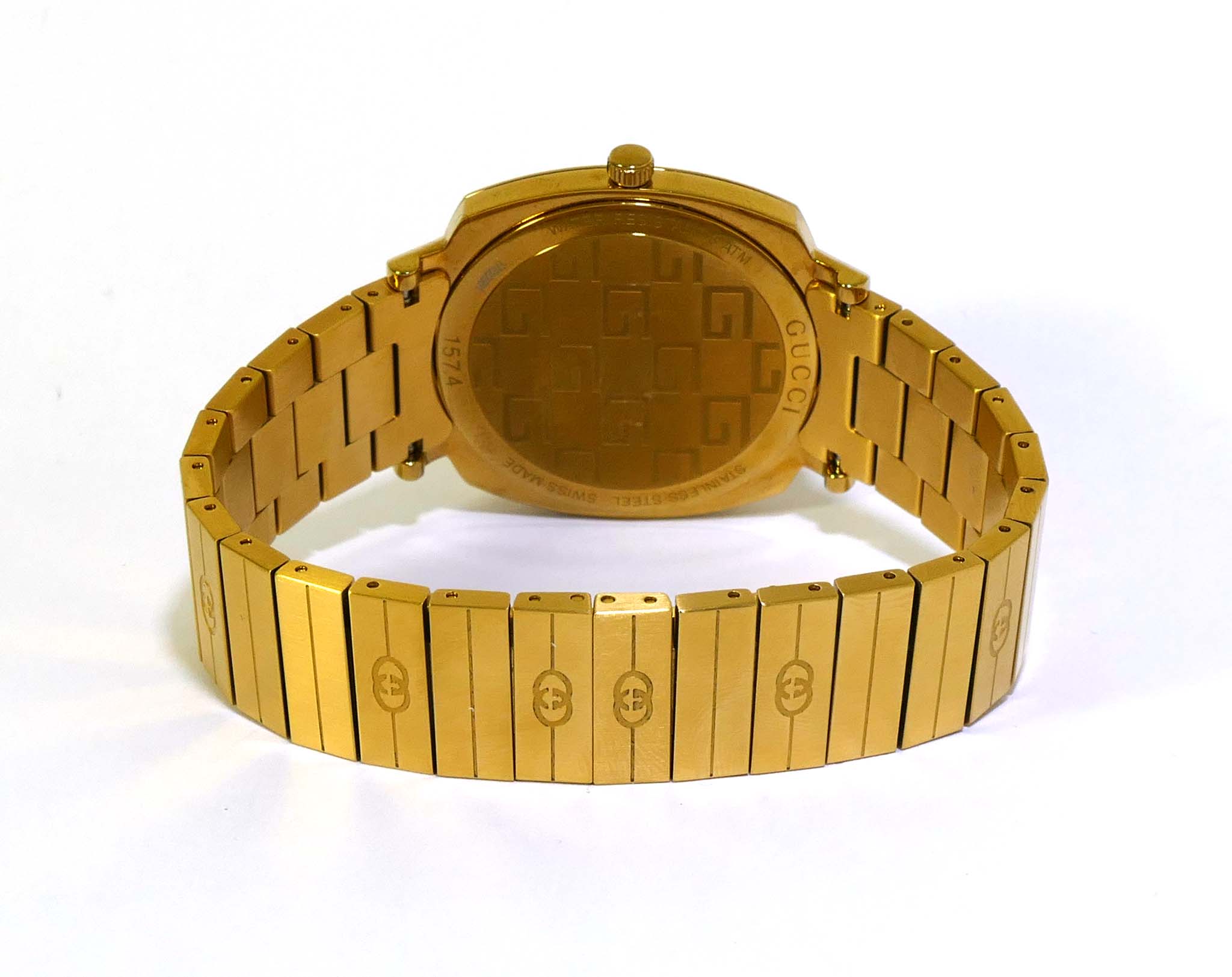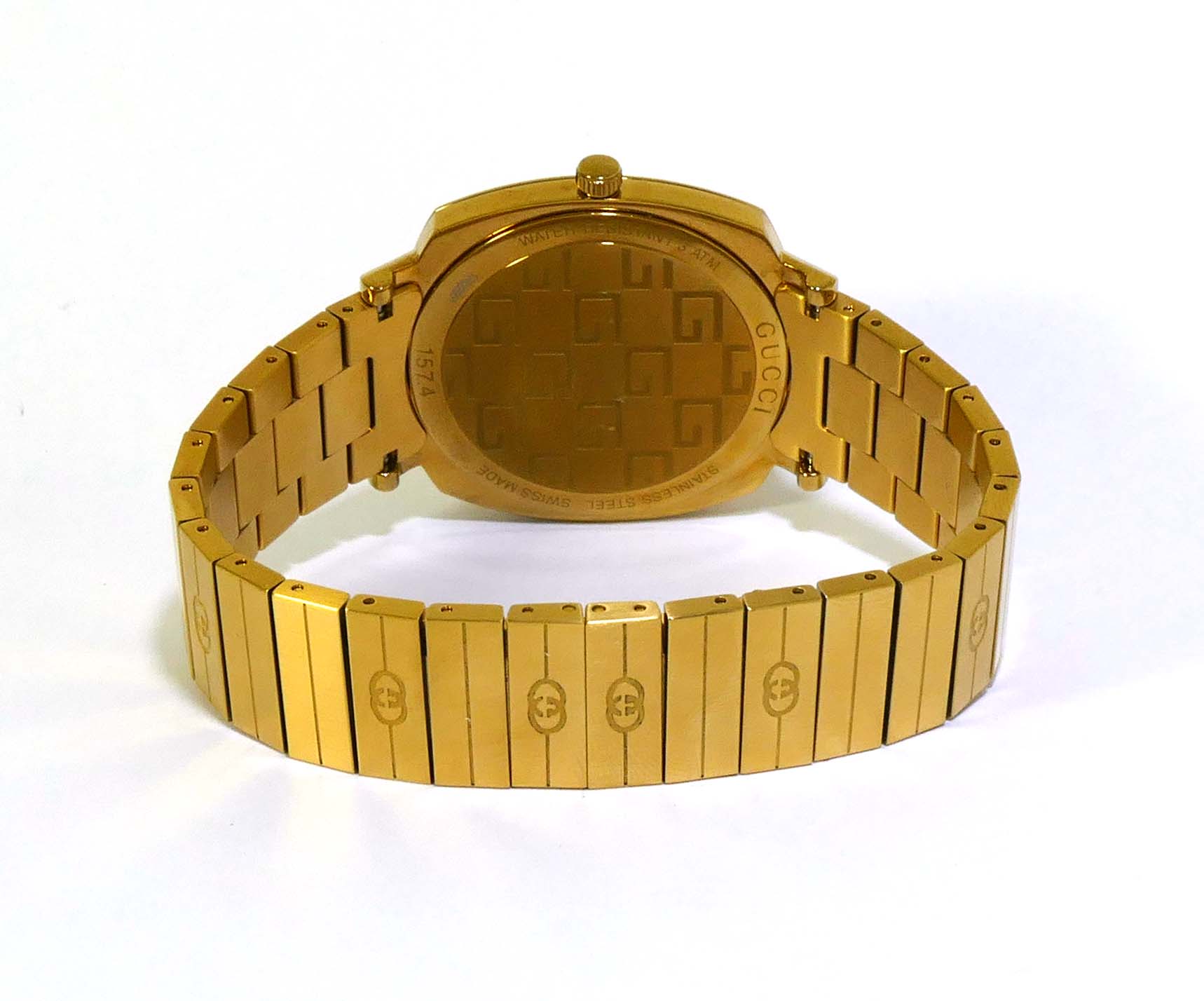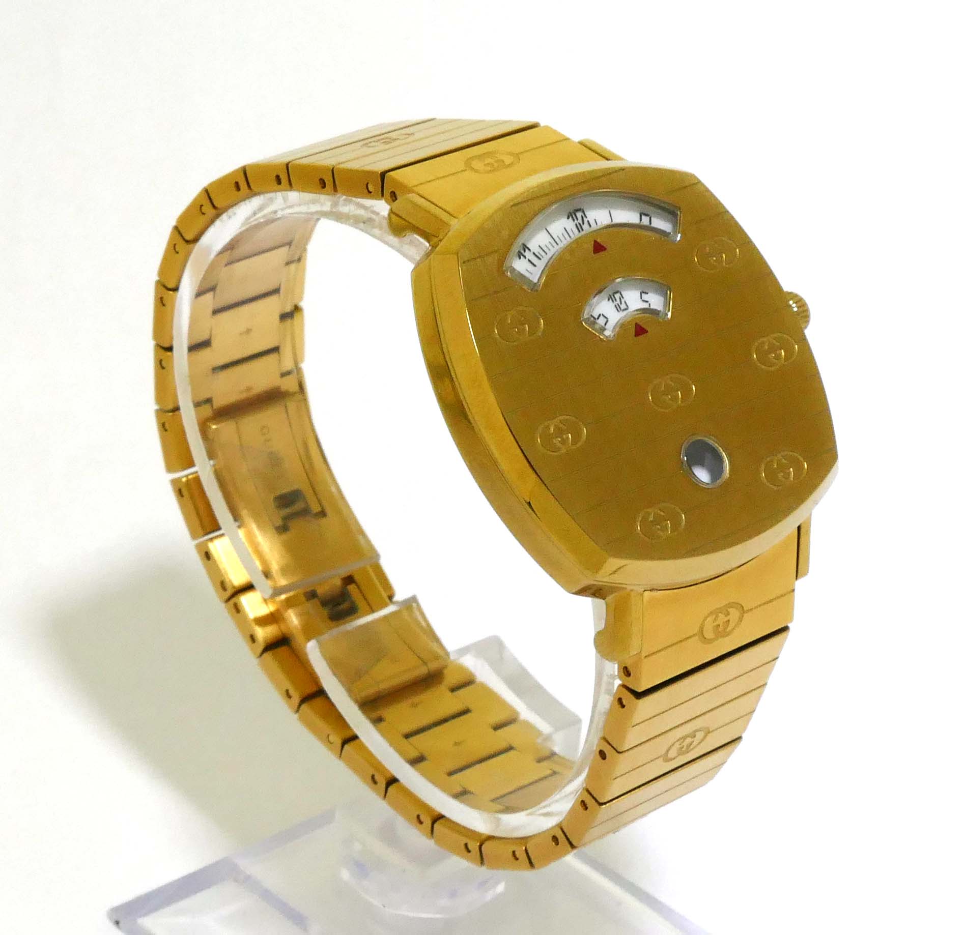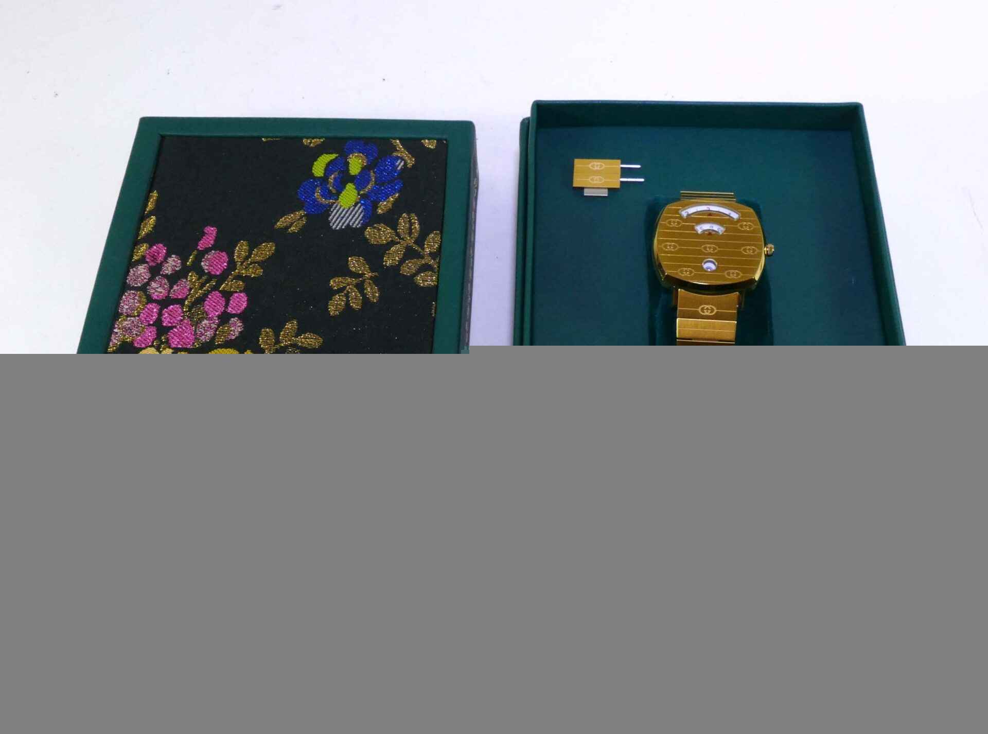 This Gucci watch is in mint condition and appears to be unworn. It comes with its original box and all original links.