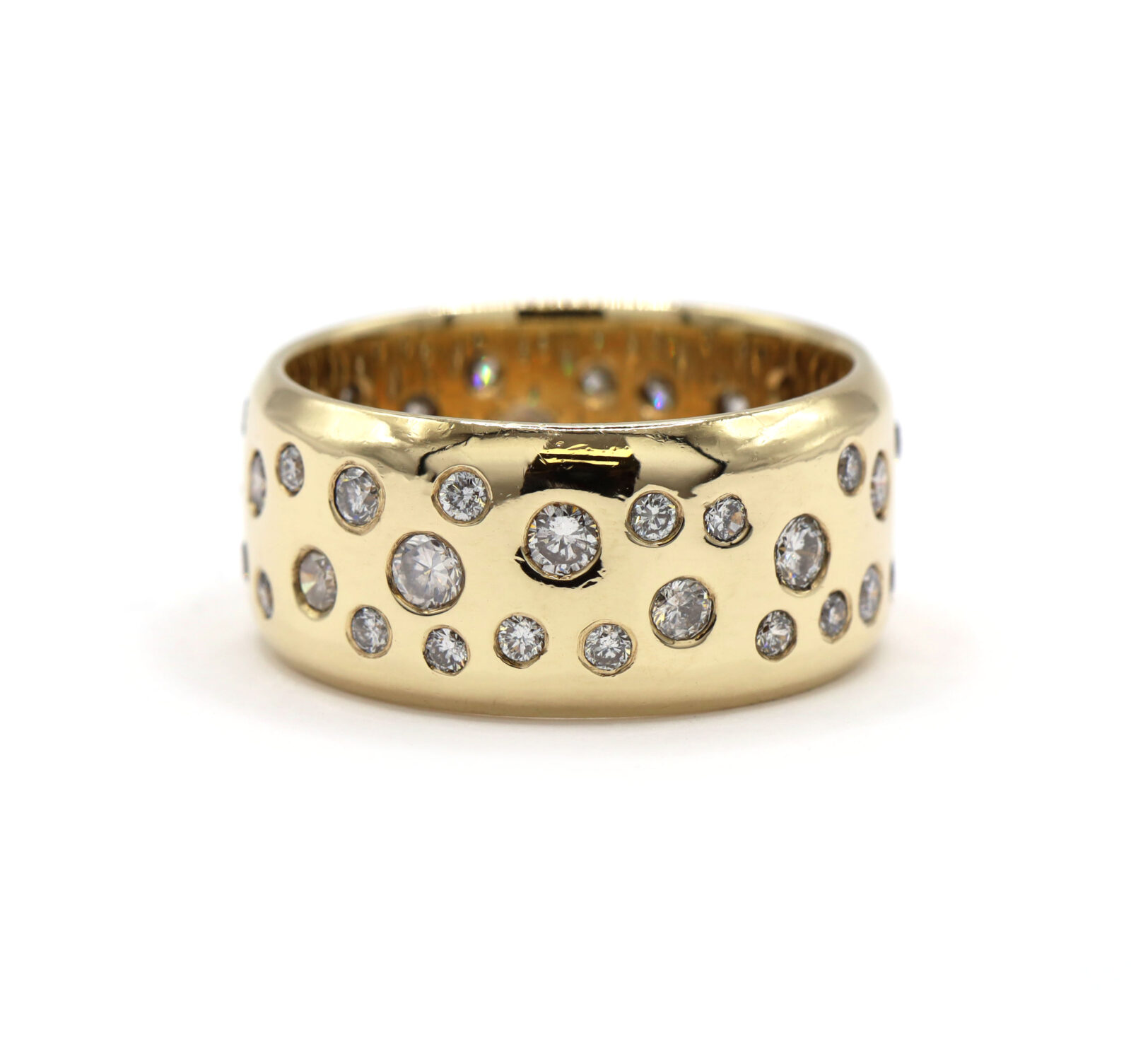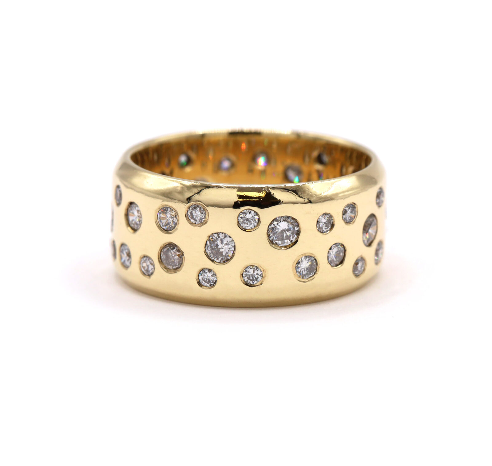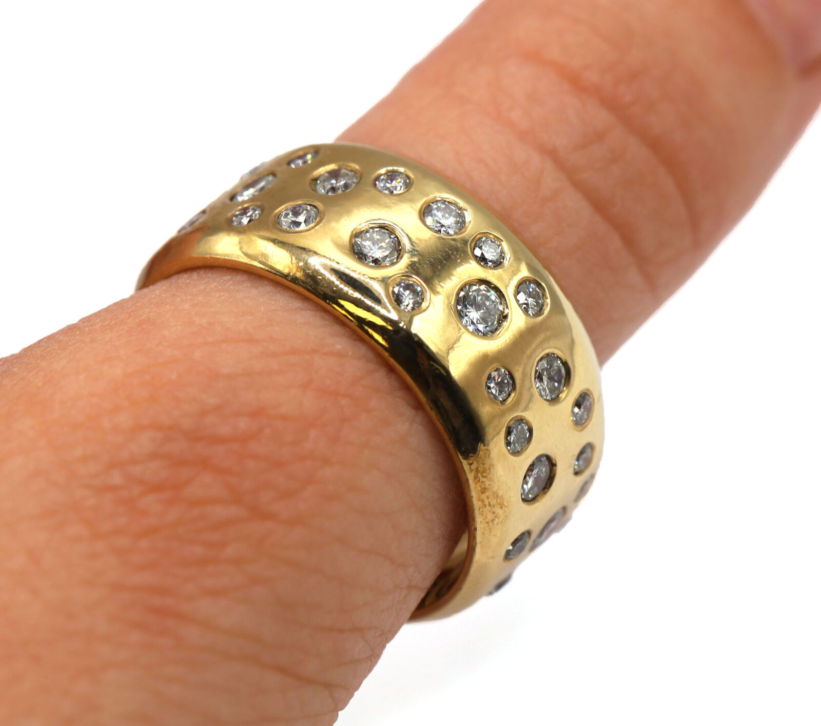 material: 10k yellow gold size: 12 stone: diamond total diamond weight: approximately 2.50 carat clarity: si1 color: g width: 11mm weight: 13.6 grams