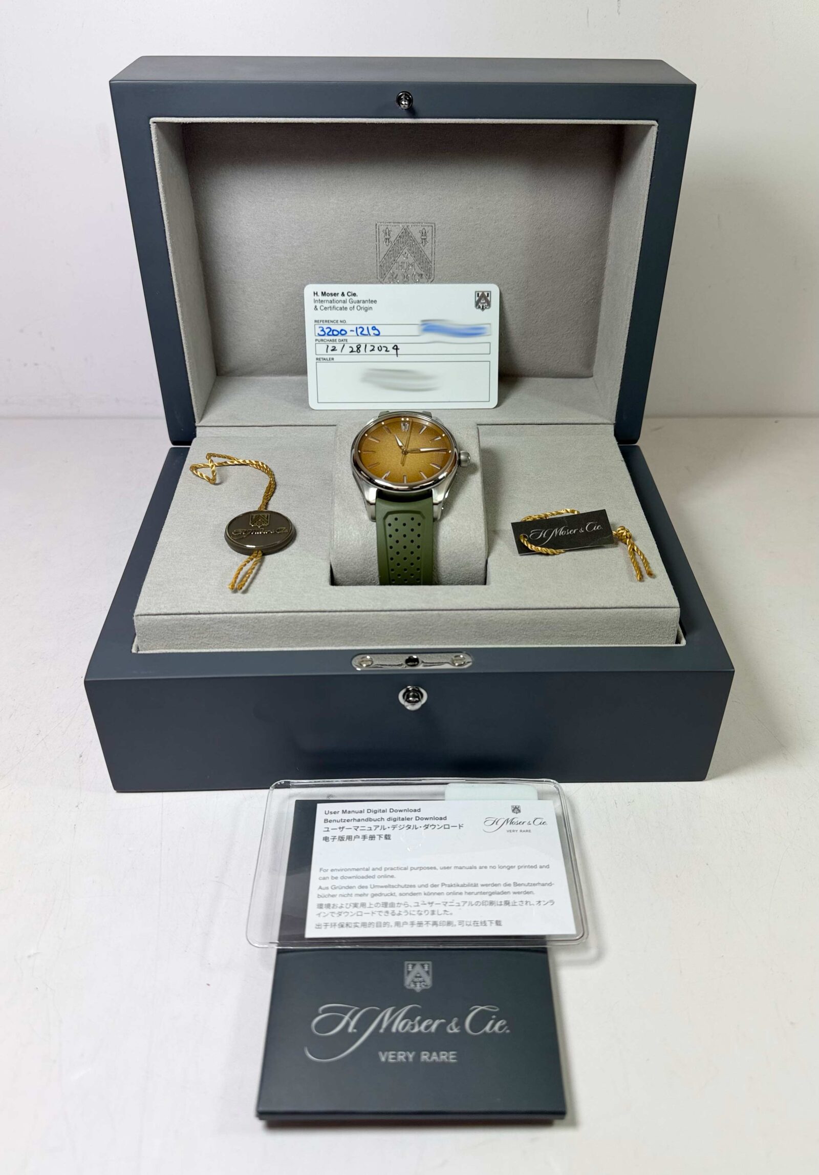 this h.moser & cie. Watch is in excellent overall condition showing some light signs of surface wear consistent with preowned watches. This comes with its box, hang tags, and warranty card dated december 28th, 2024 as shown in the pictures attached. This watch is in stock and available to ship immediately!