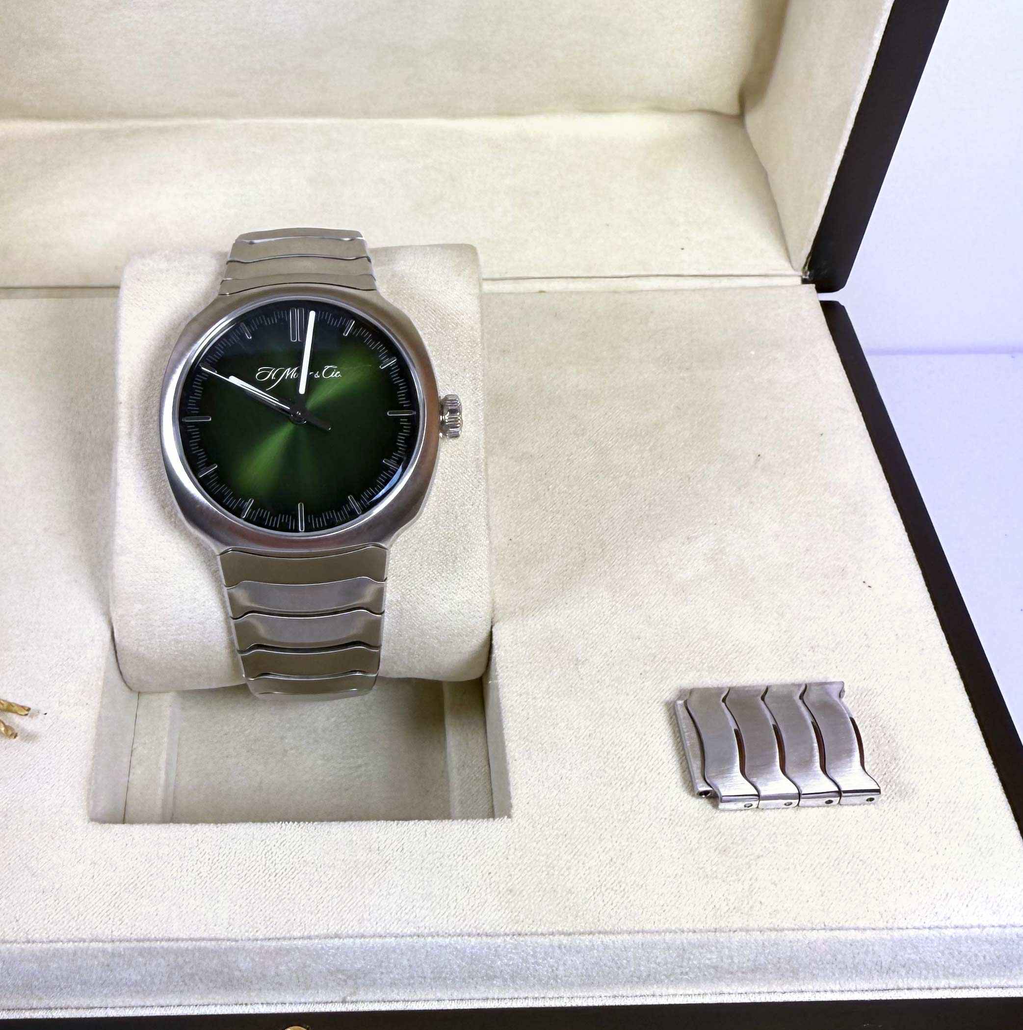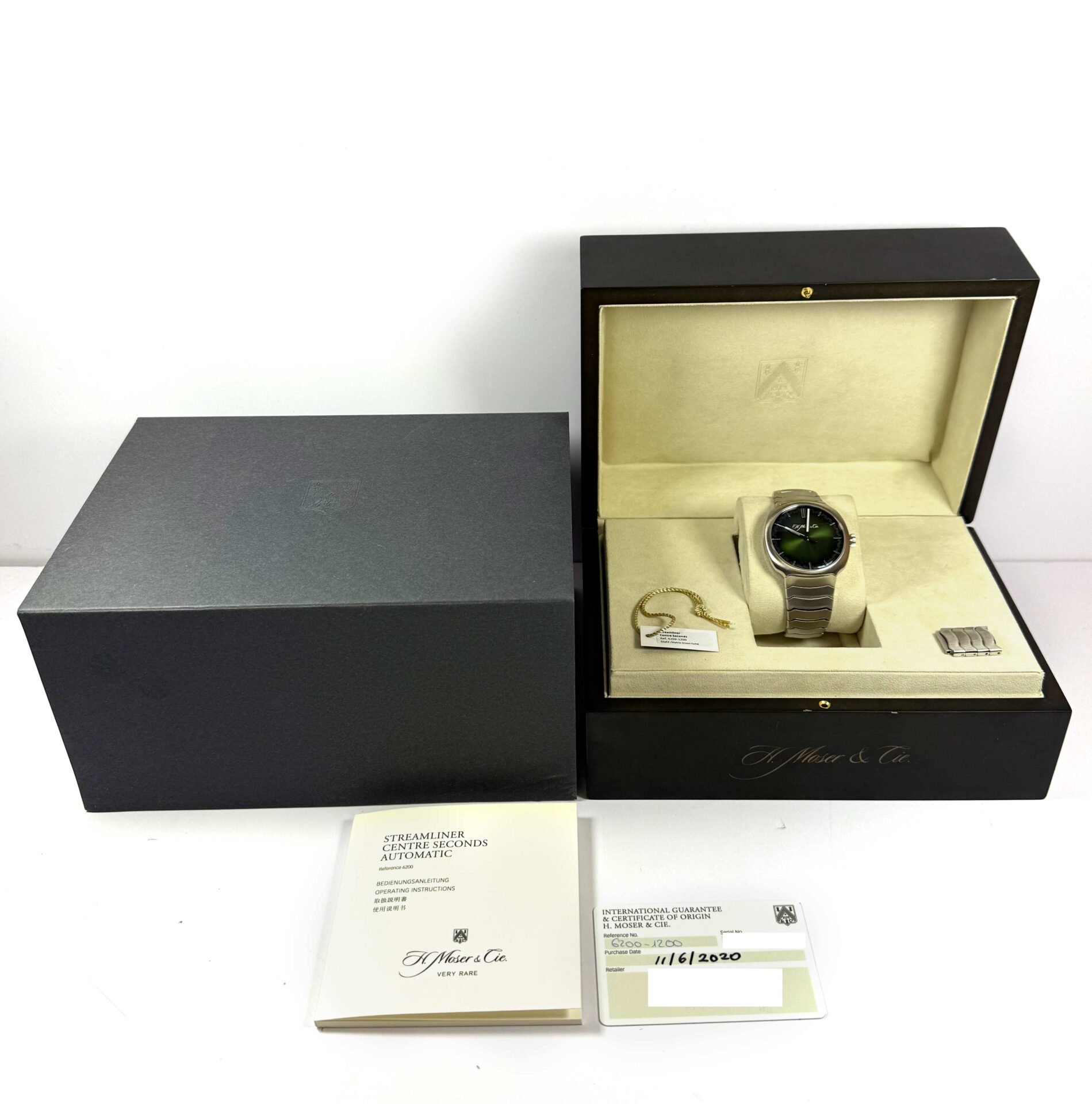 THIS H. MOSER & CIE. WATCH IS IN EXCELLENT OVERALL CONDITION AND COMES WITH ITS BOX, BOOKLET, SPARE LINKS, HANG TAG, AND WARRANTY CARD DATED NOVEMBER 6TH, 2020 AS SHOWN IN THE PICTURES ATTACHED. THIS WATCH IS IN STOCK AND AVAILABLE TO SHIP IMMEDIATELY!