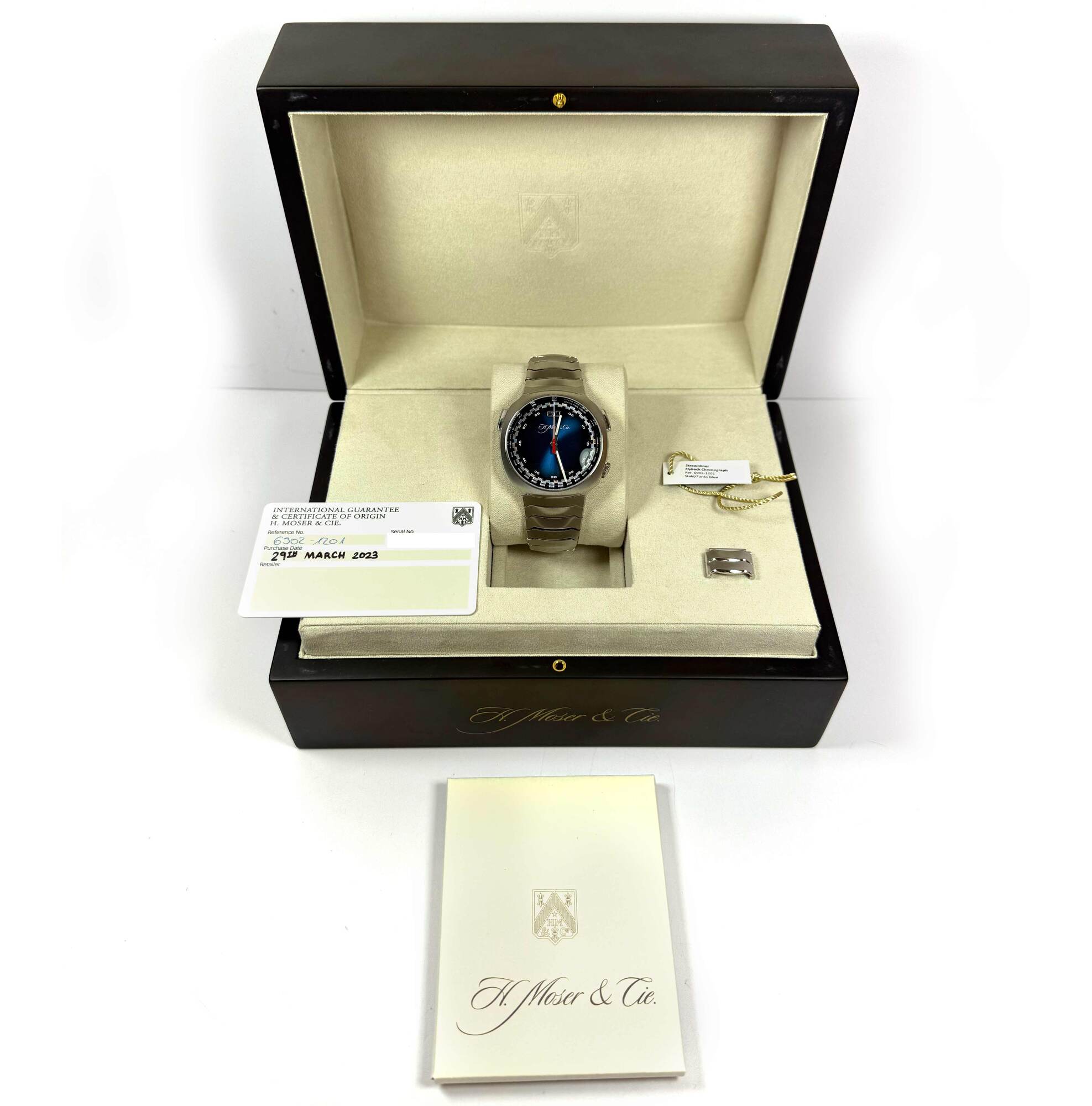 Read Morethis h. Moser & cie. Watch is in excellent condition and comes with its box, hang tag, spare links, and warranty card dated march 29th, 2023. This watch features a 42mm stainless steel case that surrounds a blue dial and comes on a steel bracelet as shown in the pictures attached. The functions include hours, minutes and flyback chronograph. This watch is in stock and available to ship immediately!