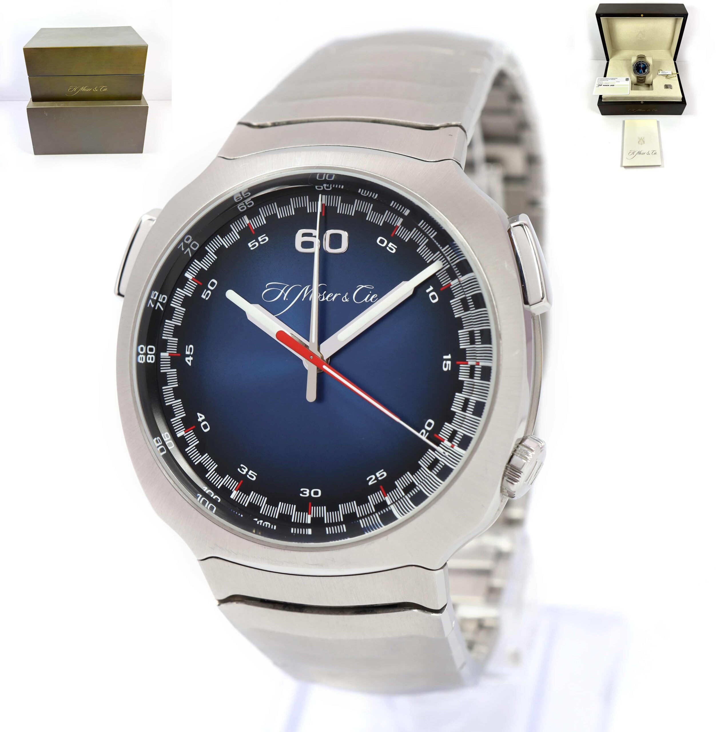 THIS H. MOSER & CIE. WATCH IS IN EXCELLENT CONDITION AND COMES WITH ITS BOX, HANG TAG, SPARE LINKS, AND WARRANTY CARD DATED MARCH 29TH, 2023. THIS WATCH FEATURES A 42MM STAINLESS STEEL CASE THAT SURROUNDS A BLUE DIAL AND COMES ON A STEEL BRACELET AS SHO...