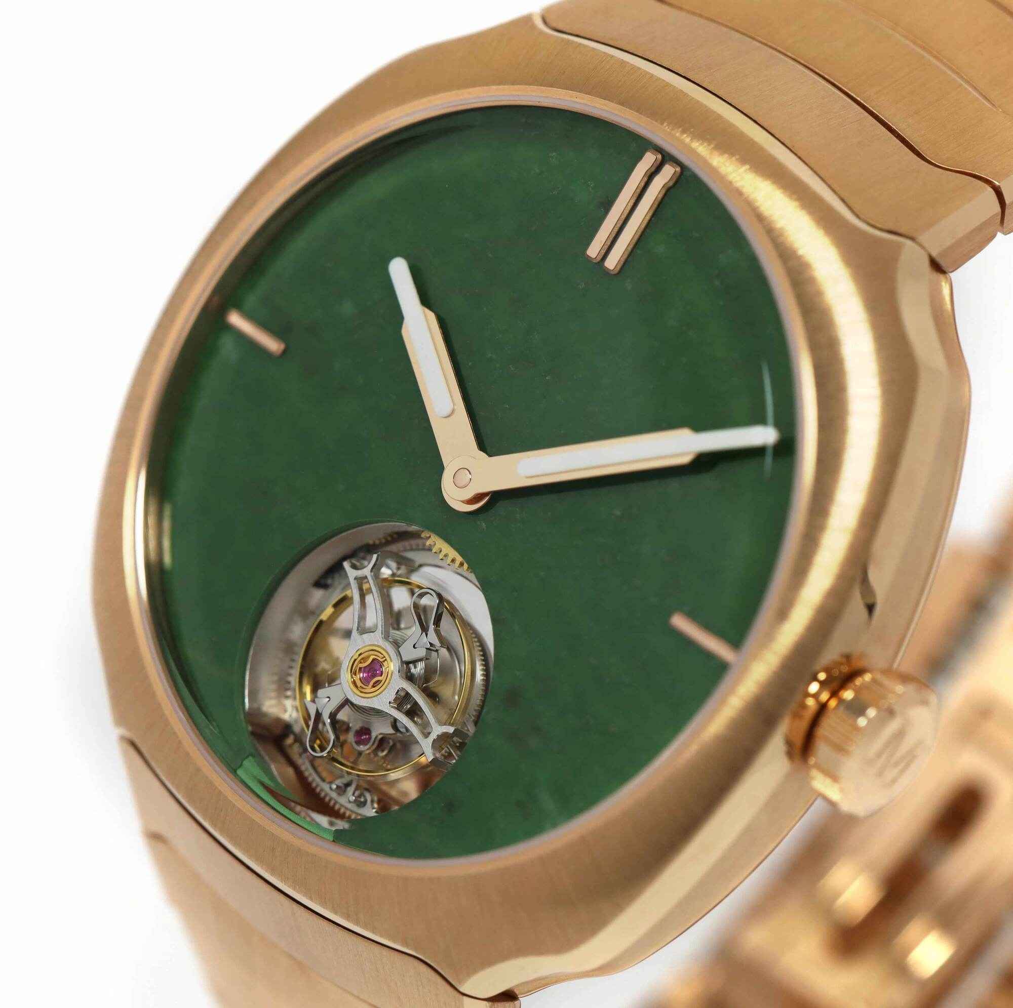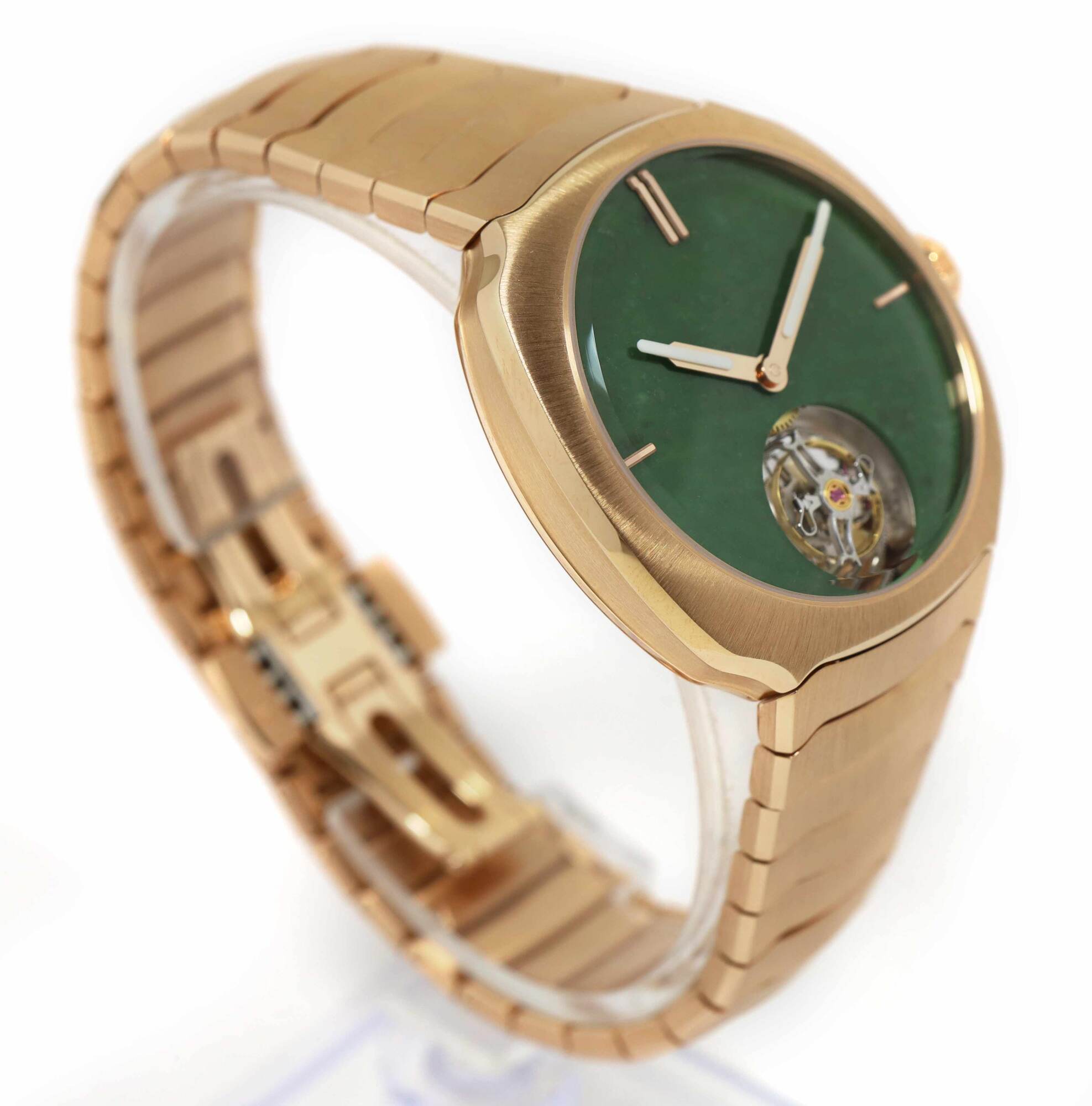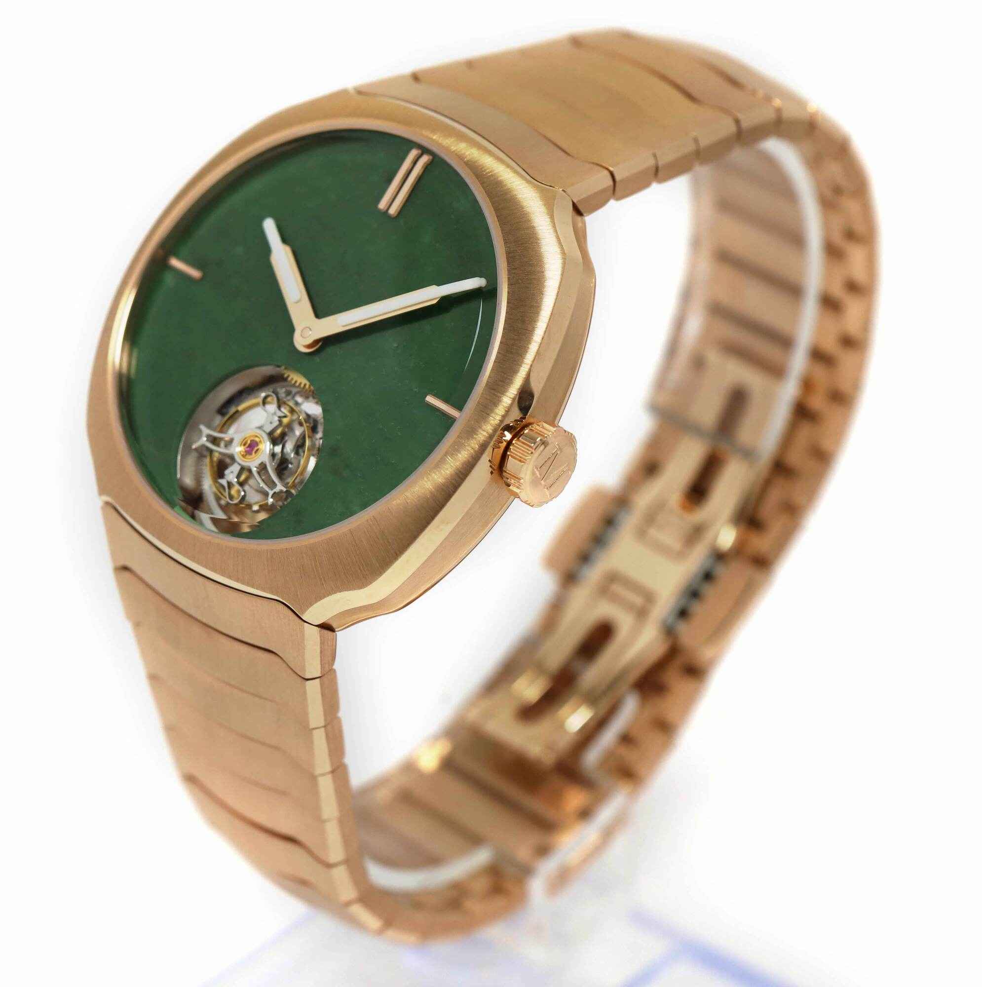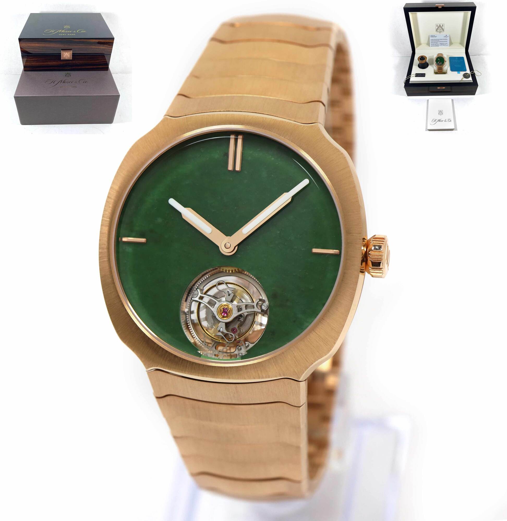 Read Morethis h. Moser & cie is new and comes with its box, both hang tags, h. Moser branded loupe, and warranty card as shown in the pictures attached. This watch is limited to 100 pieces total for this reference and features a 40mm rose gold case that surrounds a green jade dial with a tourbillon and comes on a rose gold bracelet. This watch is in stock and available to ship immediately! the msrp for this watch is $120k, here is a chance to pick it up at an amazing discount!