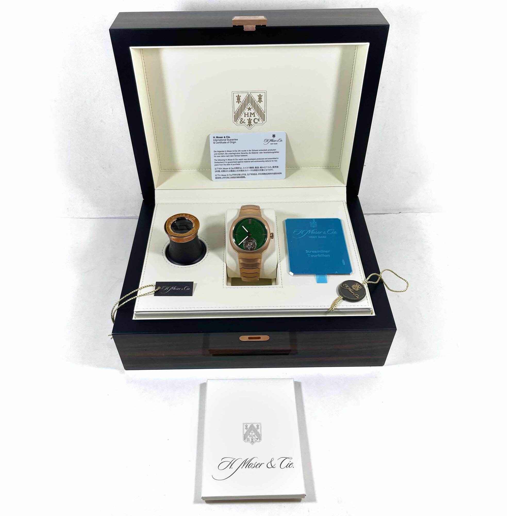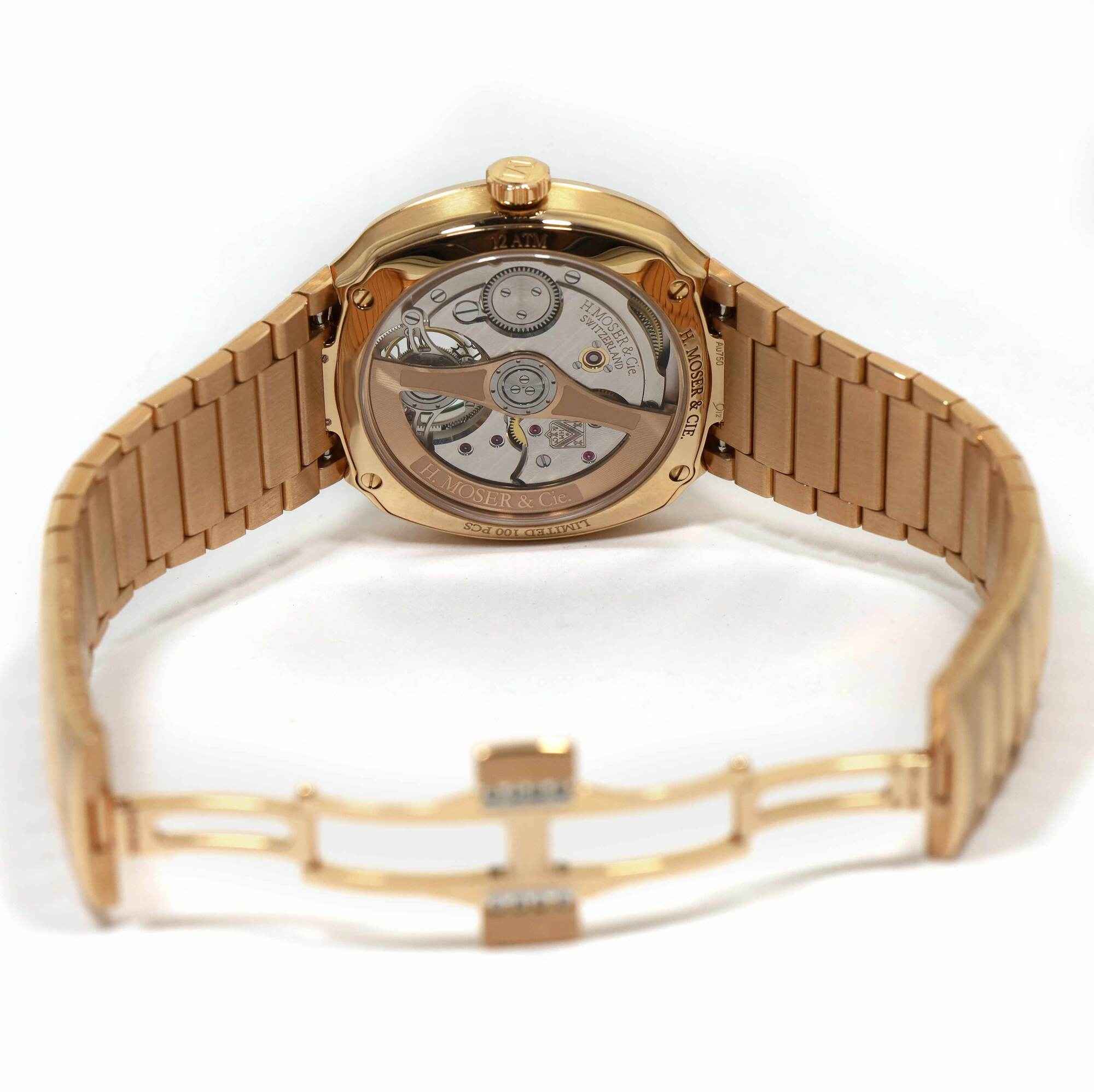 THIS H. MOSER & CIE IS NEW AND COMES WITH ITS BOX, BOTH HANG TAGS, H. MOSER BRANDED LOUPE, AND WARRANTY CARD AS SHOWN IN THE PICTURES ATTACHED. THIS WATCH IS LIMITED TO 100 PIECES TOTAL FOR THIS REFERENCE AND FEATURES A 40MM ROSE GOLD CASE THAT SURROUND...