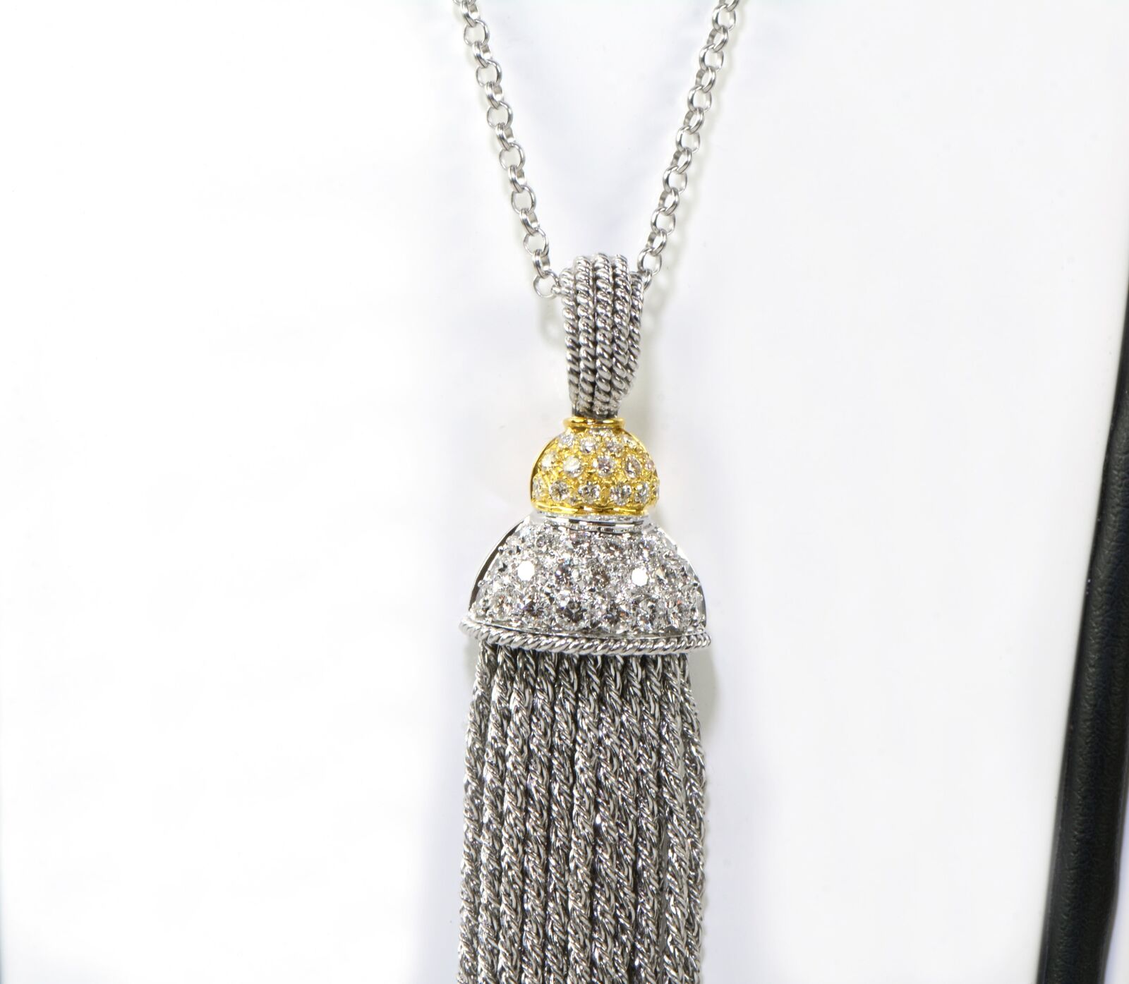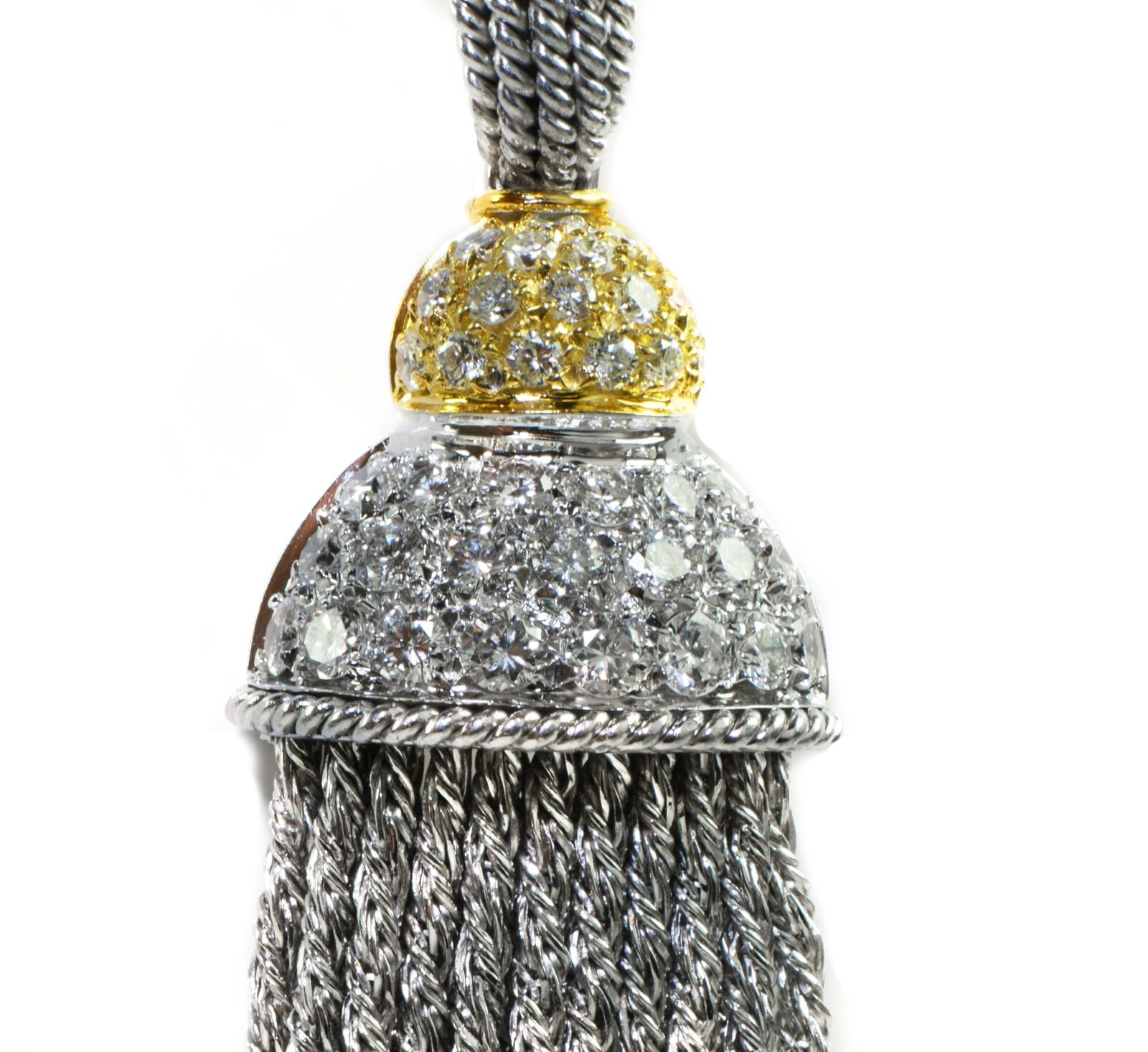 this beautiful and unique pendant was crafted by an italian designer, harpo’s. It is set in sold 18k white and yellow gold, and features 19 strands of 18k white gold that are extremely flexible and move freely. It measures 3.5 inches from top to bottom, and 5/8 inch width. The top has a clasp, allowing it to be easily taken on and off of a necklace. The diamonds are all vs clarity, colorless, perfectly matching and very shiny. This item weighs 15 grams.