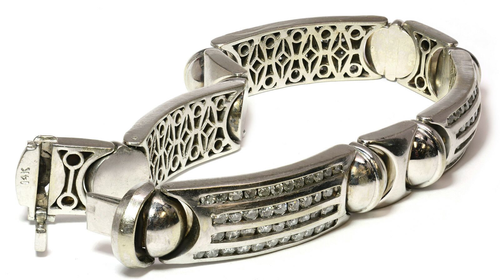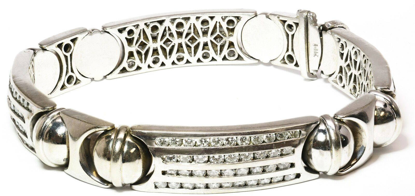 bracelet approximate diamond color:g bracelet approximate diamond clarity:si bracelet approximate diamond carat weight:5.55 bracelet clasp:box clasp with hidden safety bracelet length (inches):8 bracelet stone type:diamond bracelet width:1/2 inch condition:new gender:men’s jewelry brand:fine jewelry jewelry type:bracelet weight (grams):69.12 material:14k white gold