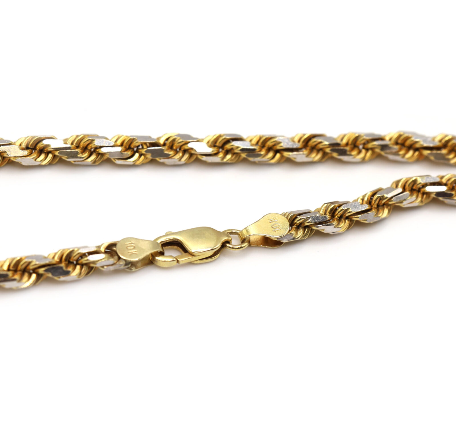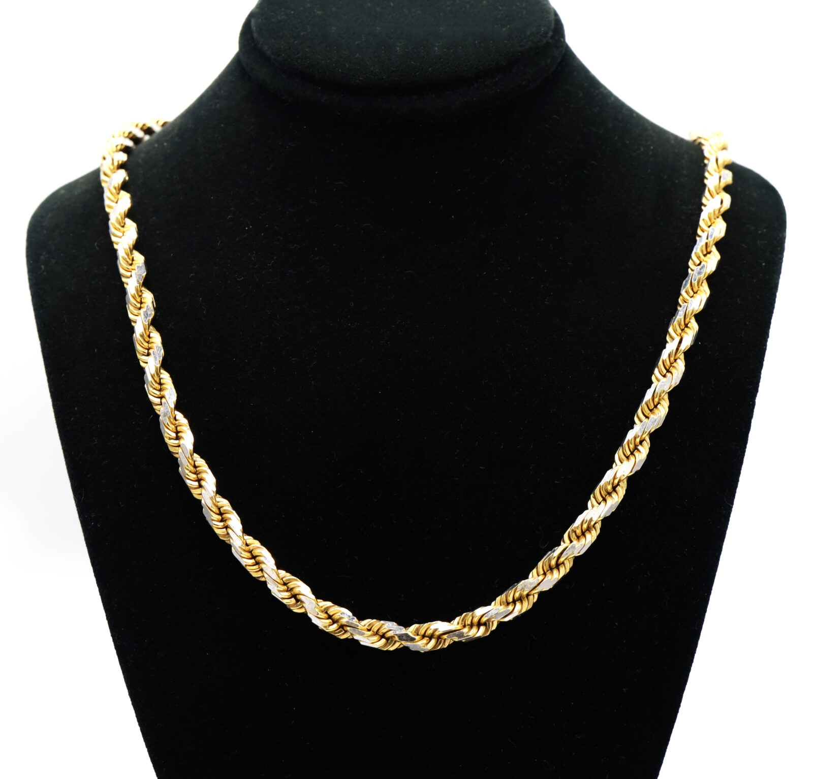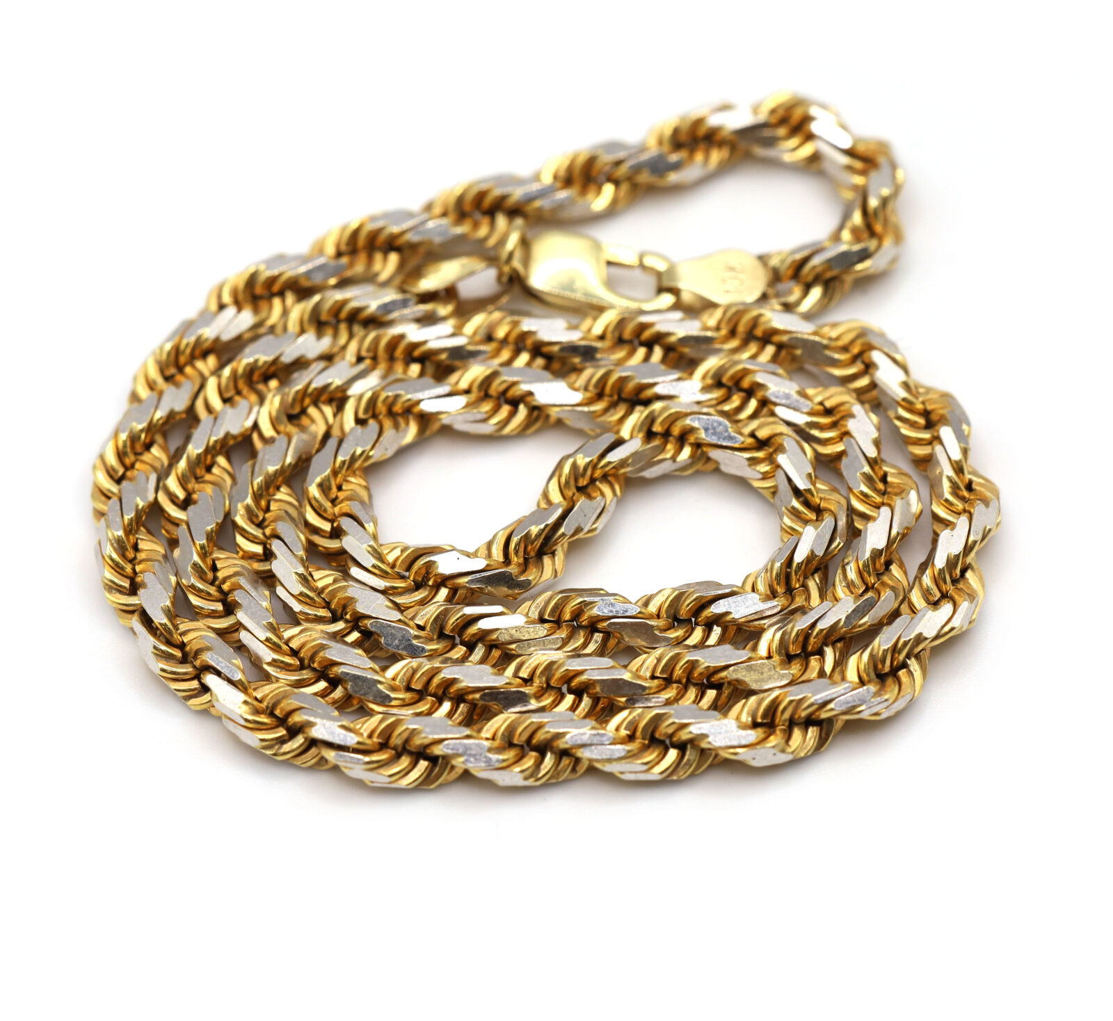 Metal: 10k Yellow & White Gold Type: Rope Link Weight: 41.8 Grams Length: 19.25 Inches Width: 5mm Clasp Type: Lobster