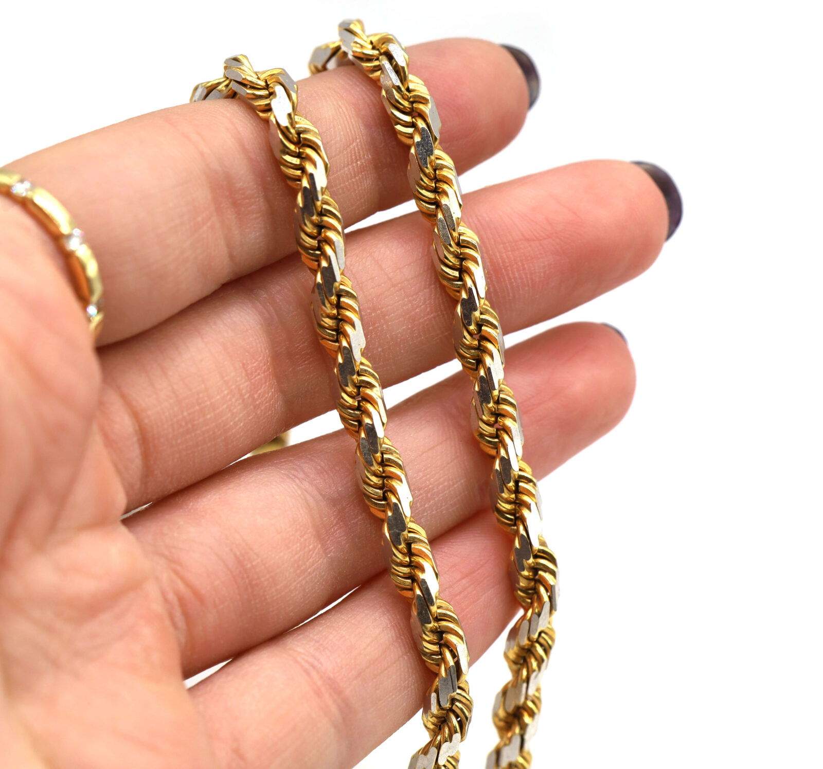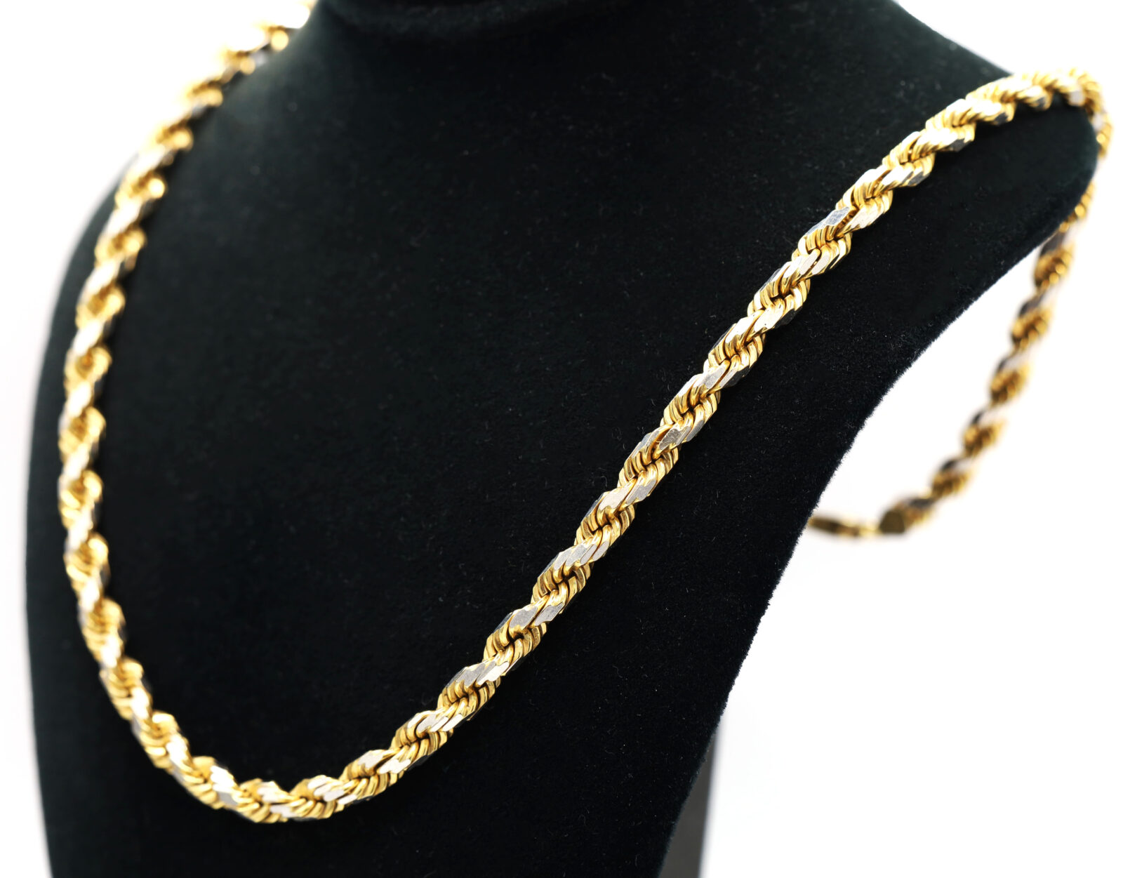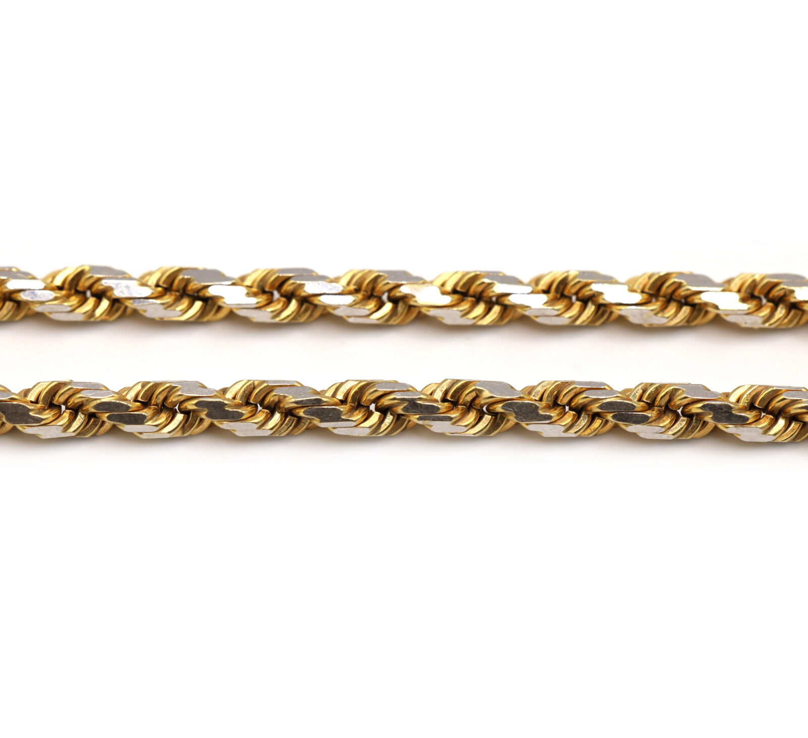 Metal: 10k Yellow & White Gold Type: Rope Link Weight: 41.8 Grams Length: 19.25 Inches Width: 5mm Clasp Type: Lobster