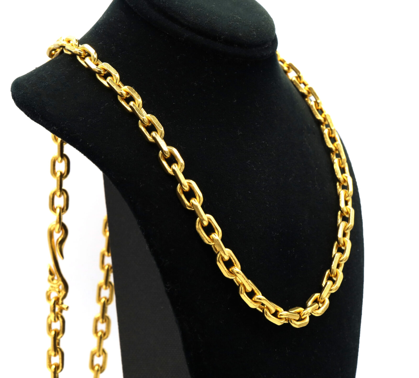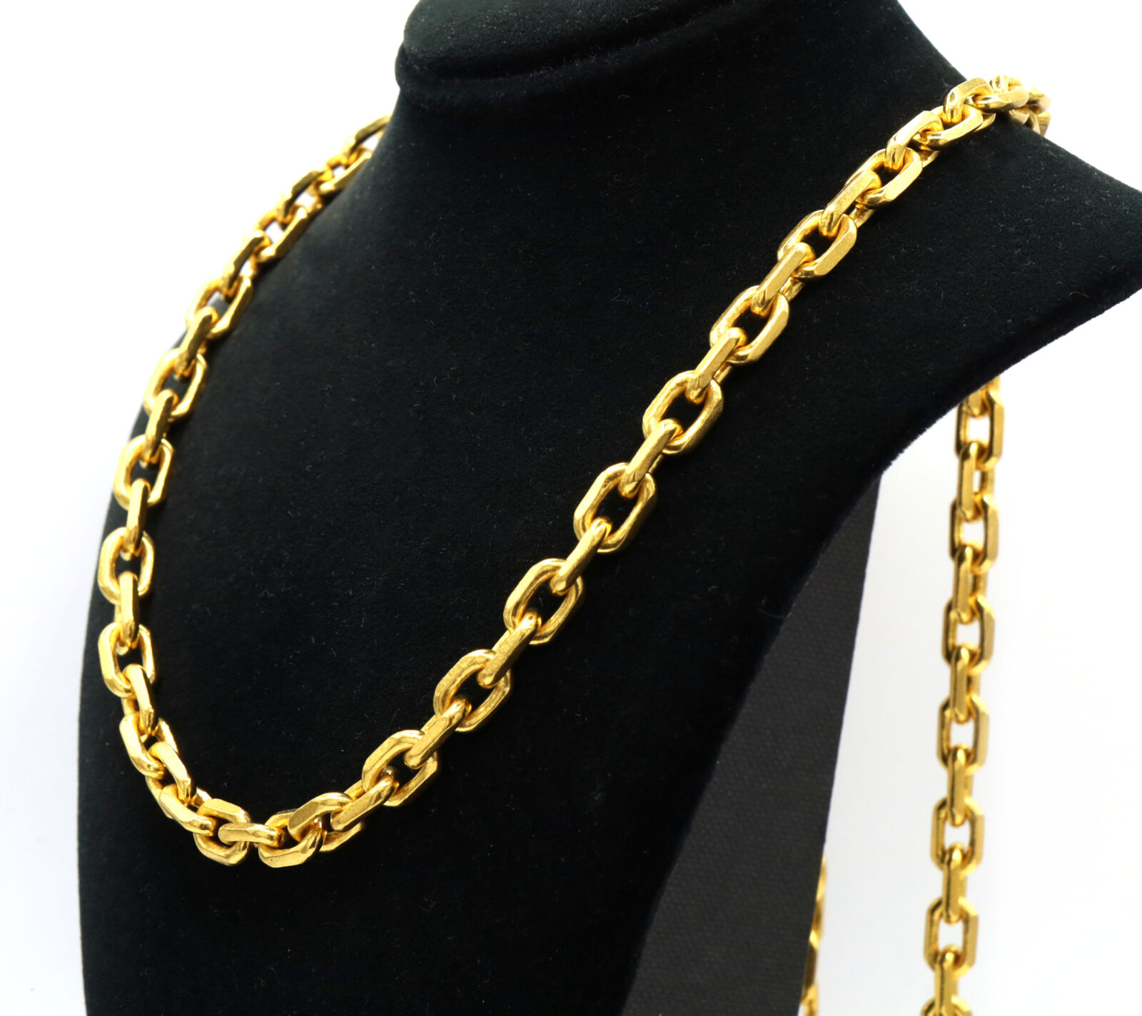 Material: 24k Yellow Gold Type: Solid Cable Link Length: 27 Inches Width: 7mm Weight: 155.8 Grams Clasp: This chain is designed to slip over the head and does not open