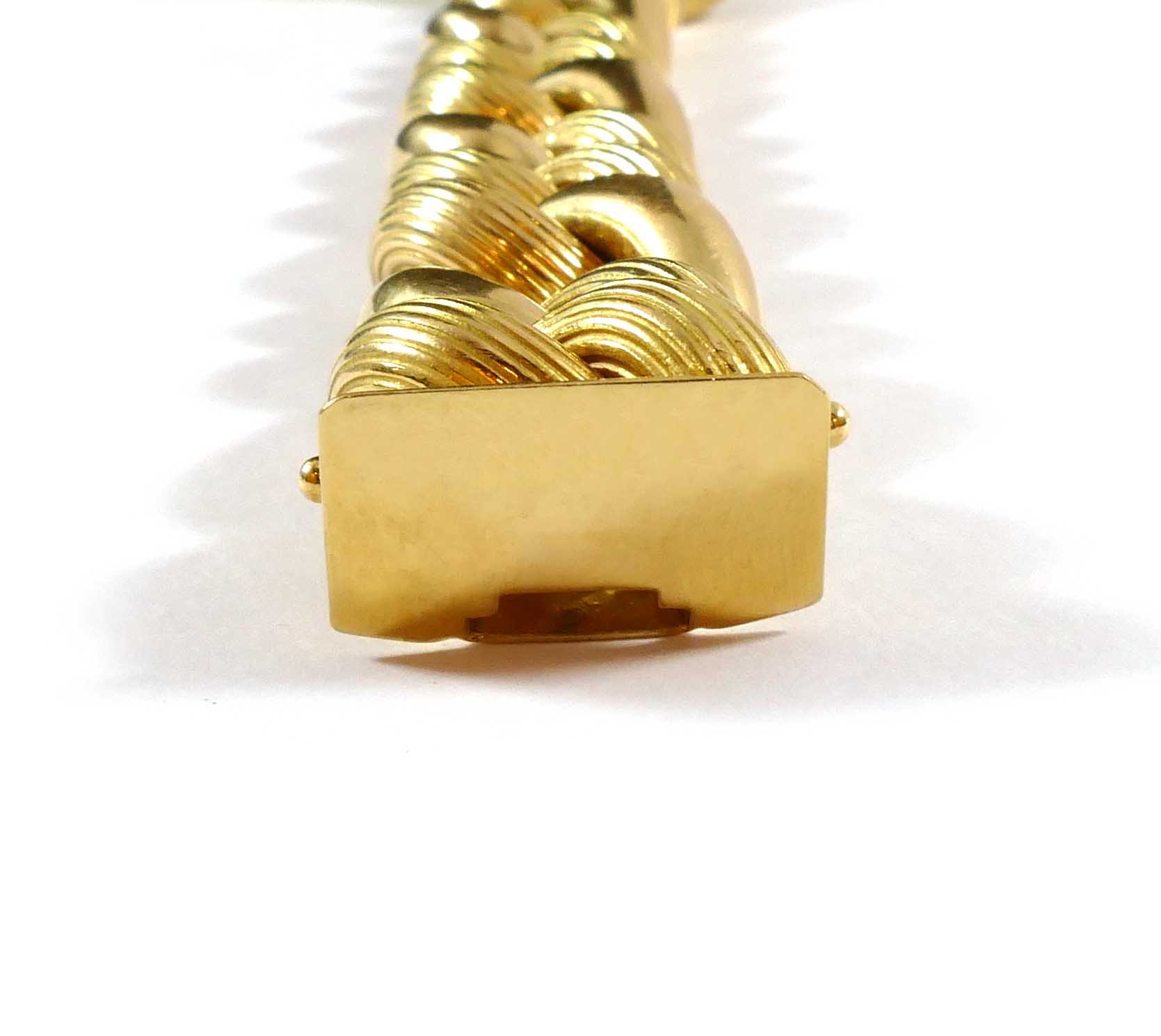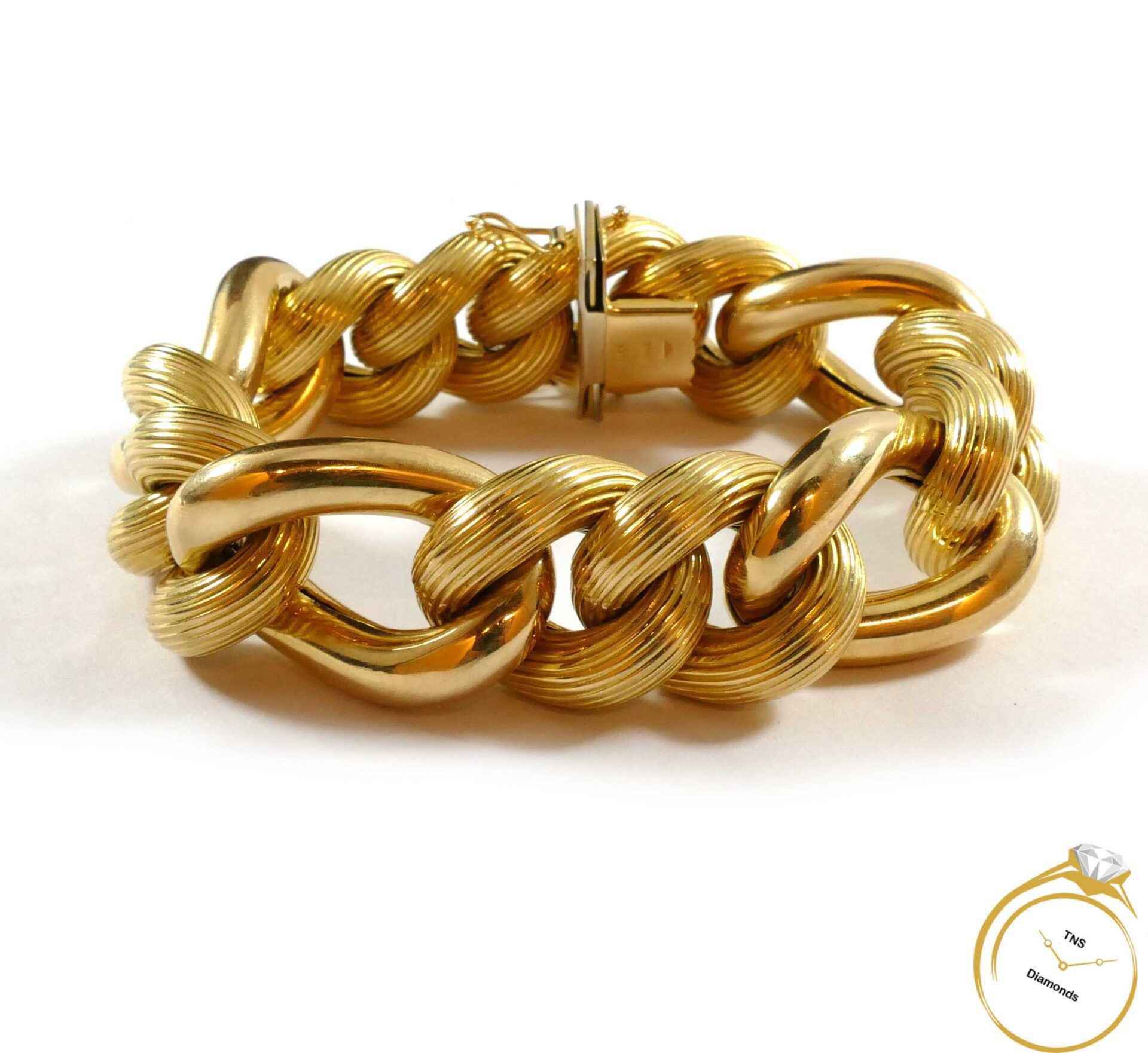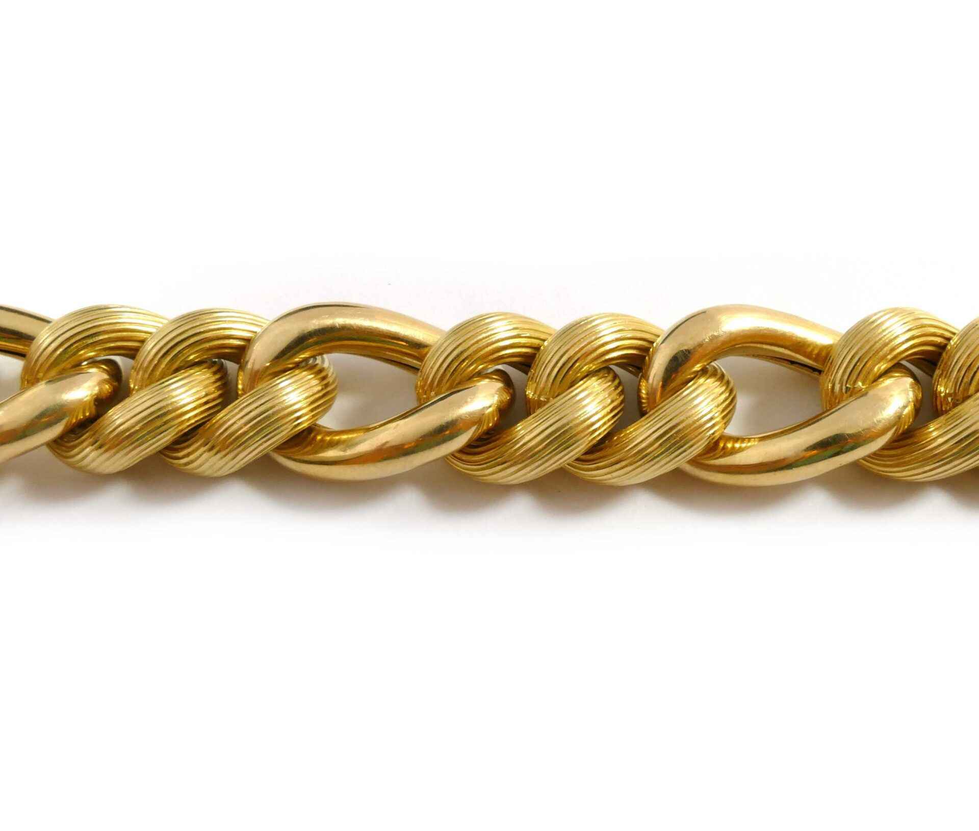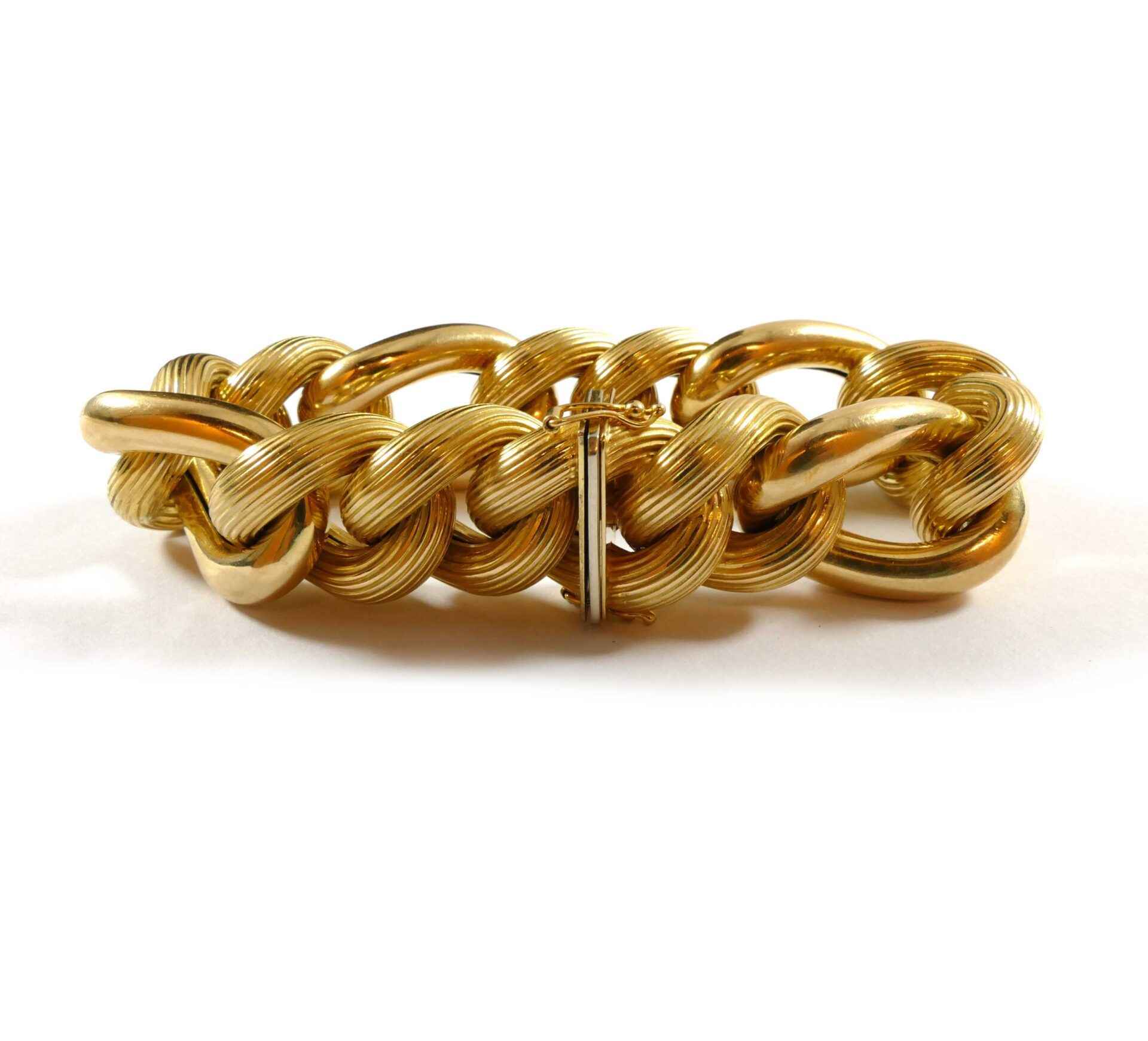 Description: This is a hollow 14k yellow gold link chain, with a big look as the bracelet is 20mm wide. The bracelet is 8 inches long, and weighs 65 grams. ...