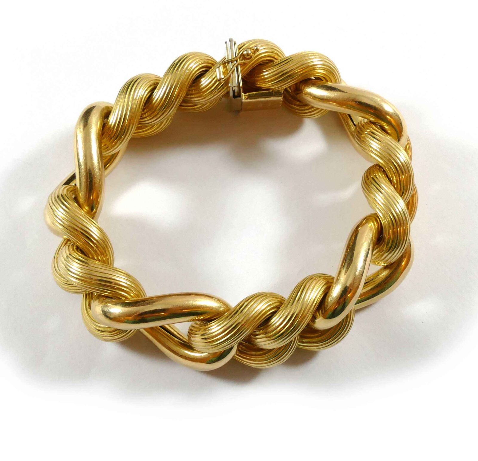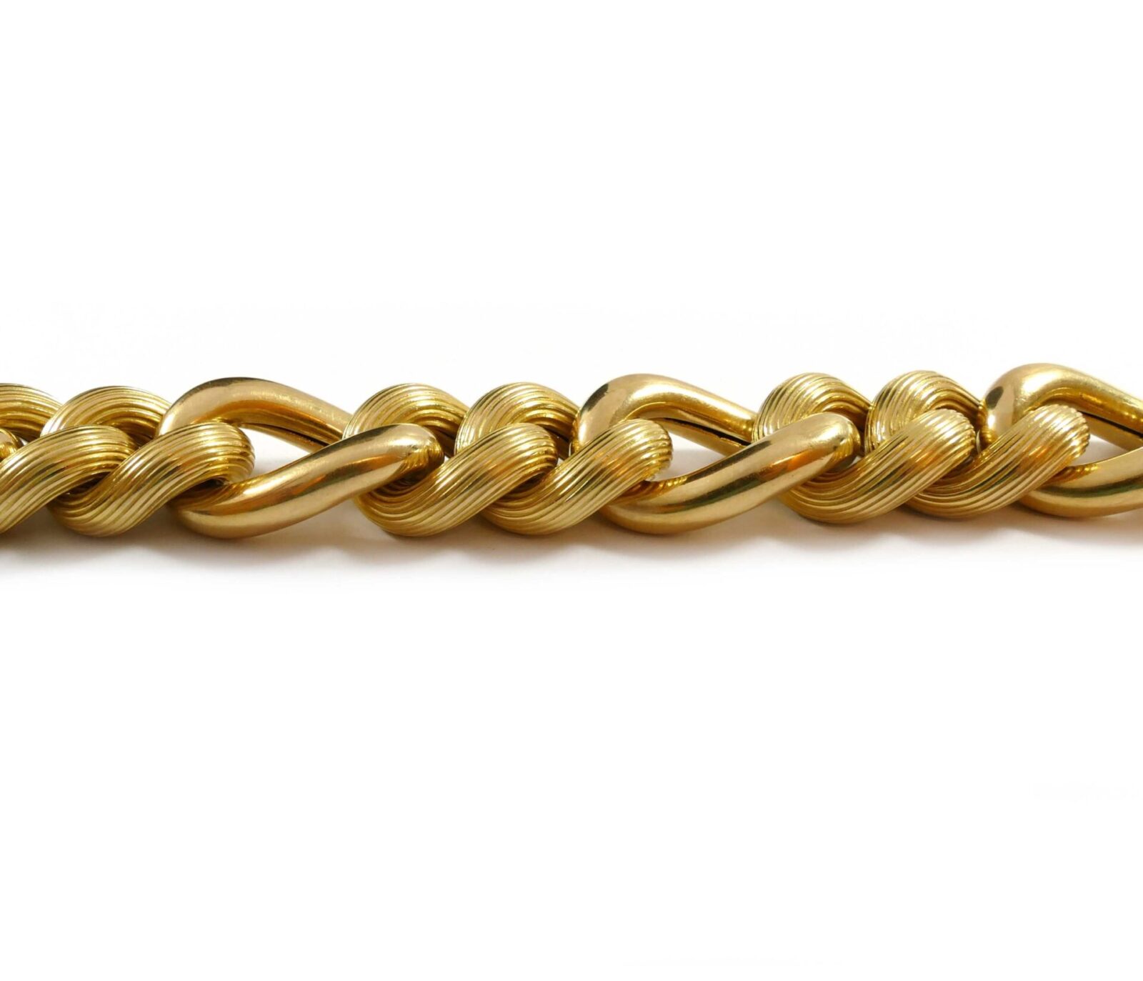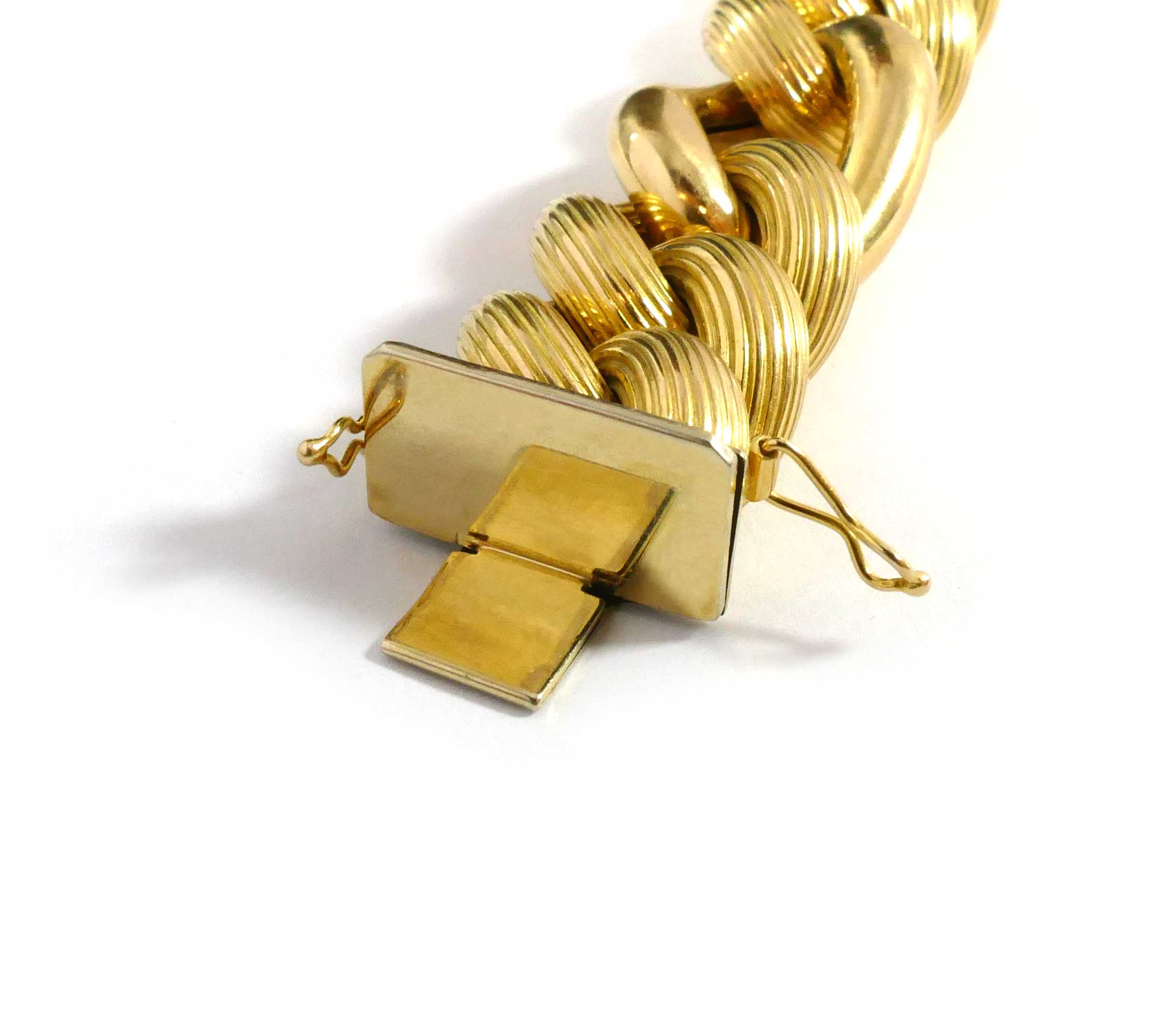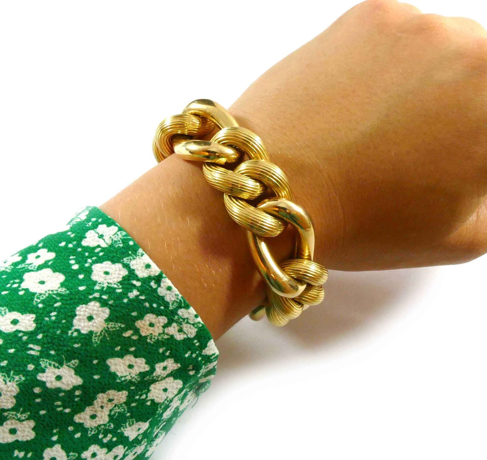 Description: This is a hollow 14k yellow gold link chain, with a big look as the bracelet is 20mm wide. The bracelet is 8 inches long, and weighs 65 grams. ...