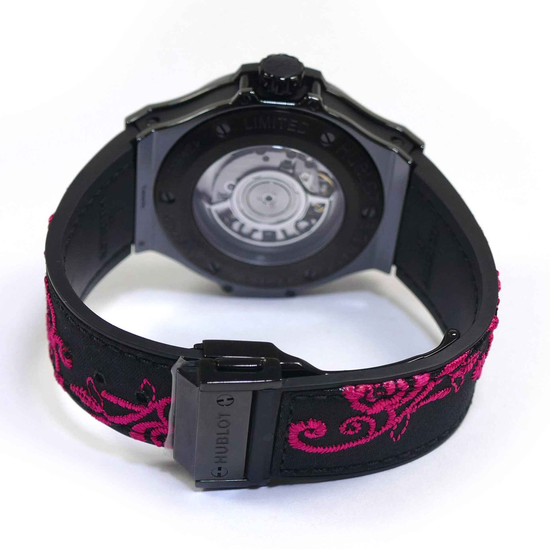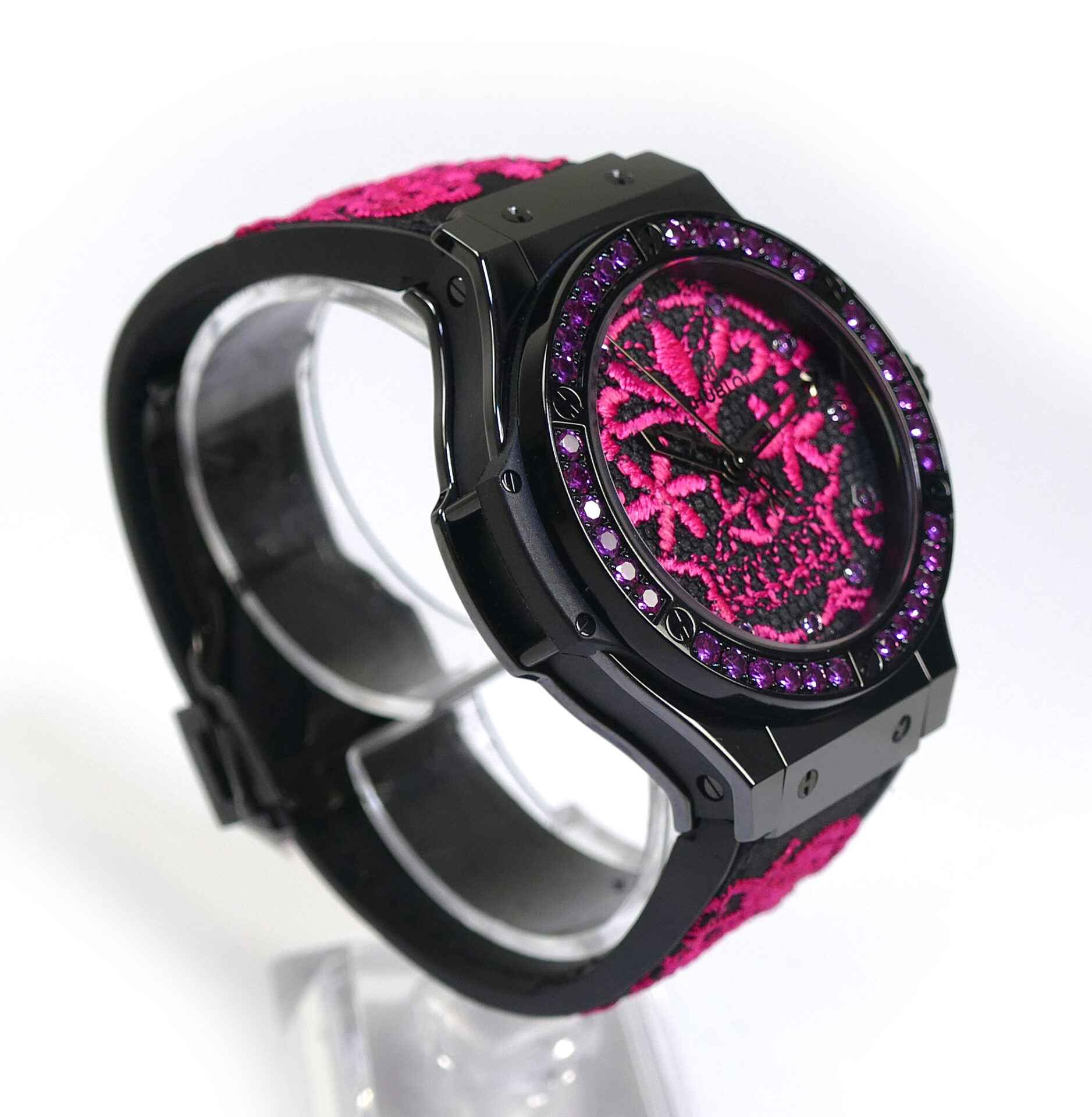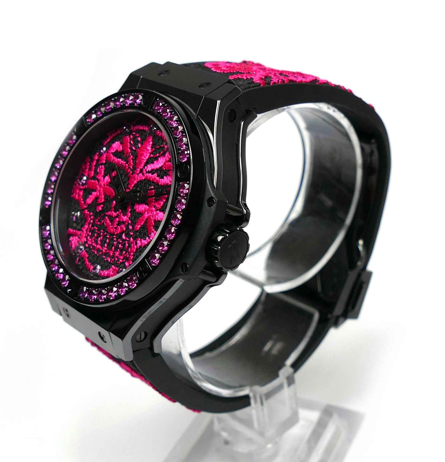 this hublot features a dial with an embroidered skull and 12 pink sapphires on the hour markers, a black-plated bezel with 36 pink sapphires, a polished black ceramic case, and a black rubber and silk strap with embroidery. this watch will fit a maximum of a 7.25 inch wrist. this watch is in stock and ready to ship immediately!