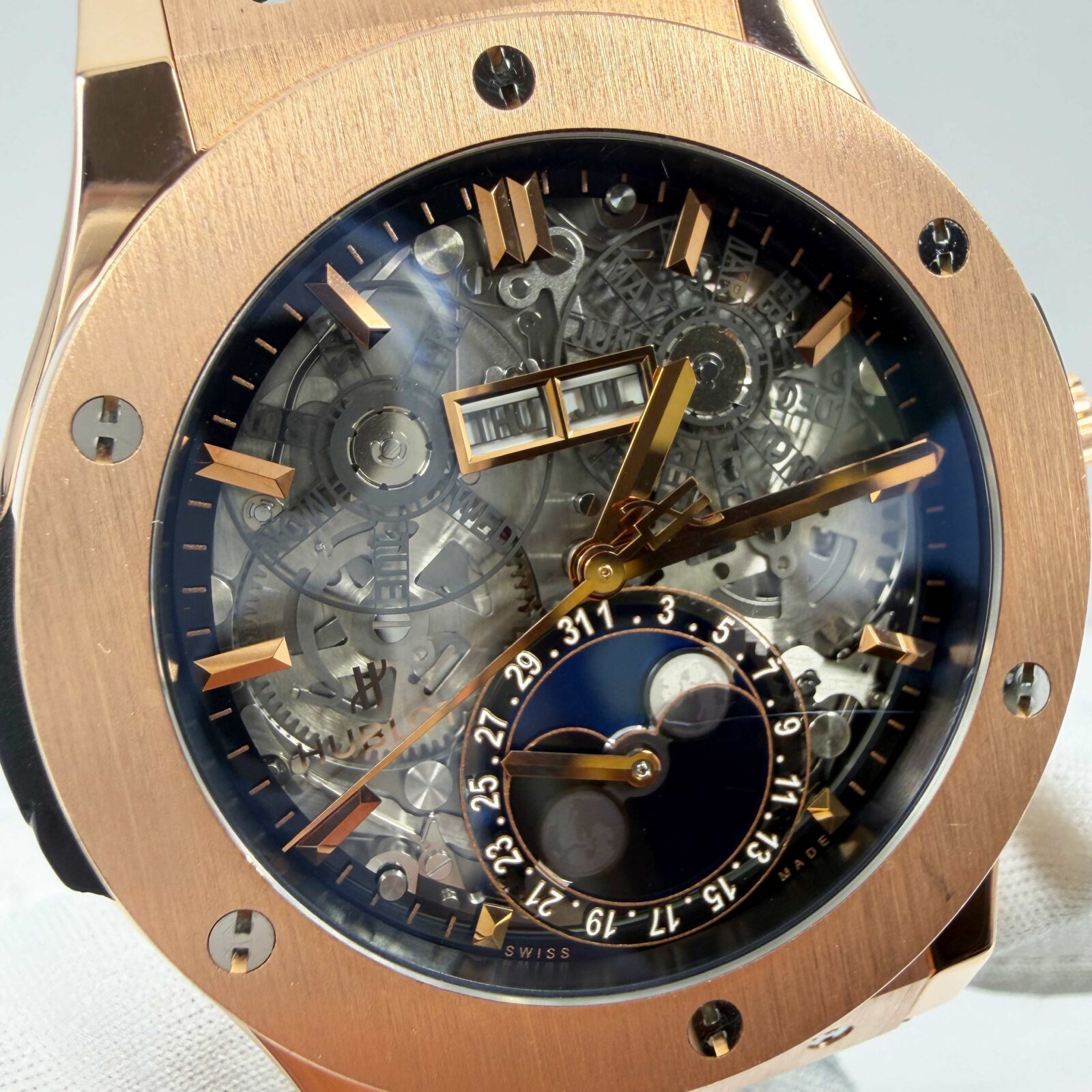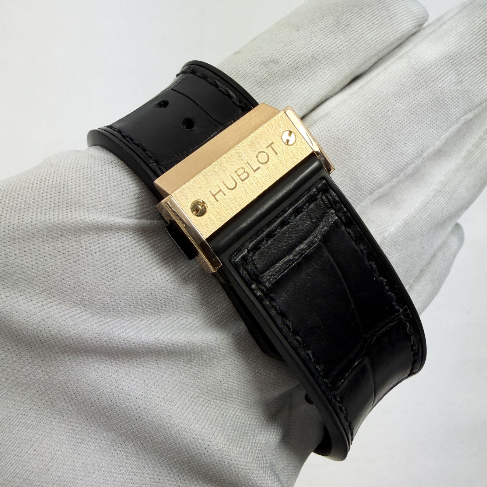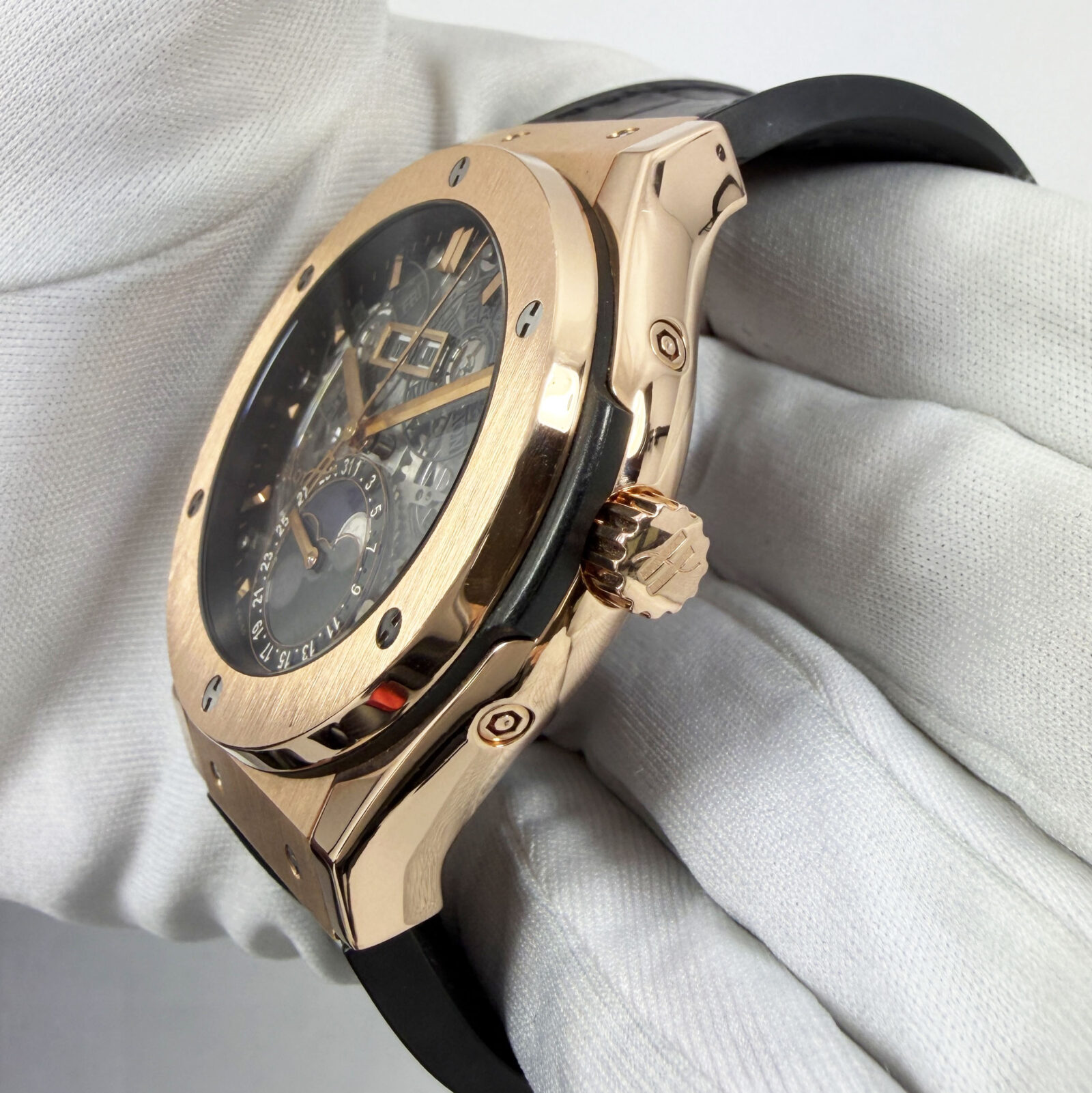 This Hublot watch comes with watch only, and there is a scratch on the bottom right of the crystal. The photos shown are of the exact watch being sold and accurately represent its condition. This watch is in stock and ready to ship immediately!