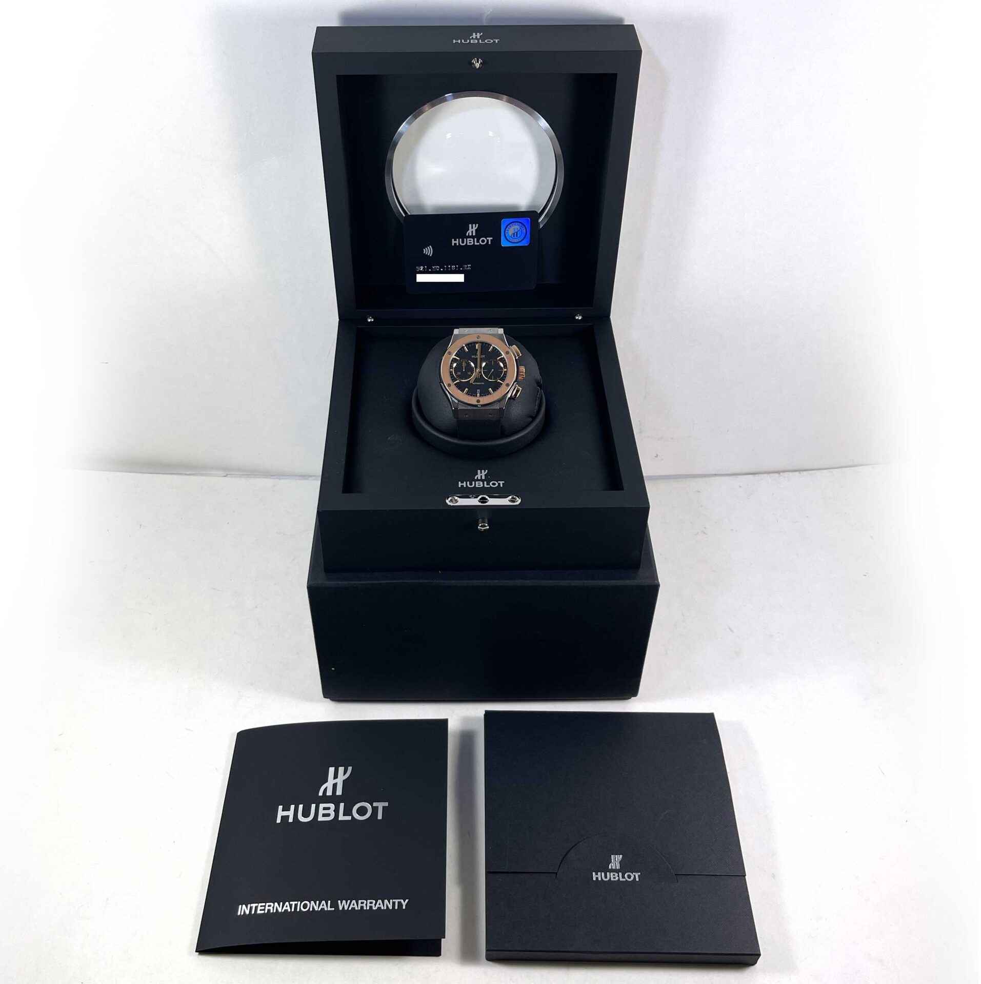 this hublot is in excellent overall condition showing some signs of wear consistent with regular use from the previous owner. This watch comes with its box and warranty card as shown in the photos attached. This hublot features a titanium case that surrounds an 18k rose gold bezel with a matte black dial and comes on a black lined rubber strap. This watch is in stock and available to ship immediately!