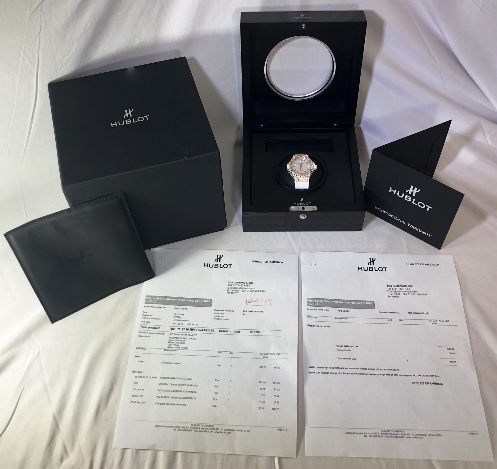 condition: pre-owned brand hublot series big bang model 361.pe.2010.rw.1604.col10 movement quartz case diameter (mm) 38mm caseback solid
