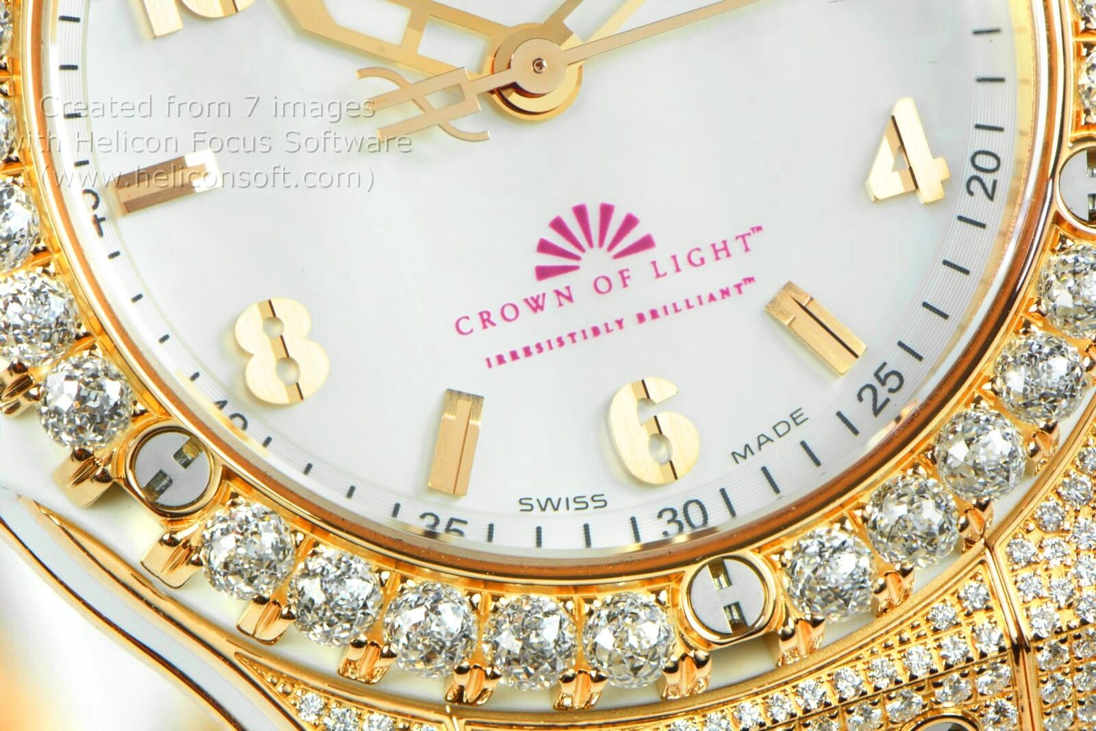 the bezel features 30 crown of light diamonds in a unique open style setting. The crown of light diamond is a unique patented diamond cut that has 90 facets compared, to a conventional round diamond which has only 58 facets. The result is a diamond with much more fire and brilliance than the conventional round diamond. You can see how the diamond sparkles in the video we posted, however it is even brighter in person!