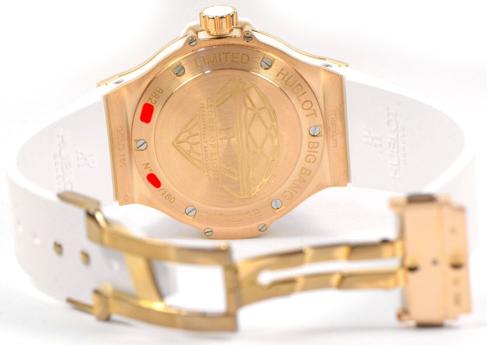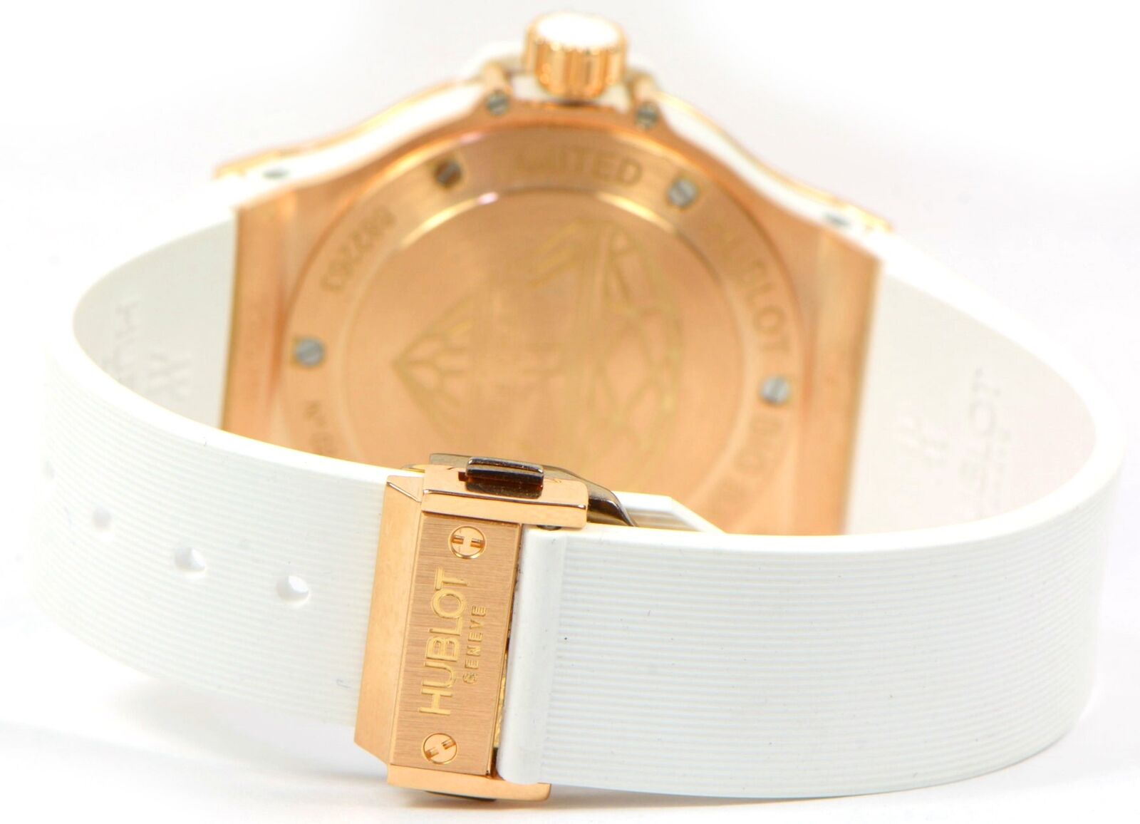 Read Moreyou are looking at a hublot crown of light big bang 38mm quartz watch. There were only 180 of this model produced. All of the diamonds are factory set and 100% original. This watch just came back from the hublot service center where it received a full service and brand new strap. The watch is back to brand new condition! it comes with a special, high end hublot mahogany wooden box, and the service papers.