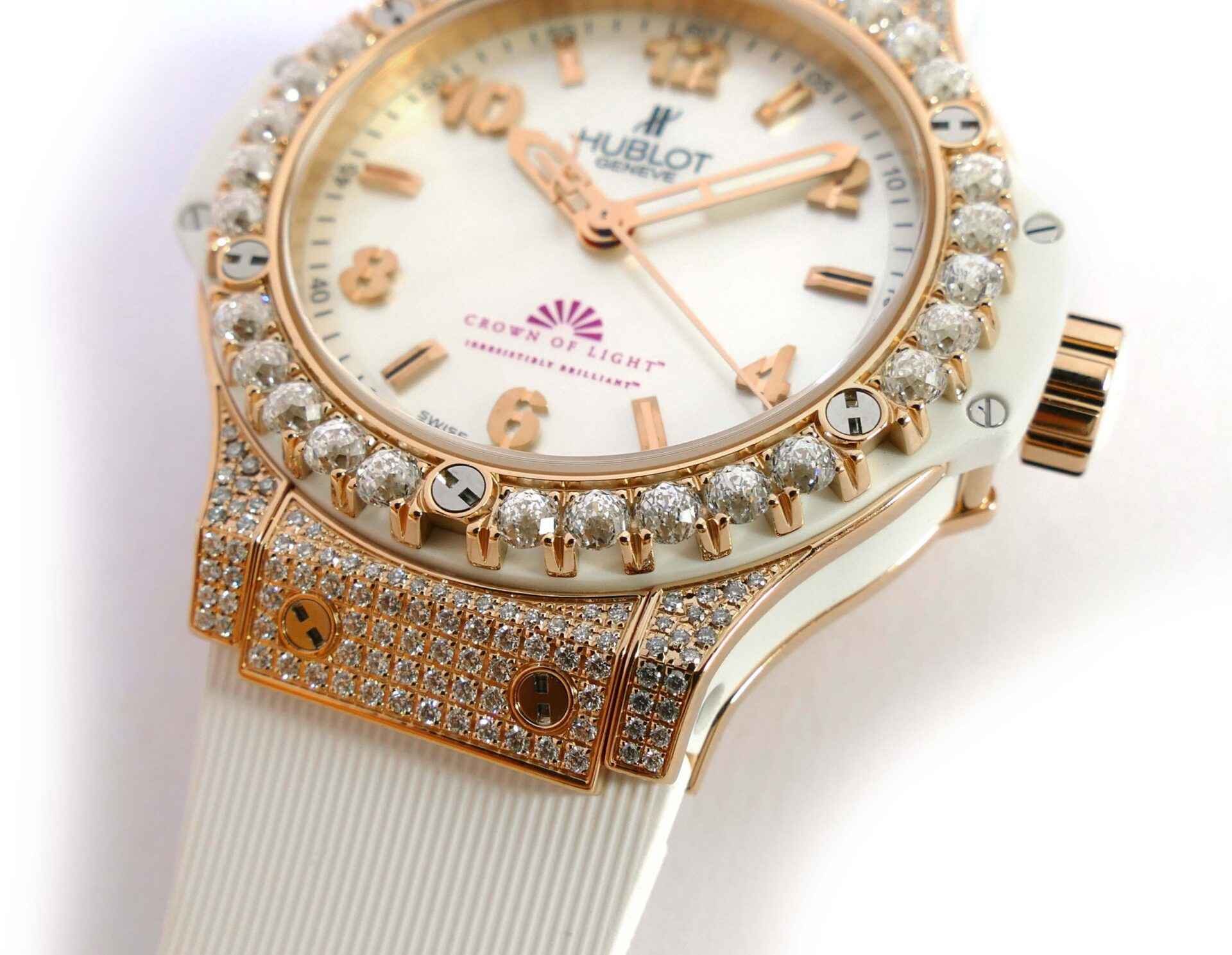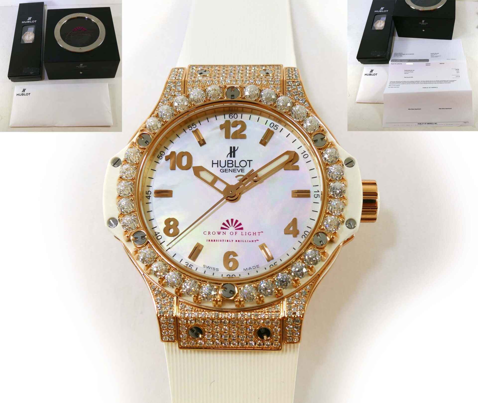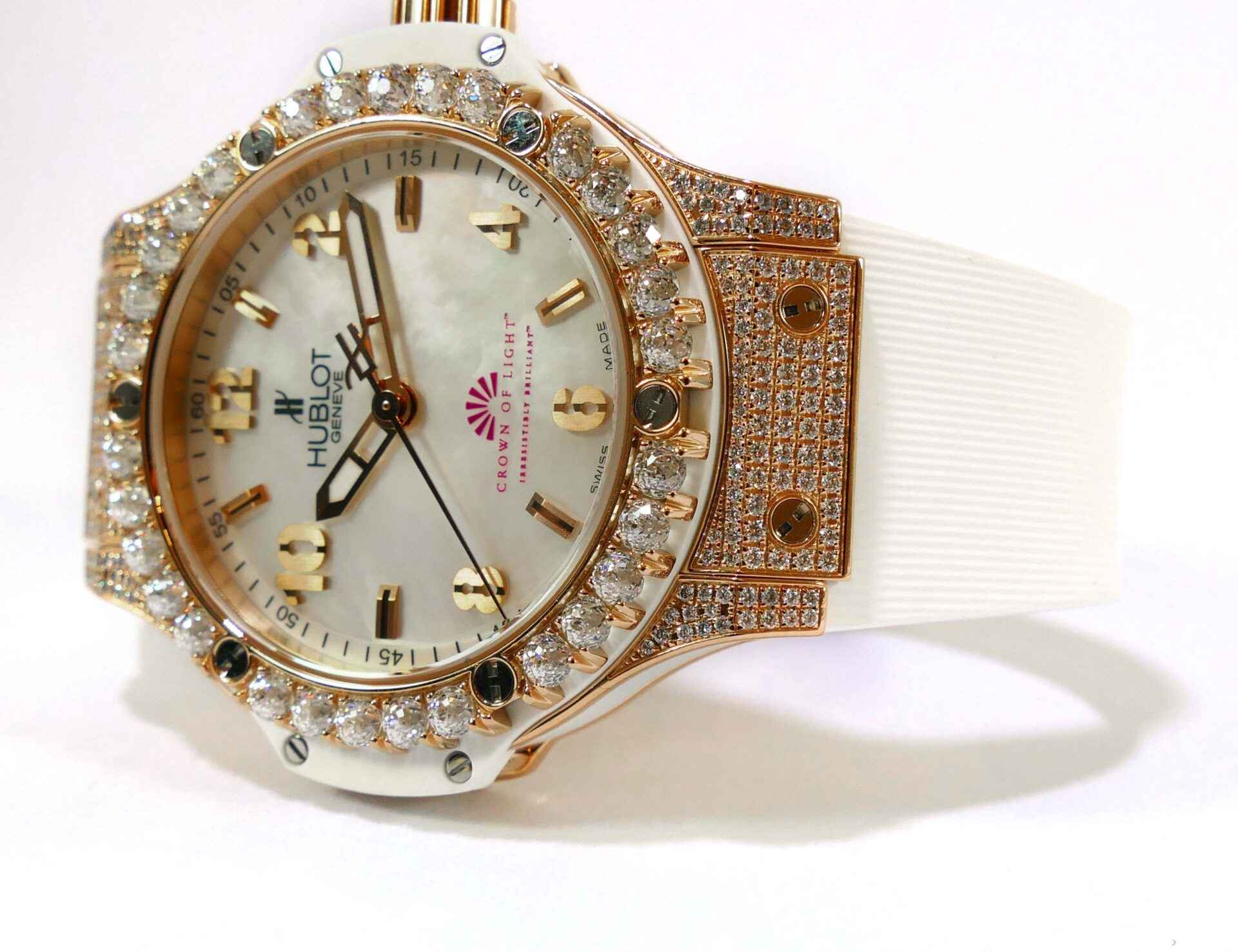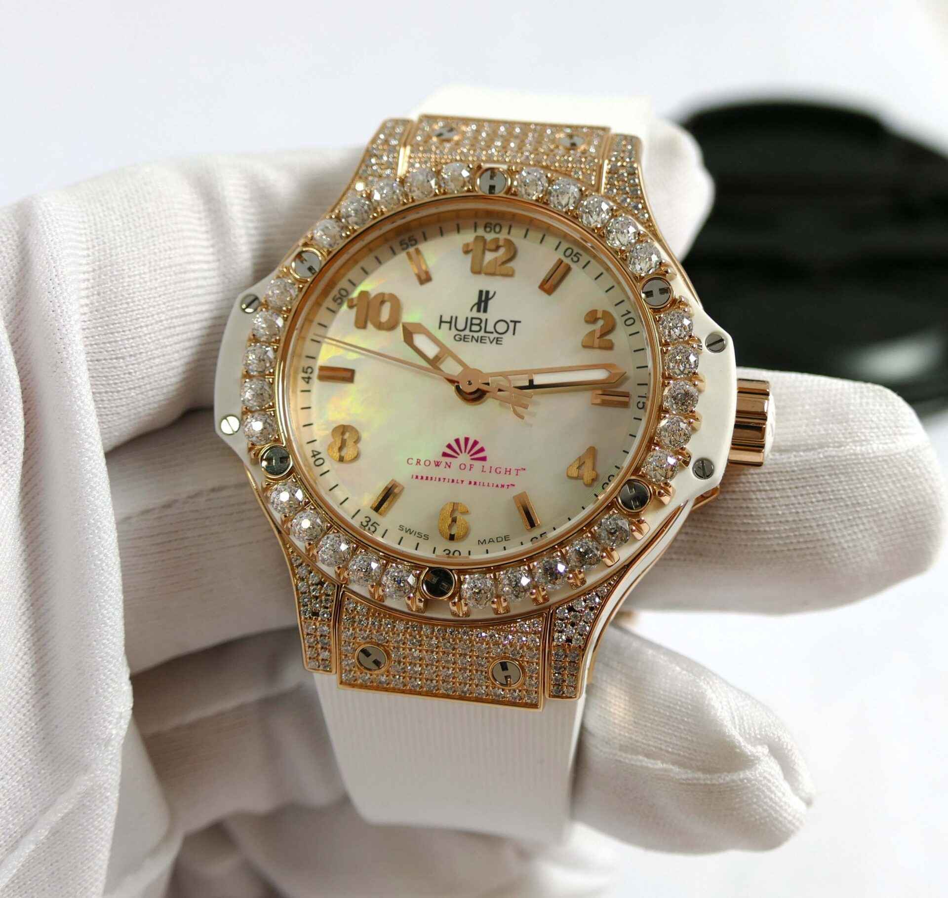 You are looking at a Hublot Crown of Light Big Bang 38mm Quartz watch. There were only 180 of this model produced. All of the diamonds are factory set and 100% original. This watch just came back from the Hublot Service...