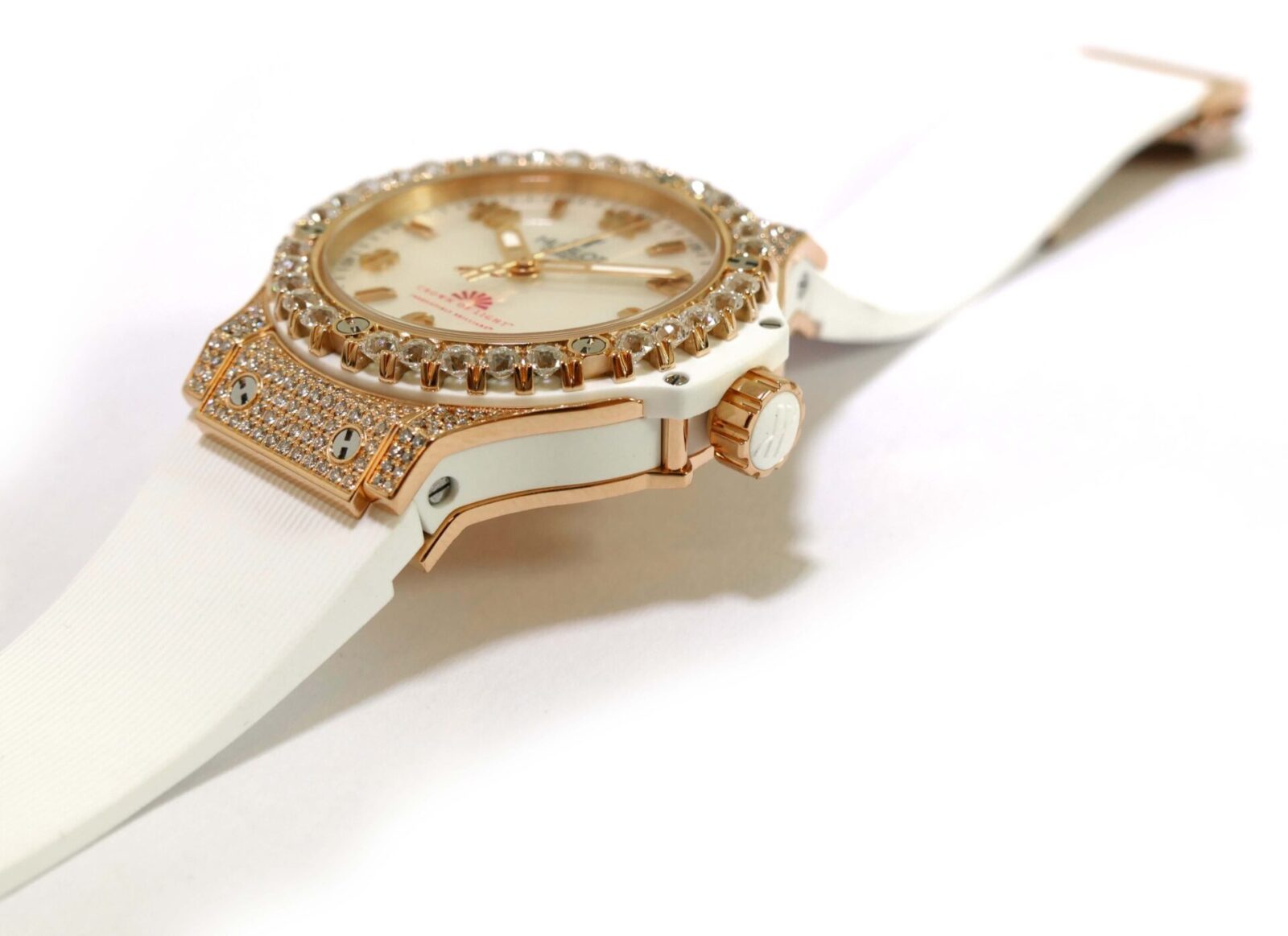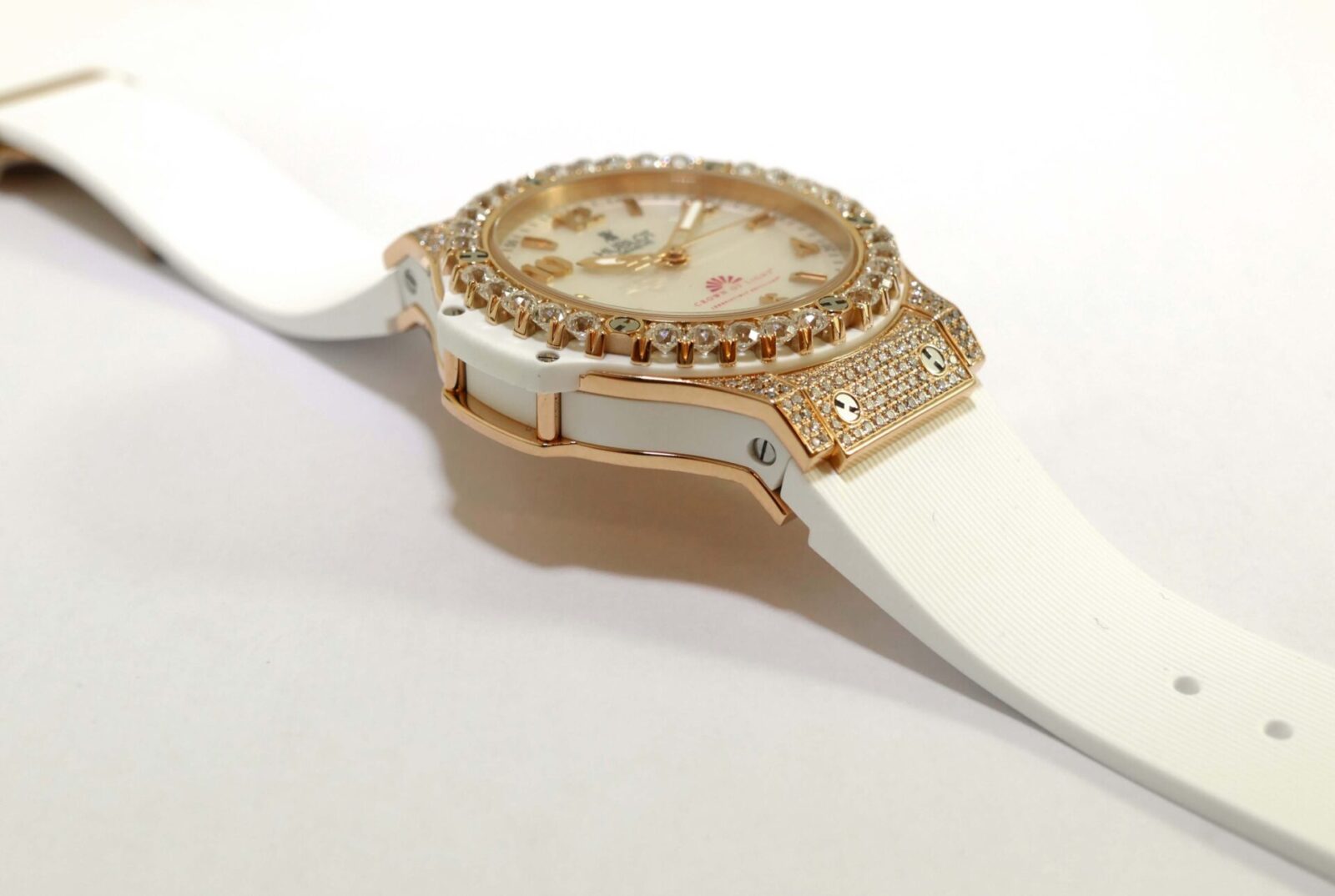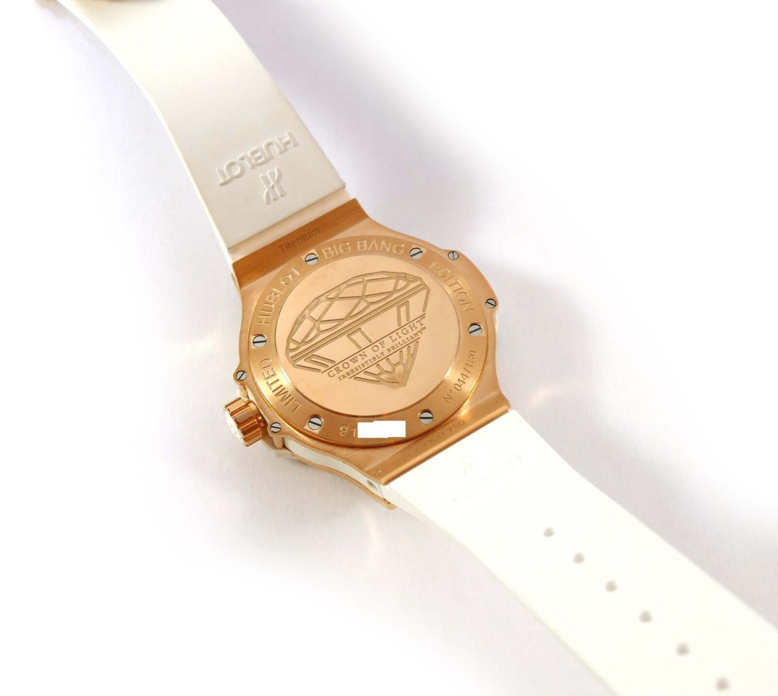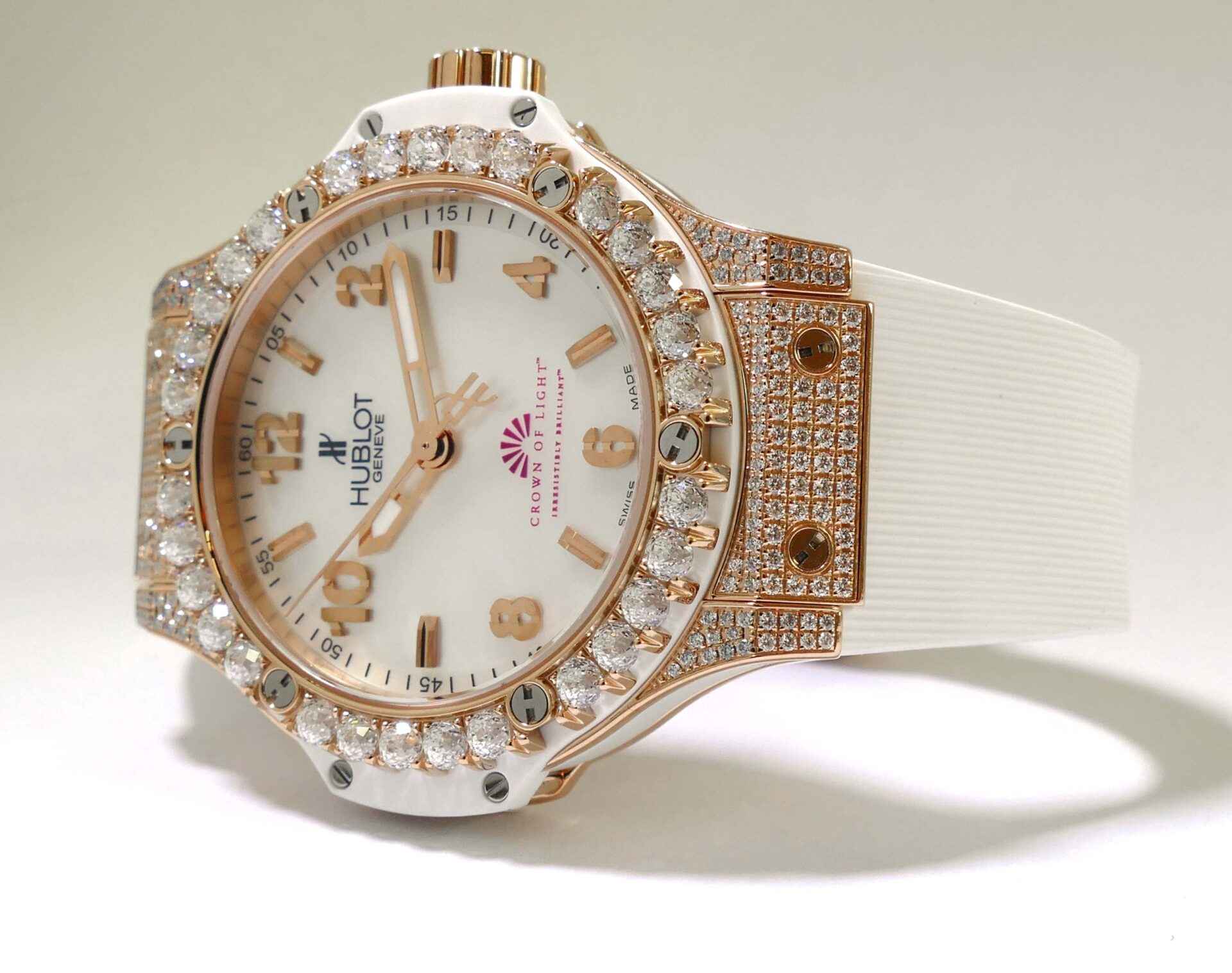 You are looking at a Hublot Crown of Light Big Bang 38mm Quartz watch. There were only 180 of this model produced. All of the diamonds are factory set and 100% original. This watch just came back from the Hublot Service...