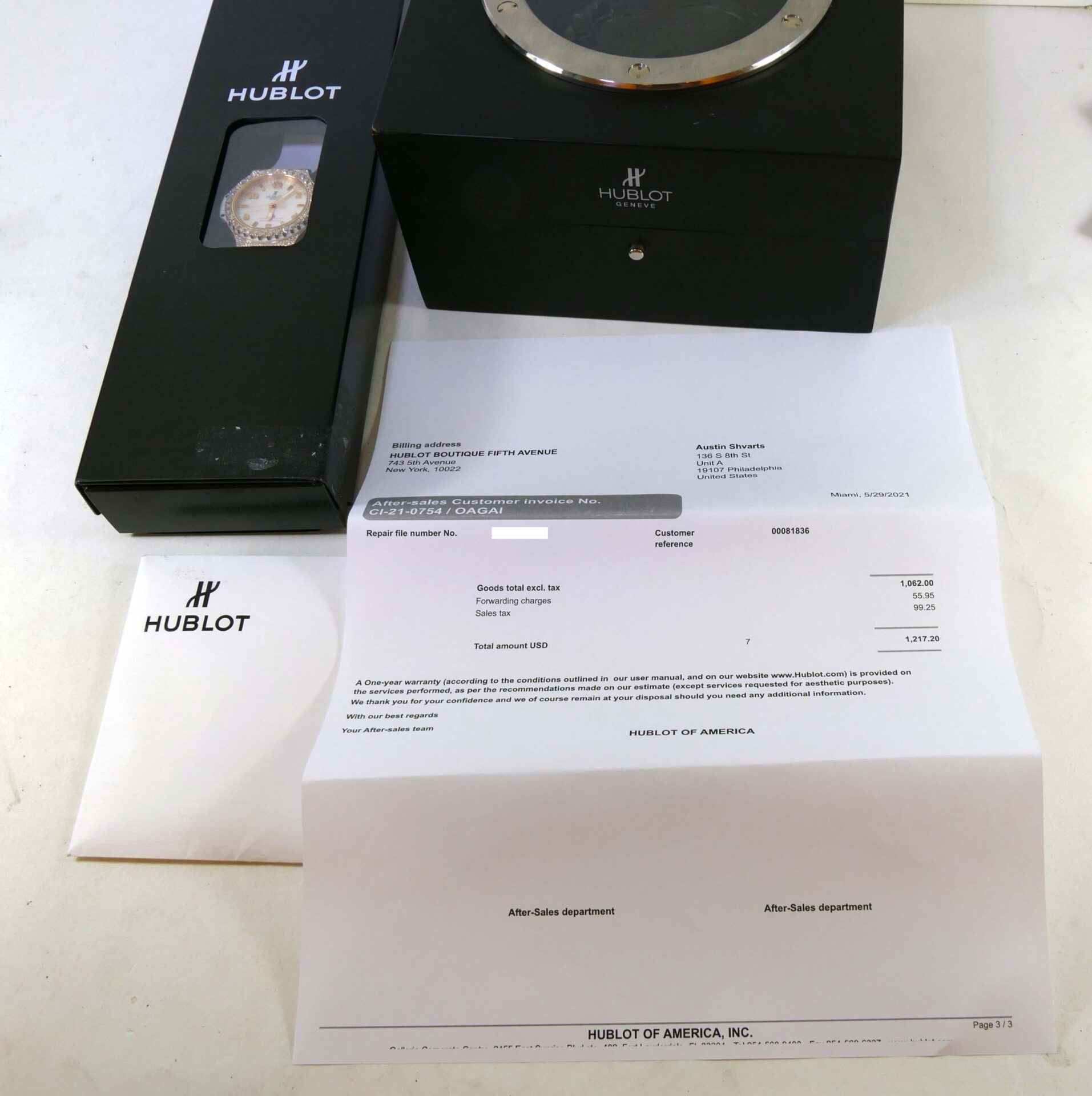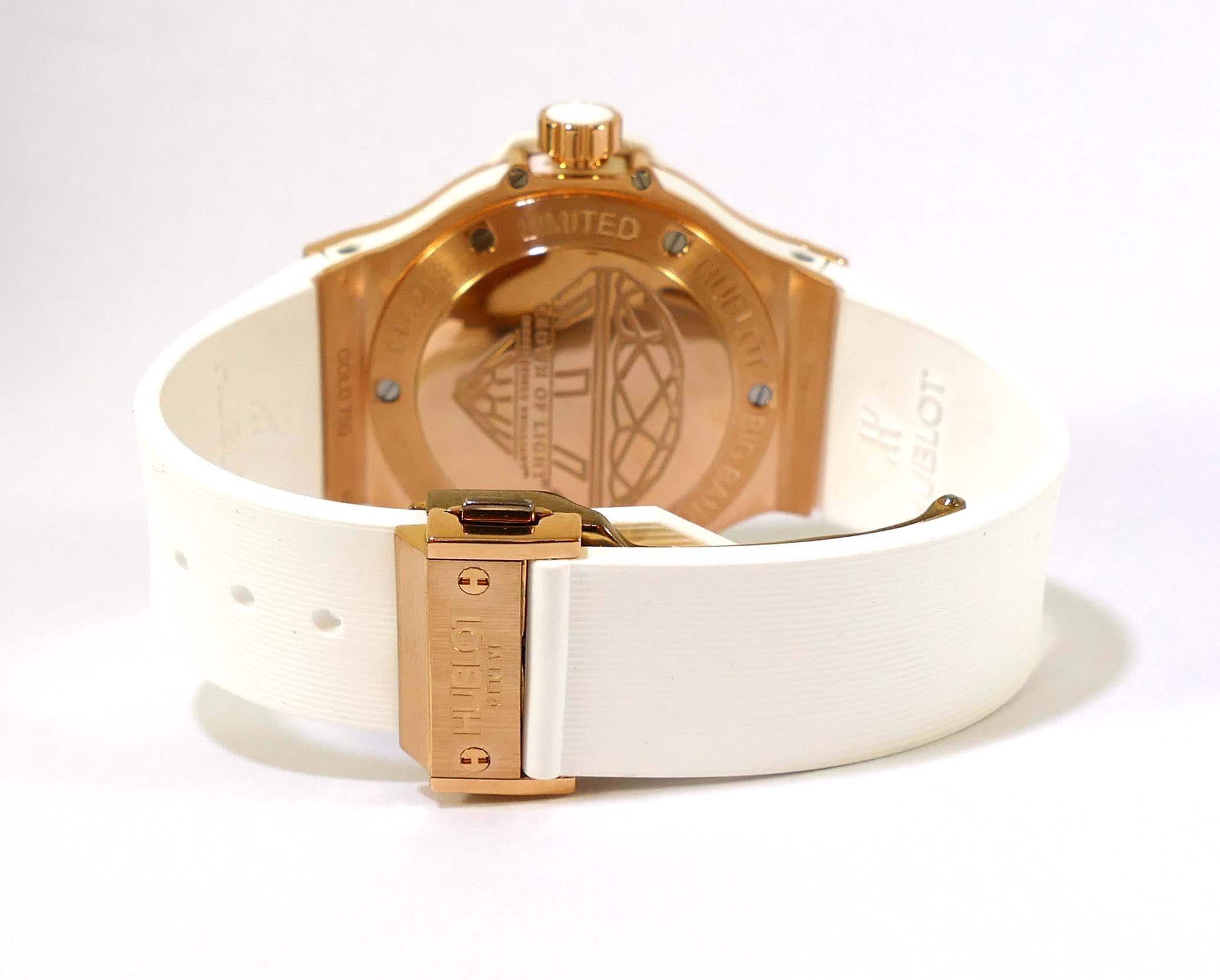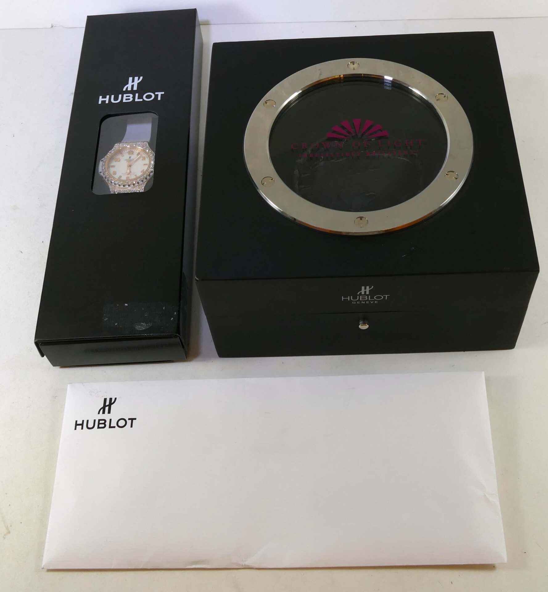 you are looking at a hublot crown of light big bang 38mm quartz watch. There were only 180 of this model produced. All of the diamonds are factory set and 100% original. This watch just came back from the hublot service center where it received a full service and brand new strap. The watch is back to brand new condition! it comes with its original box, service box, and service papers. The pillow in the original box is flaking which is common with hublot boxes.