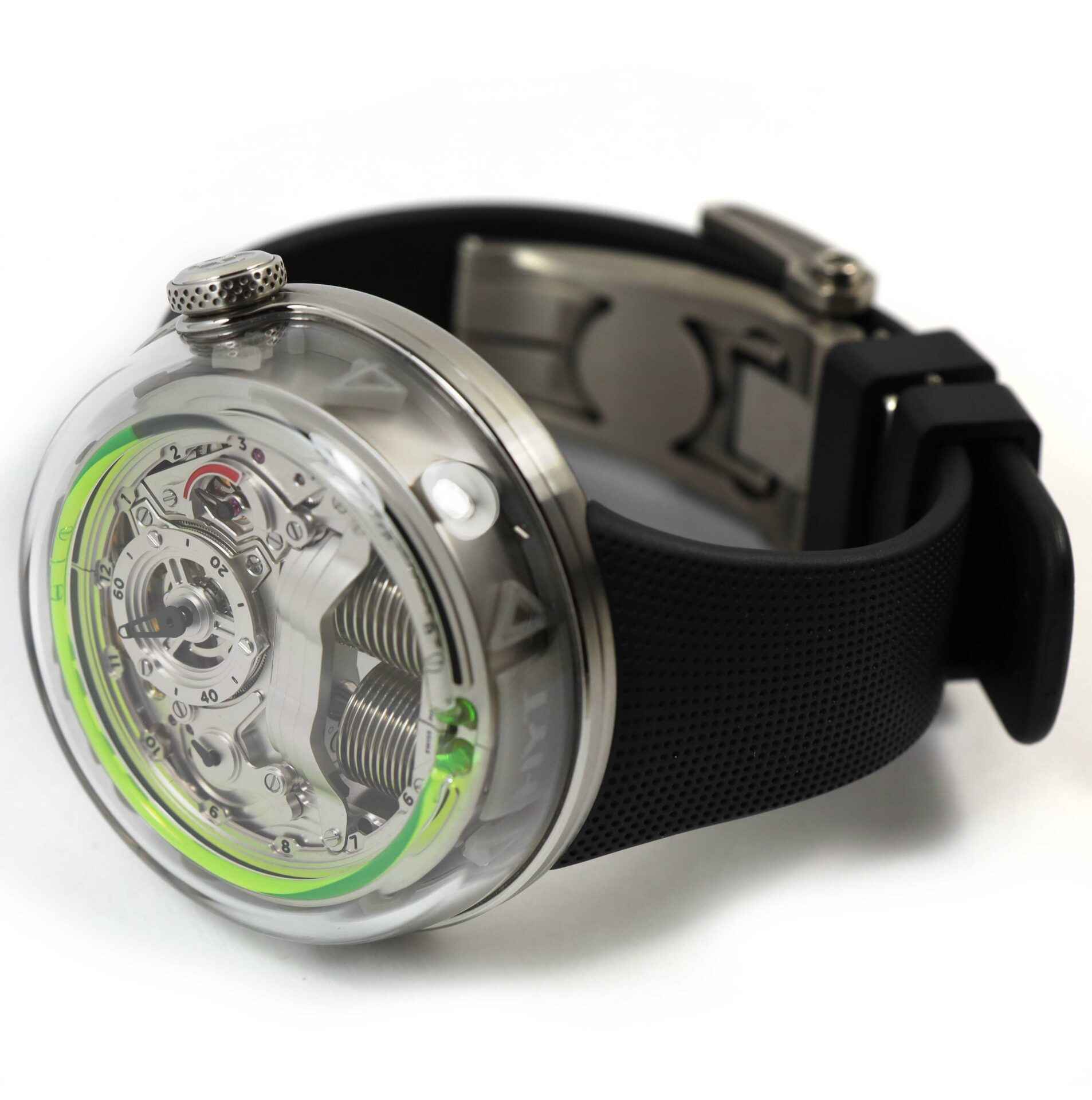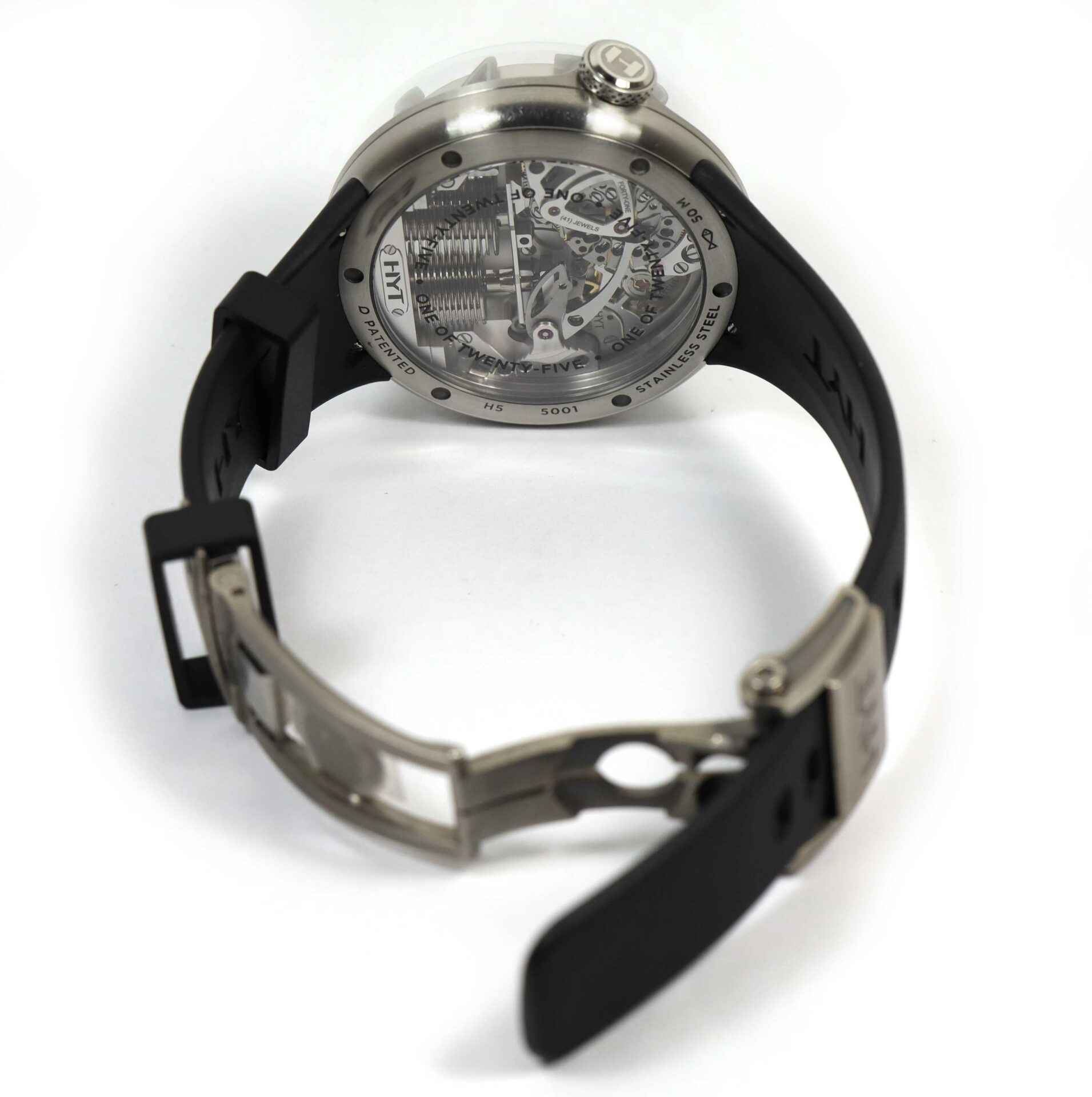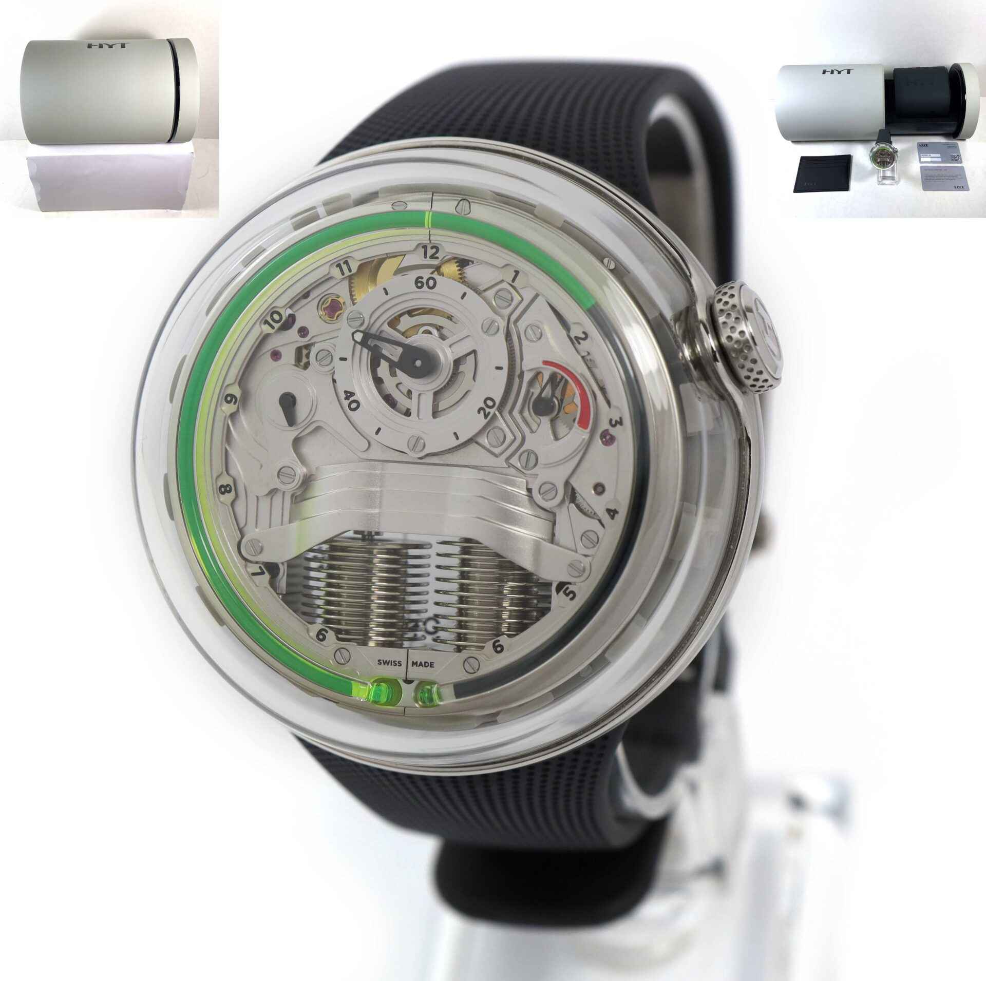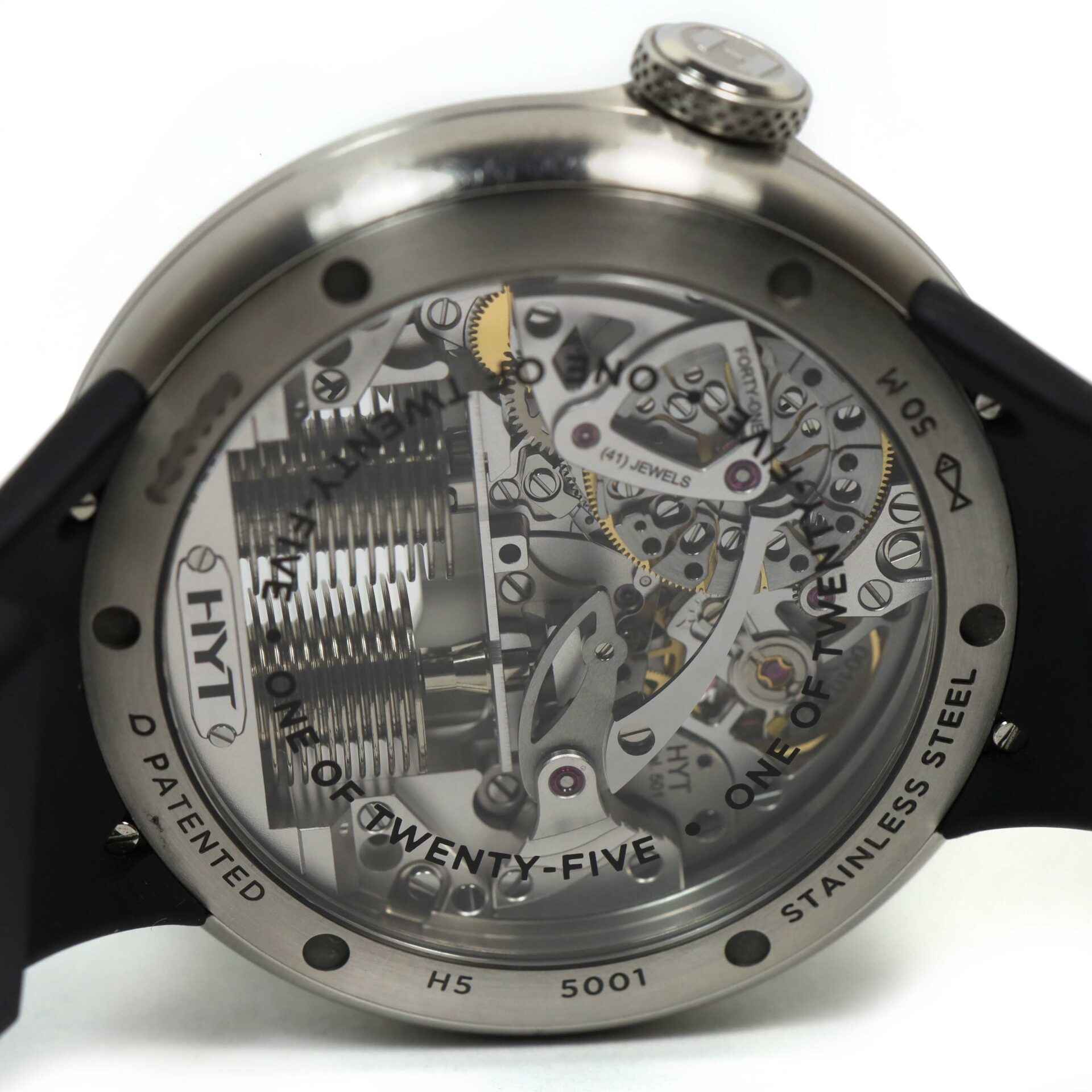 Read Morethis hyt h5 is in excellent condition and comes with its box, papers, and warranty card as shown in the pictures attached. This hyt features a 48.8mm stainless steel case surrounding a skeleton dial on a black rubber strap with a steel deployment buckle. The functions include hours, minutes, small seconds and power reserve indicator. This watch is part of a limited edition of only 25 pieces produced! this watch is in stock and available to ship immediately!