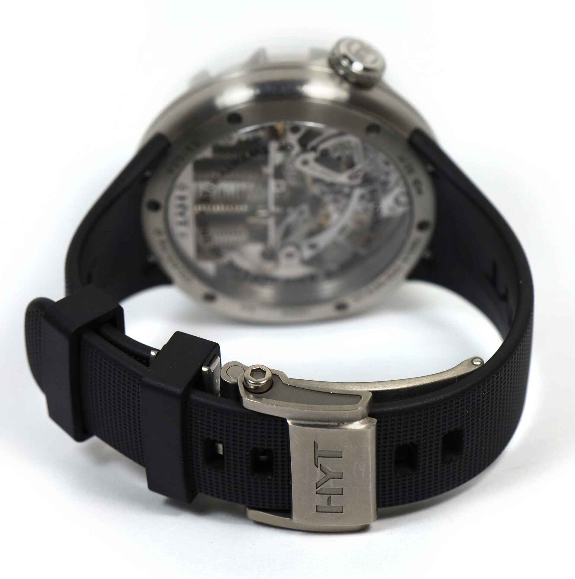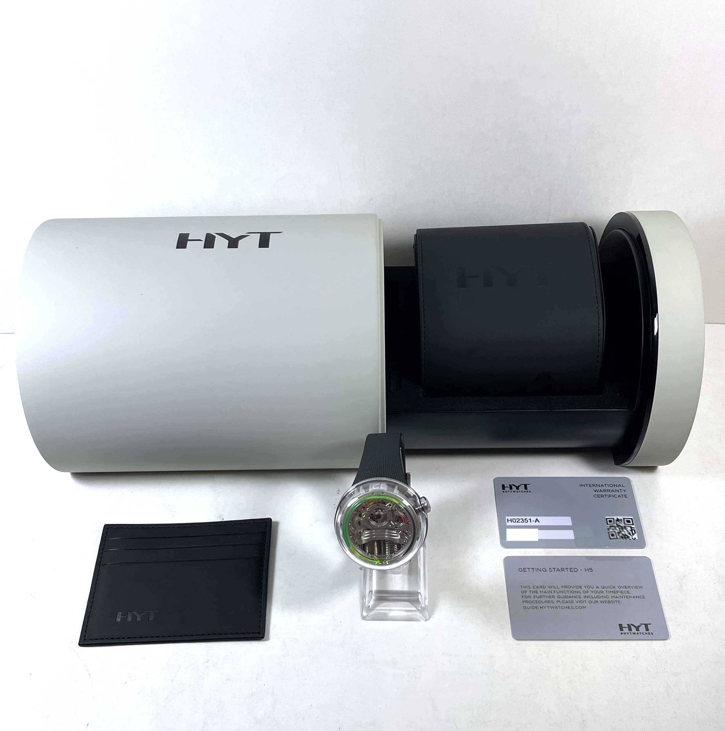 This HYT H5 is in excellent condition and comes with its box, papers, and warranty card as shown in the pictures attached. This HYT features a 48.8mm stainless steel case surrounding a skeleton dial on a black rubber str...