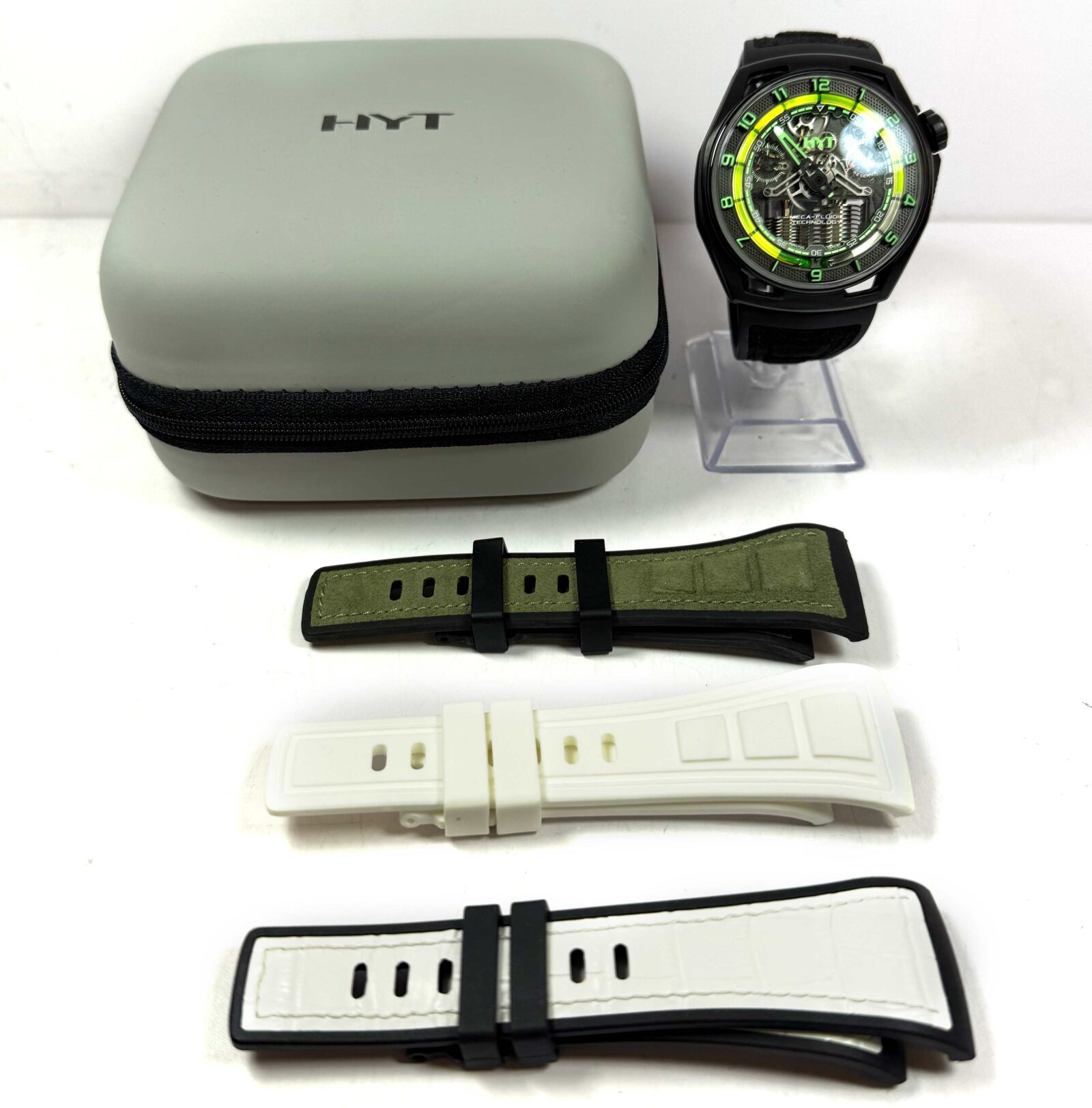 this hyt watch is in amazing condition and comes with its travel case and 3 additional straps as shown in the pictures attached. This hyt is number 1 out of 27 total pieces produced in this model. This watch is in stock and available to ship immediately!