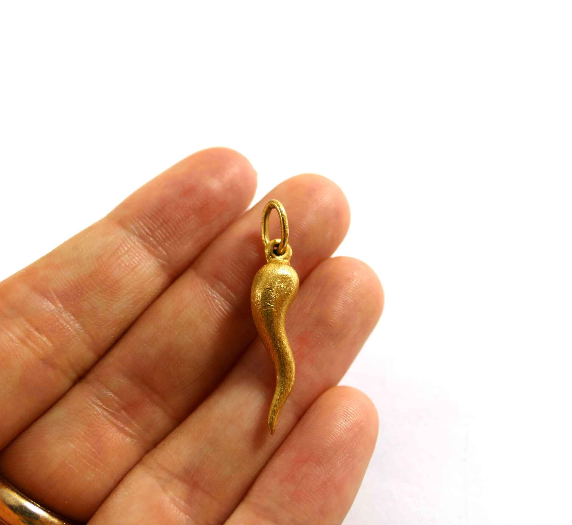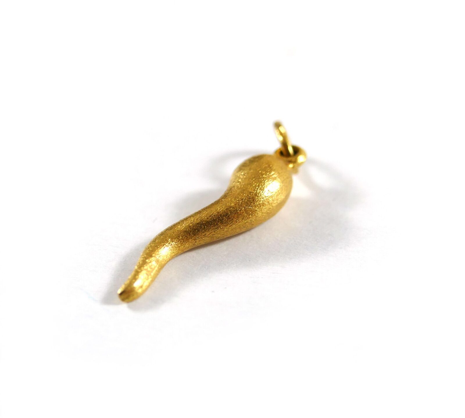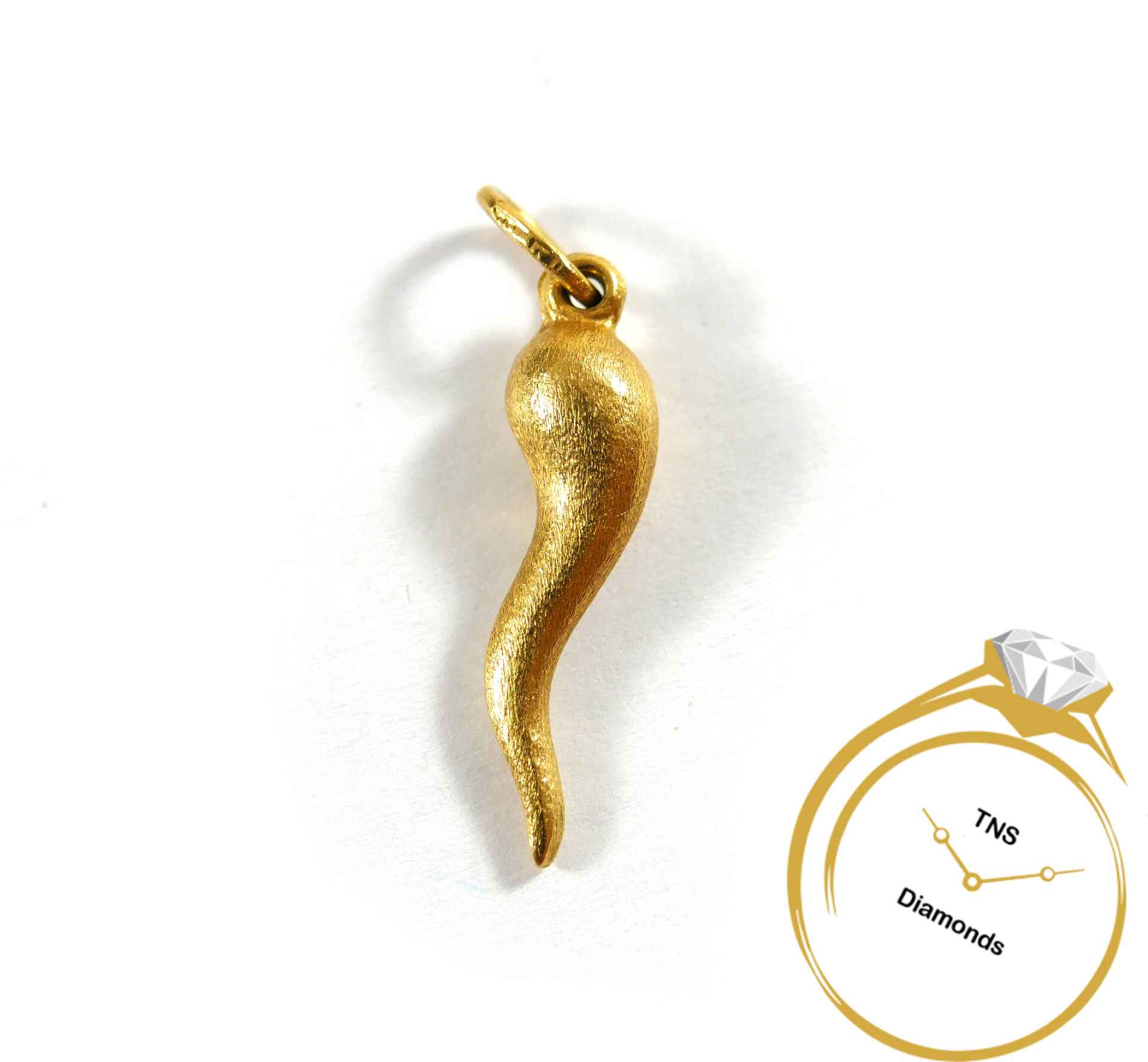 this italian horn amulet or talisman is worn to protect against all evil. This specific pendant is made of 18k yellow gold, and is textured and detailed to make it have depth and accent.