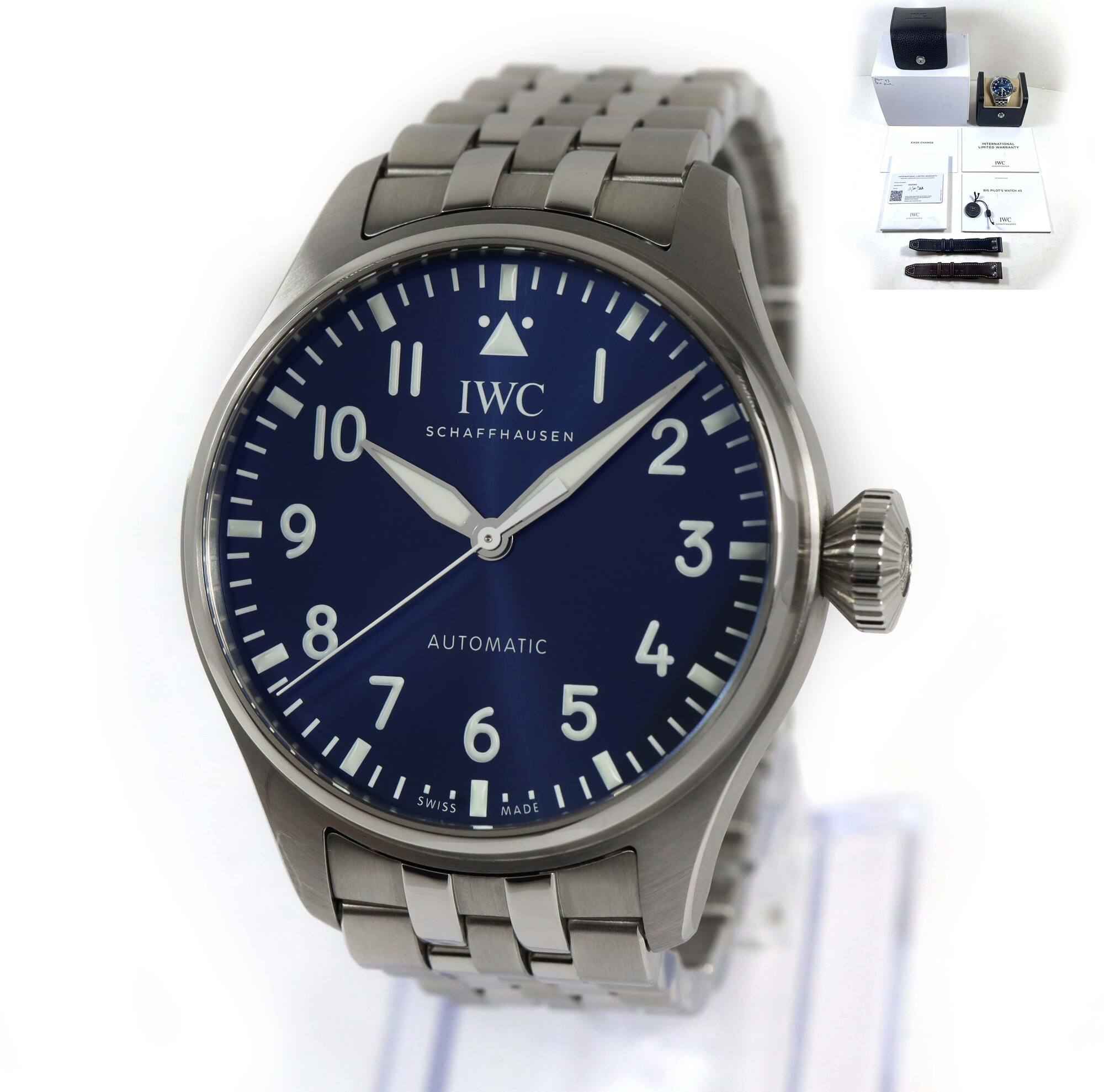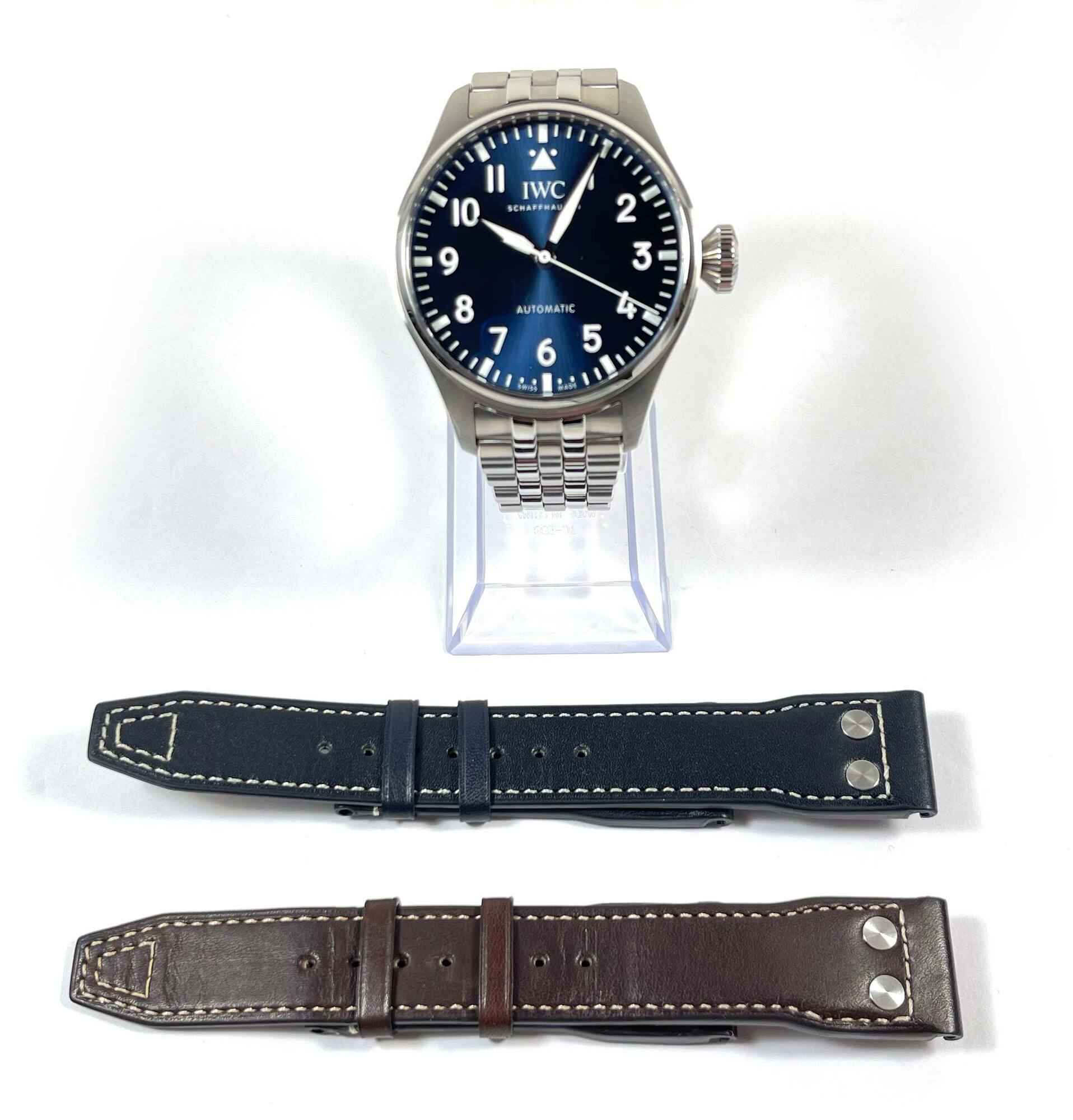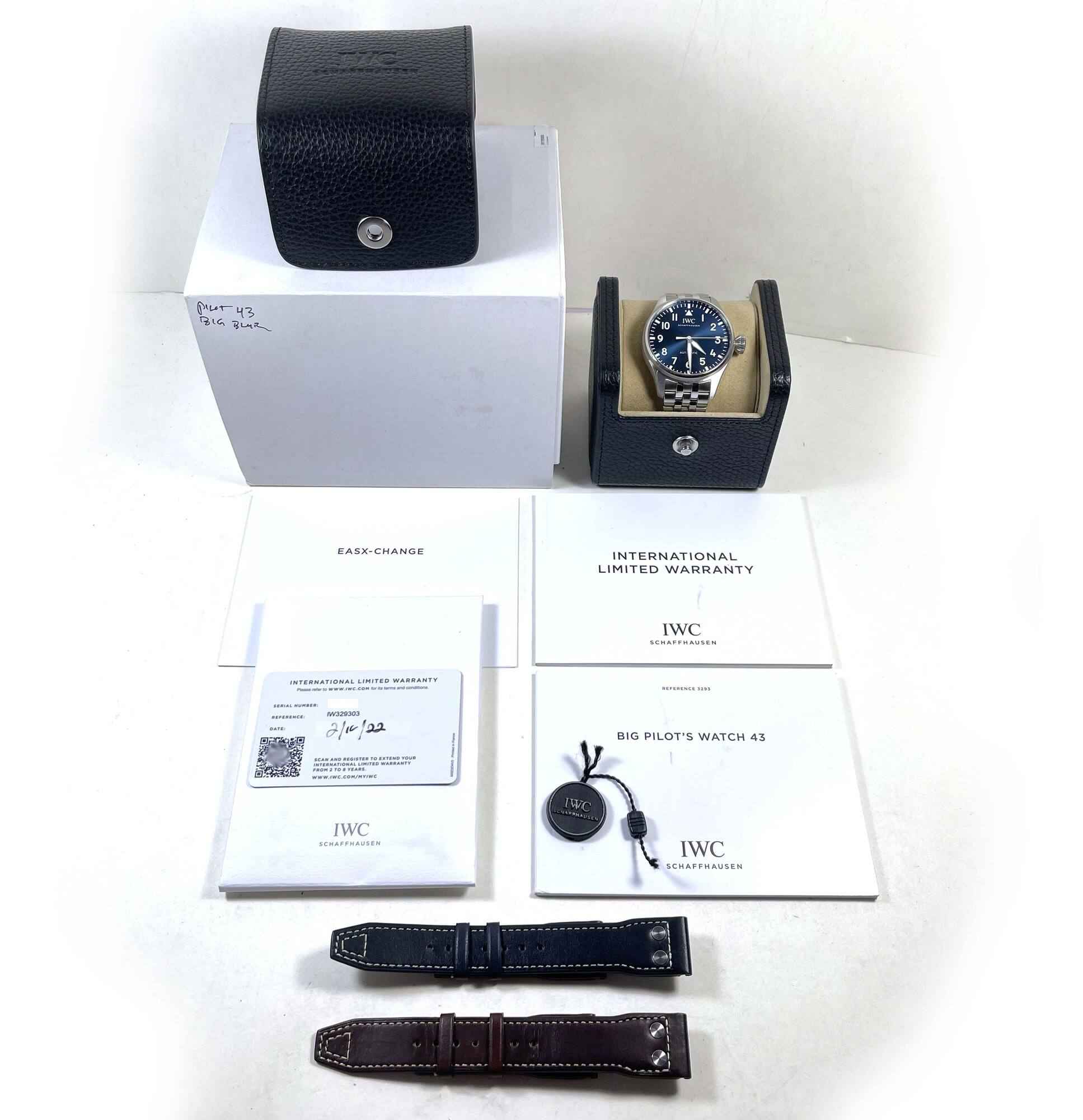Read Morethis iwc watch is in excellent condition showing some minor signs of wear on the case and bracelet as shown in the pictures attached. This watch comes with its box, booklets, hang tag, two additional straps, and warranty card dated february 16th, 2022. This watch typically comes on the blue/brown leather strap but the original owner purchased the stainless steel bracelet also. This watch is in stock and available to ship immediately!