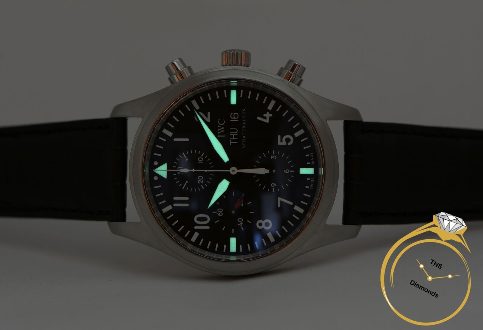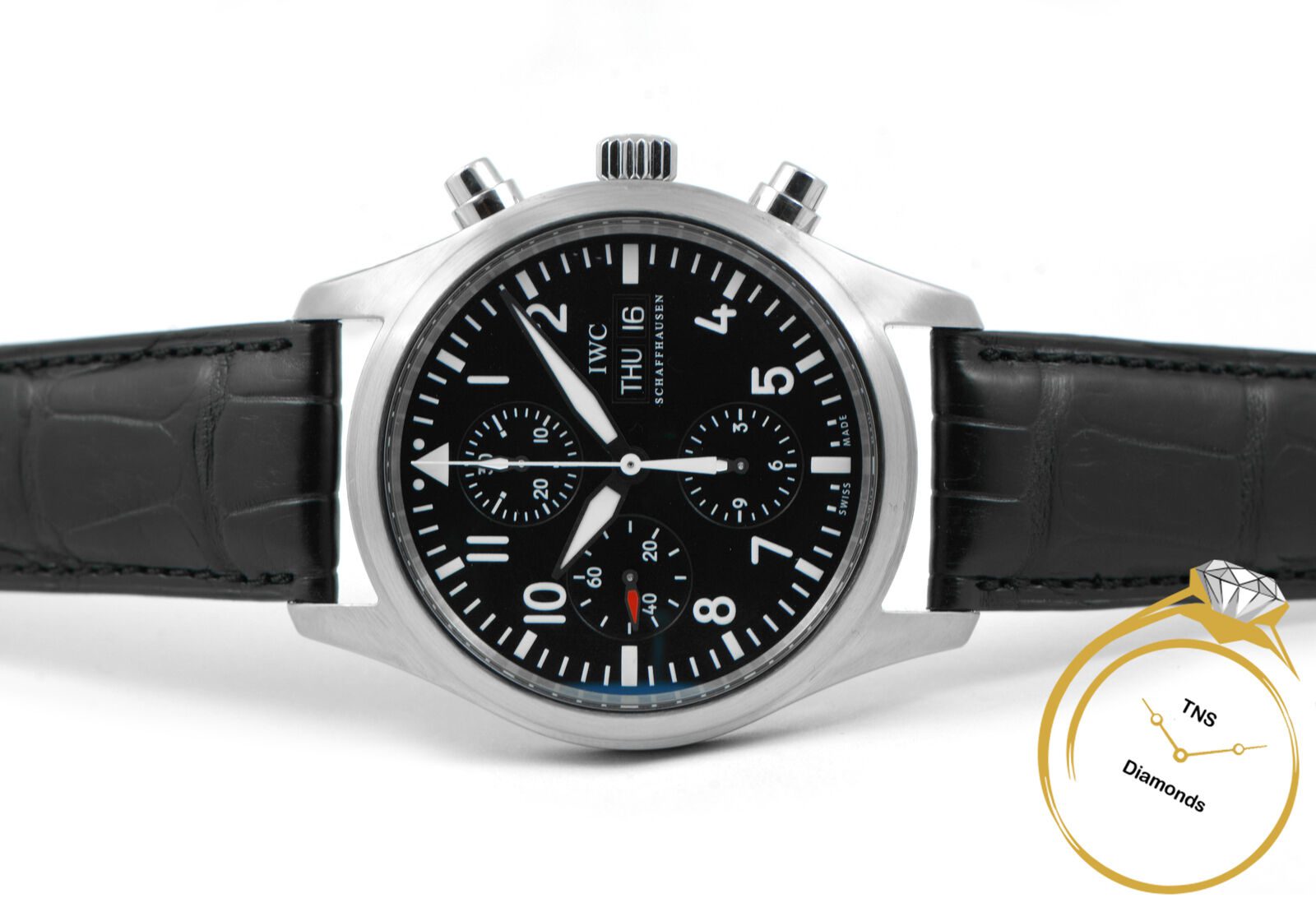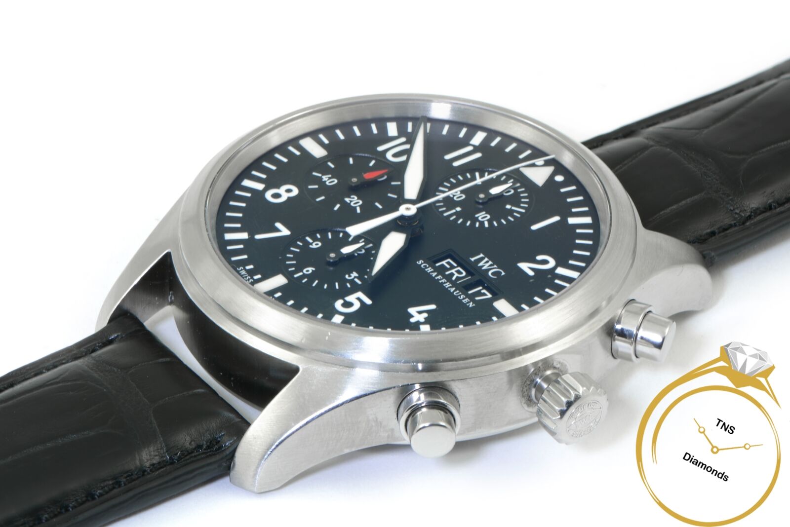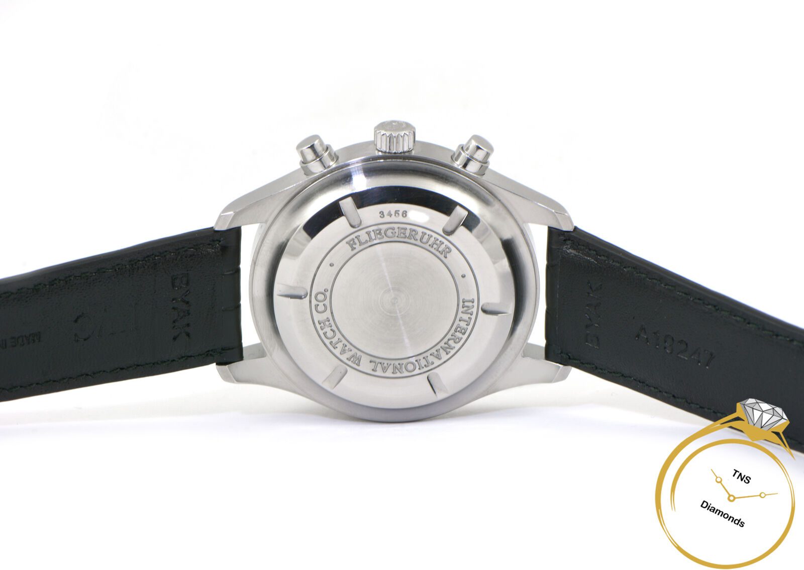 condition: pre-owned gender: men’s watches band: leather watches box: original box watches brand: iwc watches case diameter (mm): 42 watches caseback: solid watches crystal: sapphire watches dial: silver watches functions: chronograph/day/date watches model: iw3717-01 watches movement: automatic watches papers: no original papers watches serial – year: 3456*** watches series: pilot’s chronograph watches warranty: 12-month tns diamonds warranty