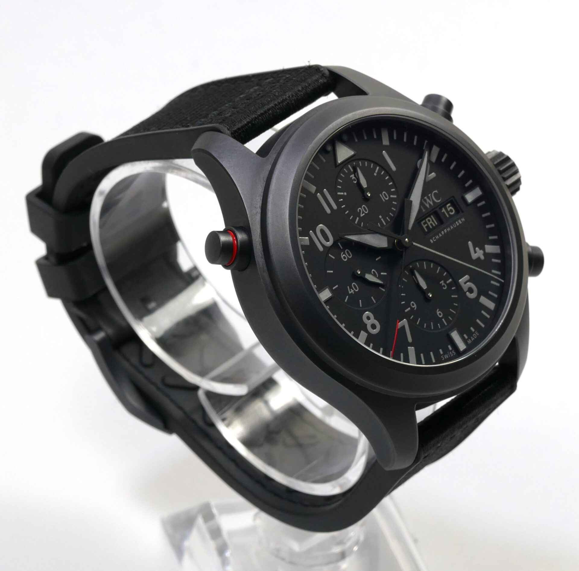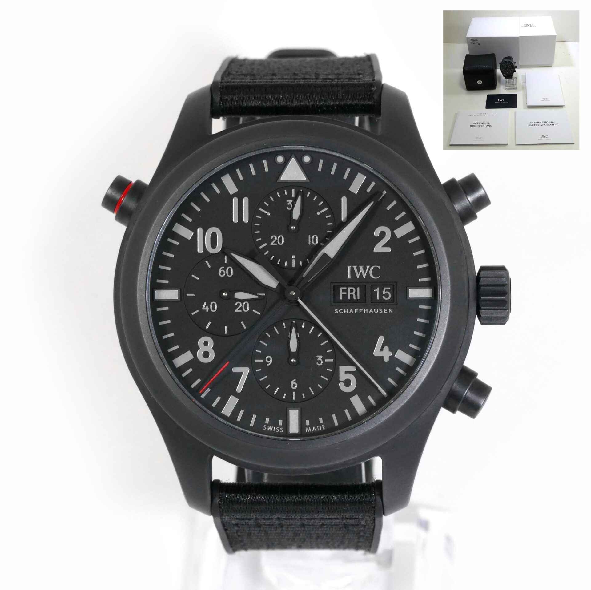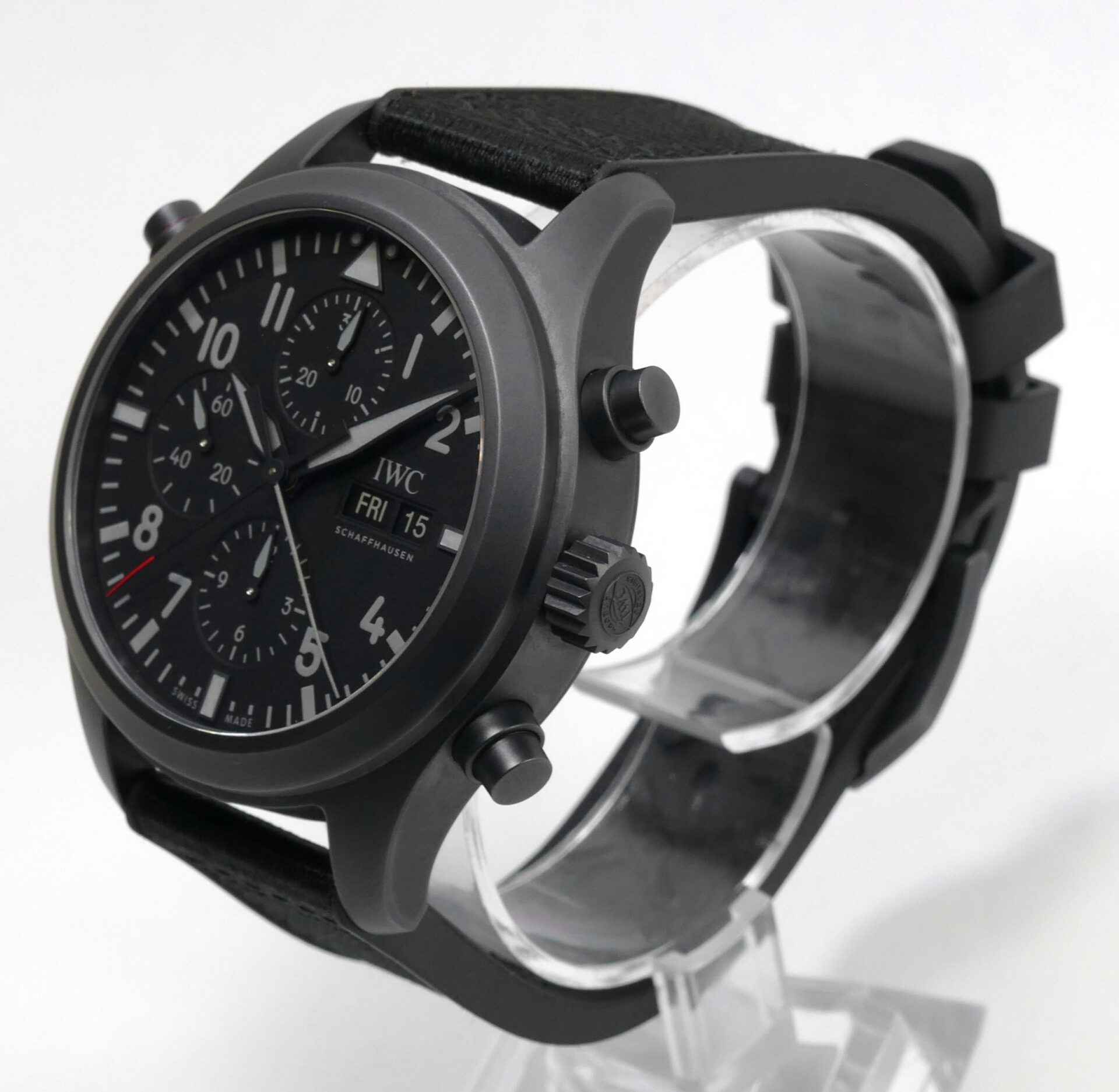 This IWC Pilots watch is in excellent condition and comes with box, papers, and warranty card. This watch features a black dial with a black ceratanium case, a self winding movement with a 44 hour power reserve, a chronog...