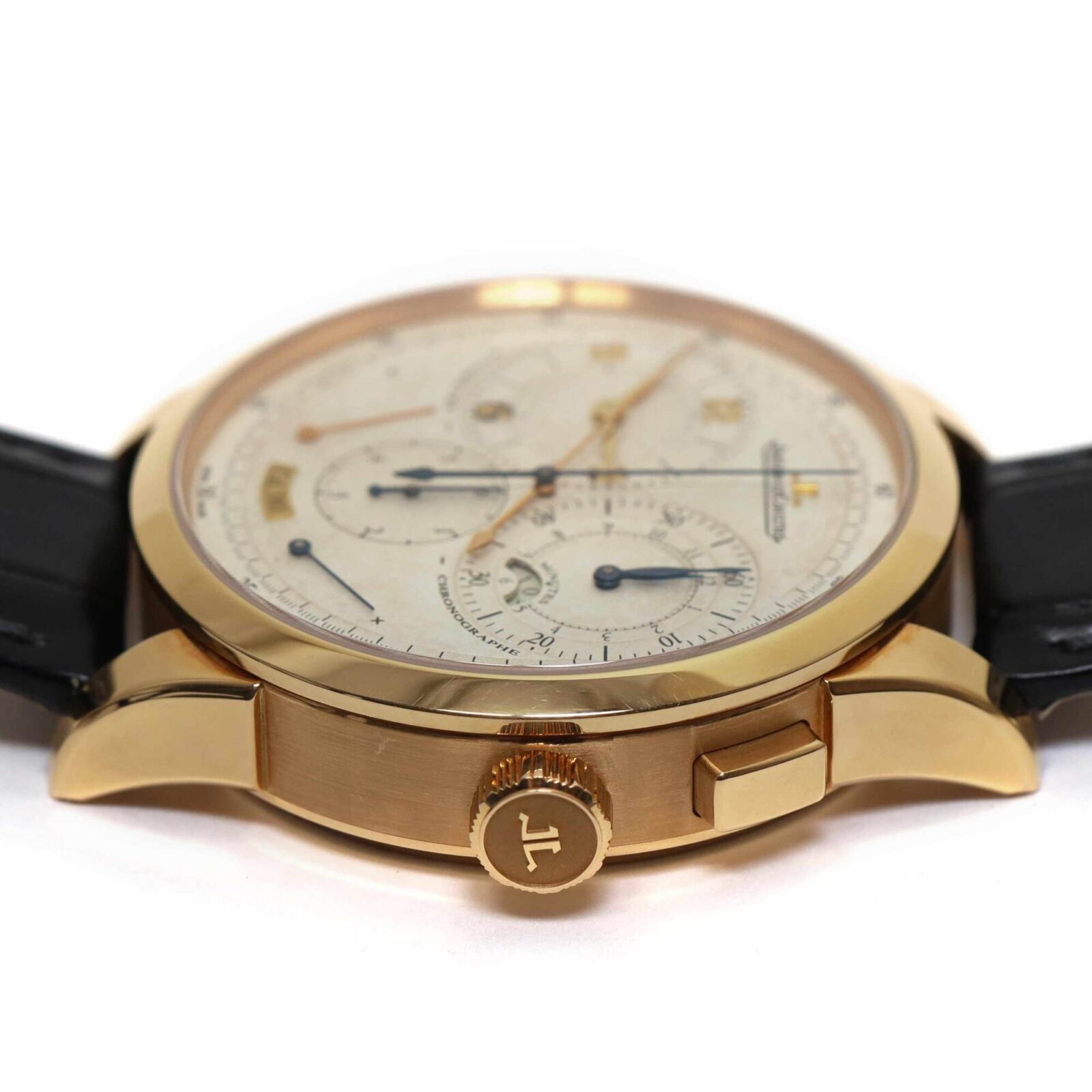 this jlc watch is in amazing overall condition and comes as watch only. The hour markers on the left subdial do show some discoloration as shown in picture #2. The black leather strap for this watch appears to be unworn. This jlc is in stock and available to ship immediately!
