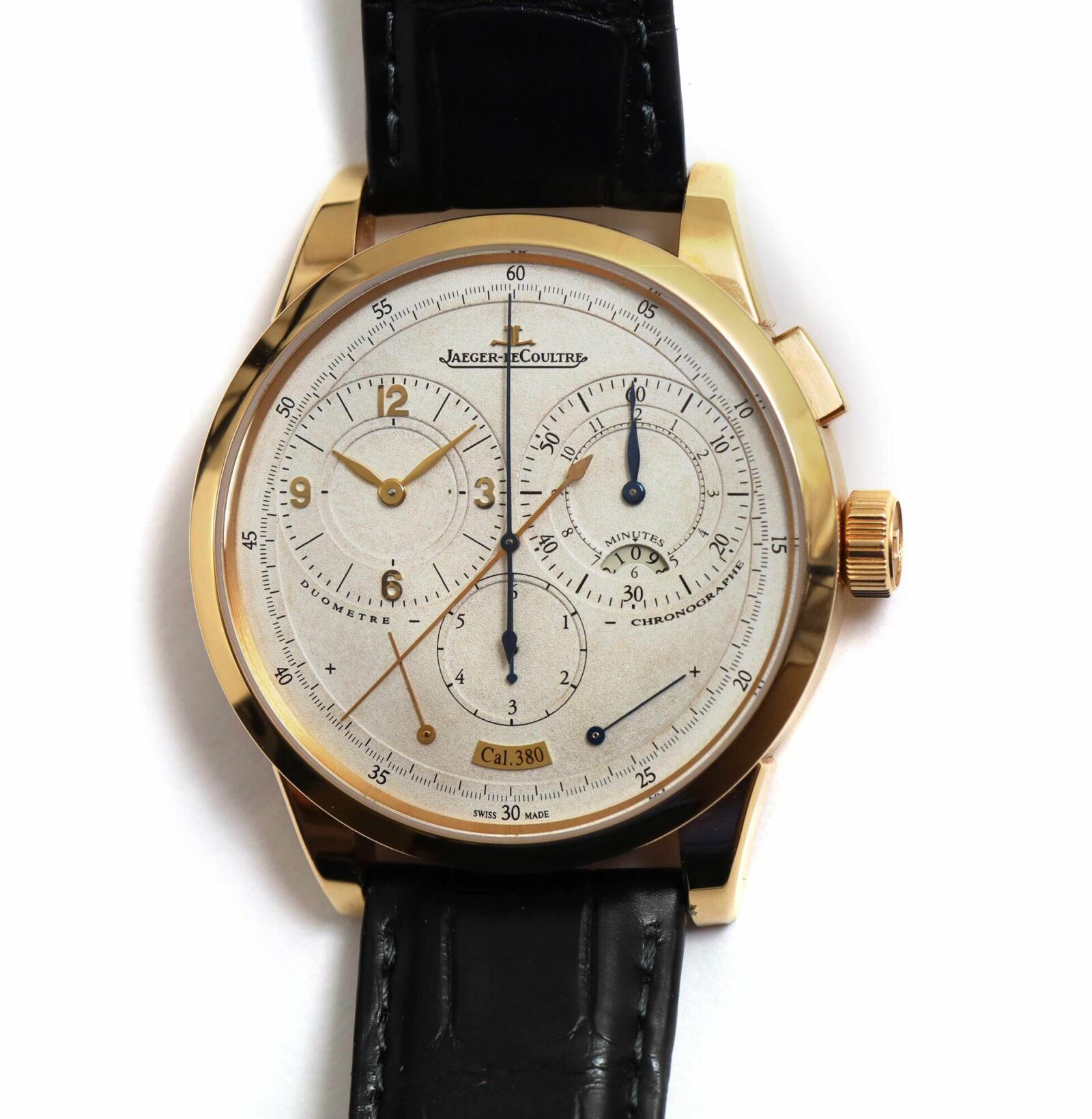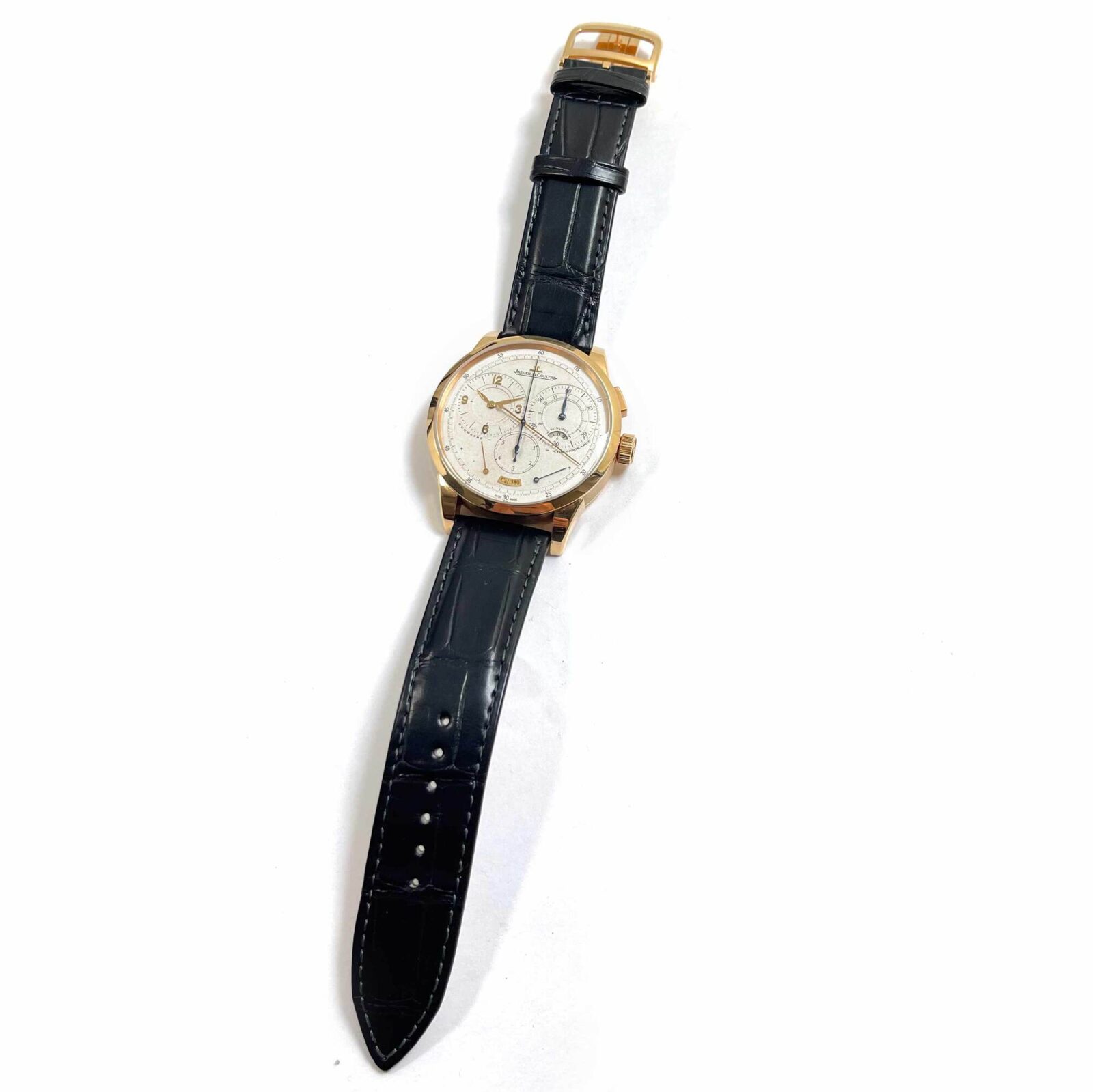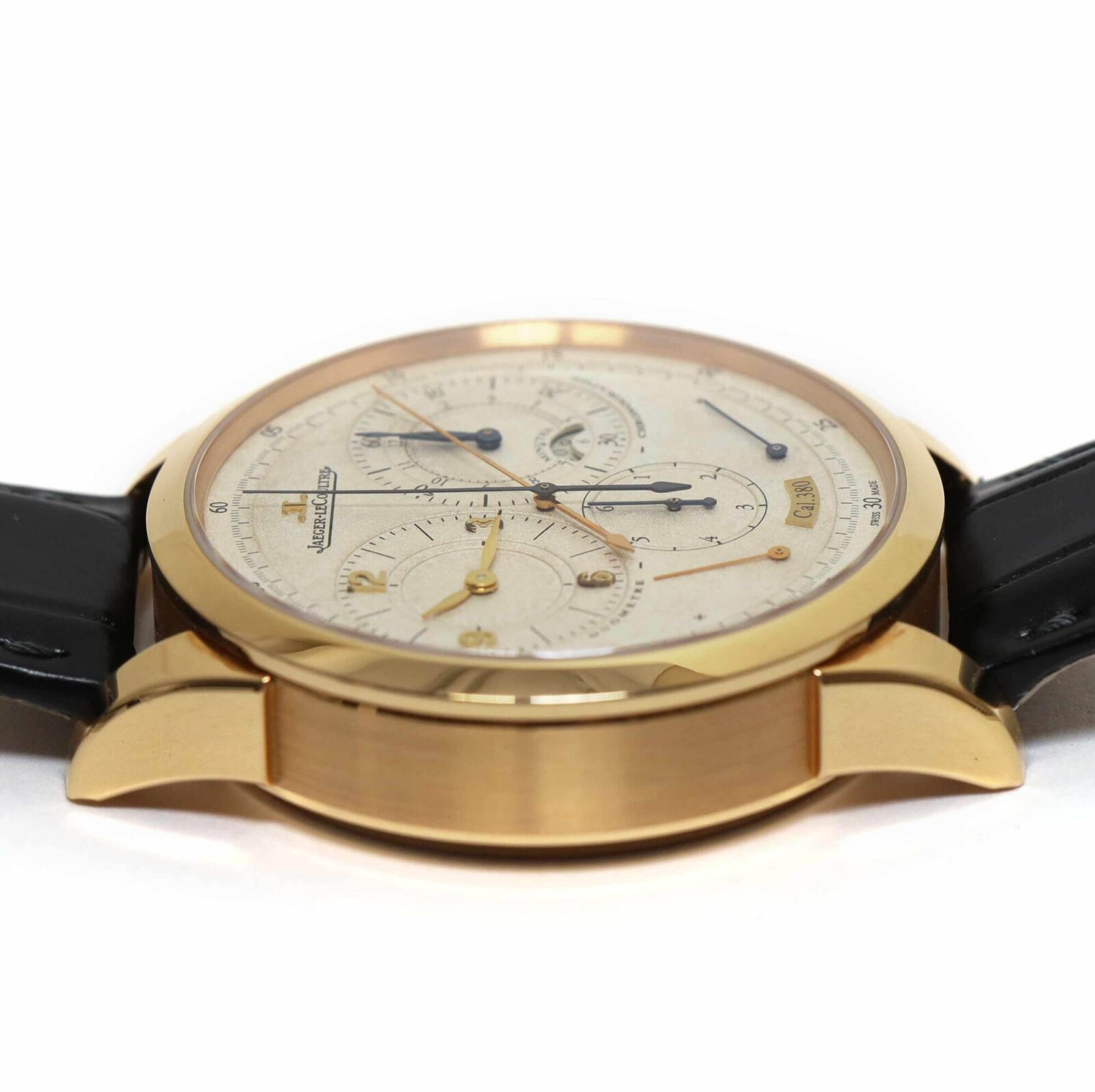 THIS JLC WATCH IS IN AMAZING OVERALL CONDITION AND COMES AS WATCH ONLY. THE HOUR MARKERS ON THE LEFT SUBDIAL DO SHOW SOME DISCOLORATION AS SHOWN IN PICTURE #2. THE BLACK LEATHER STRAP FOR THIS WATCH APPEARS TO BE UNWORN. THIS JLC IS IN STOCK AND AVAILABLE T...