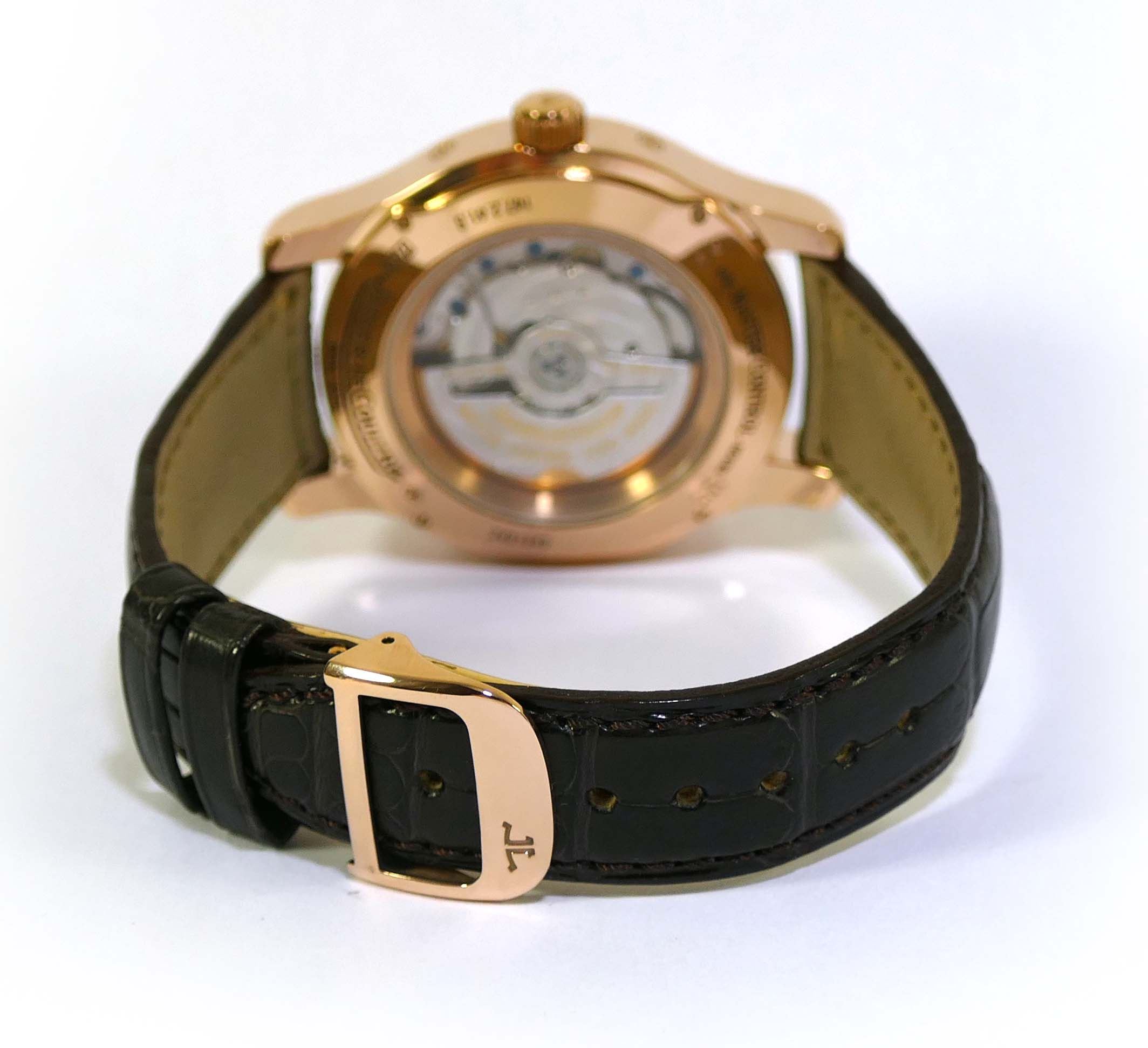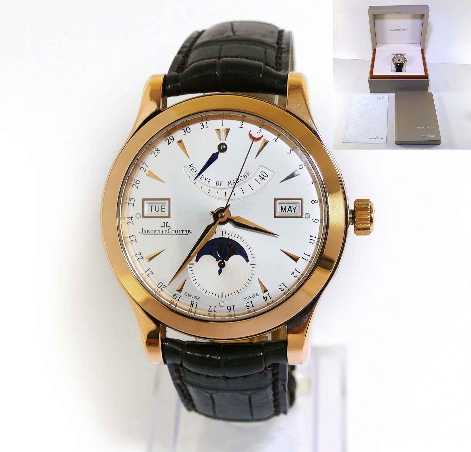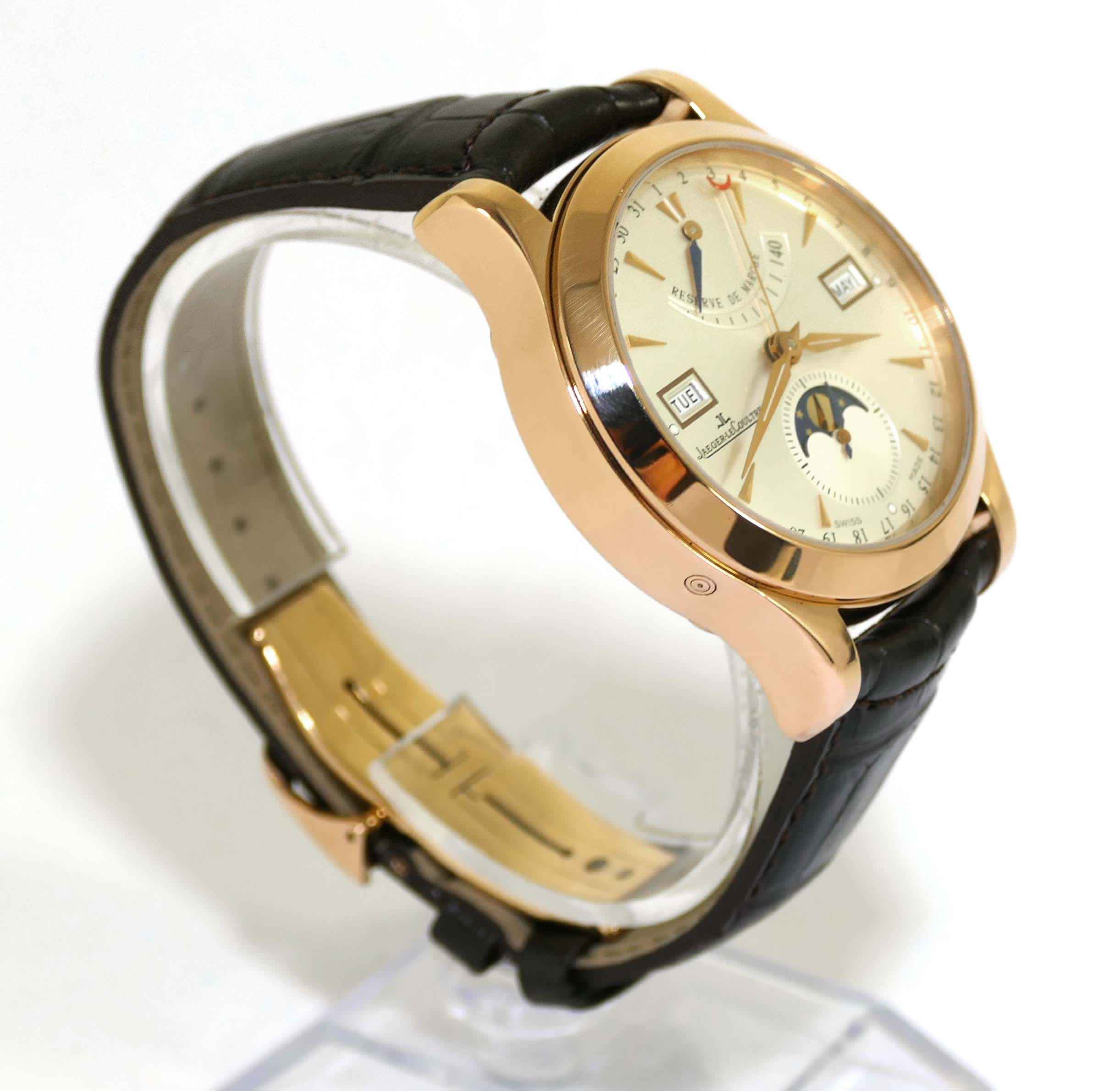 this jlc watch is in excellent condition and functioning properly. It features a day power reserve, moon-phase indicator, and annual calendar function. It comes on a brand new jlc original dark brown strap.