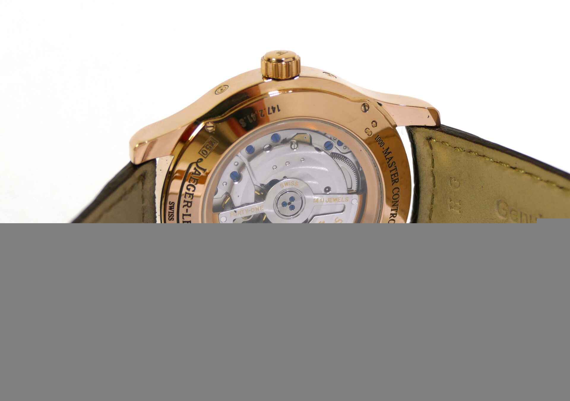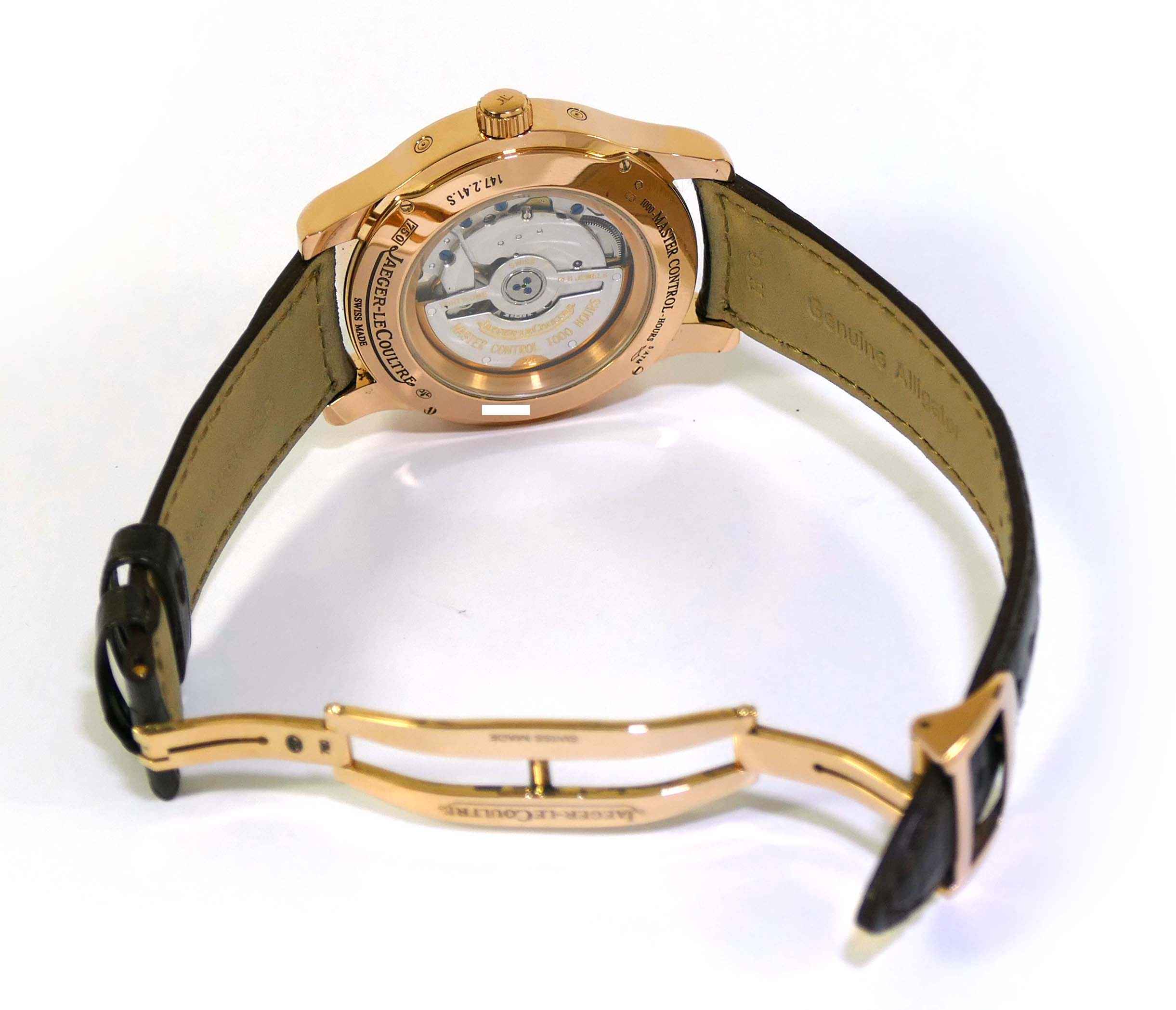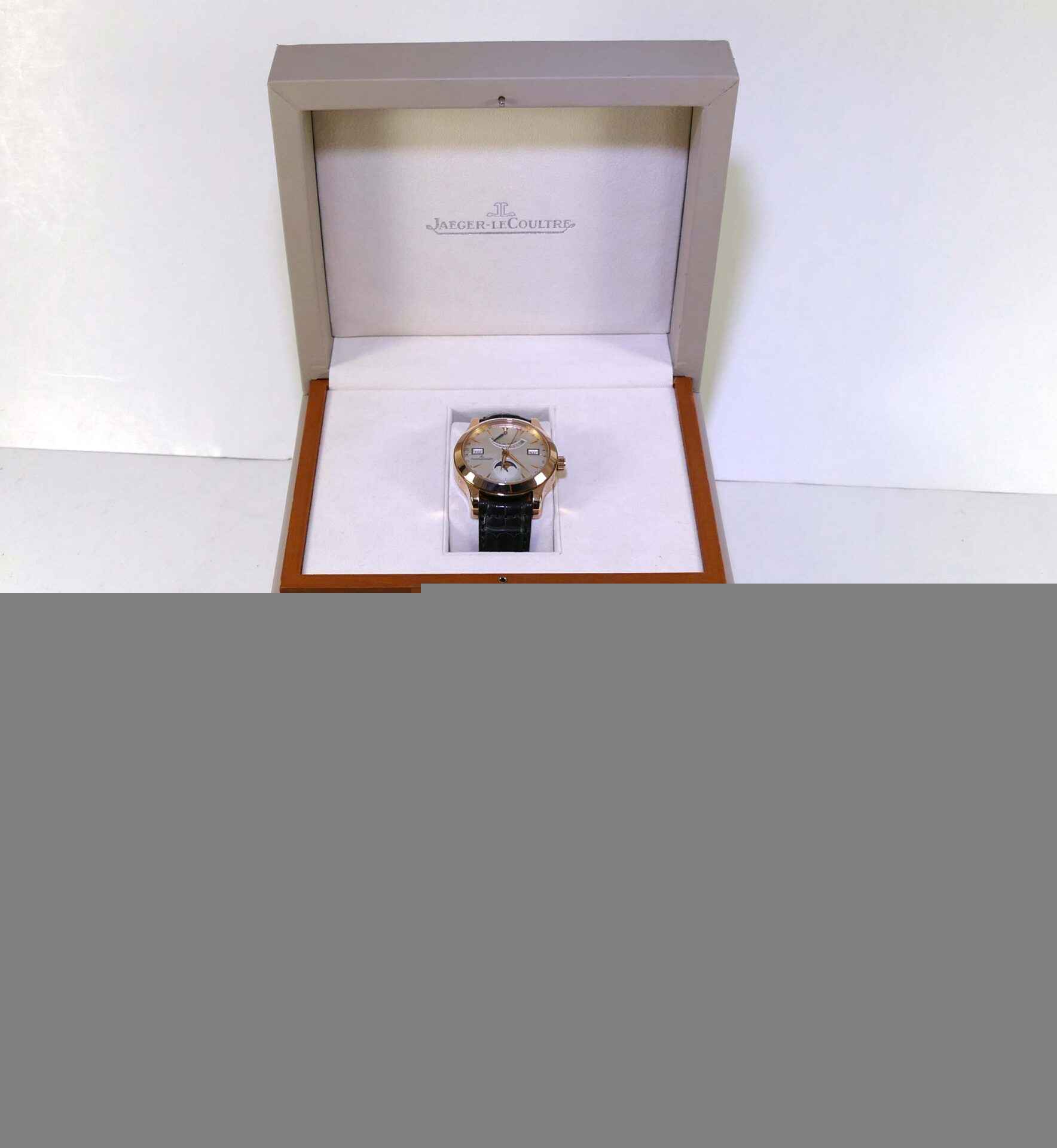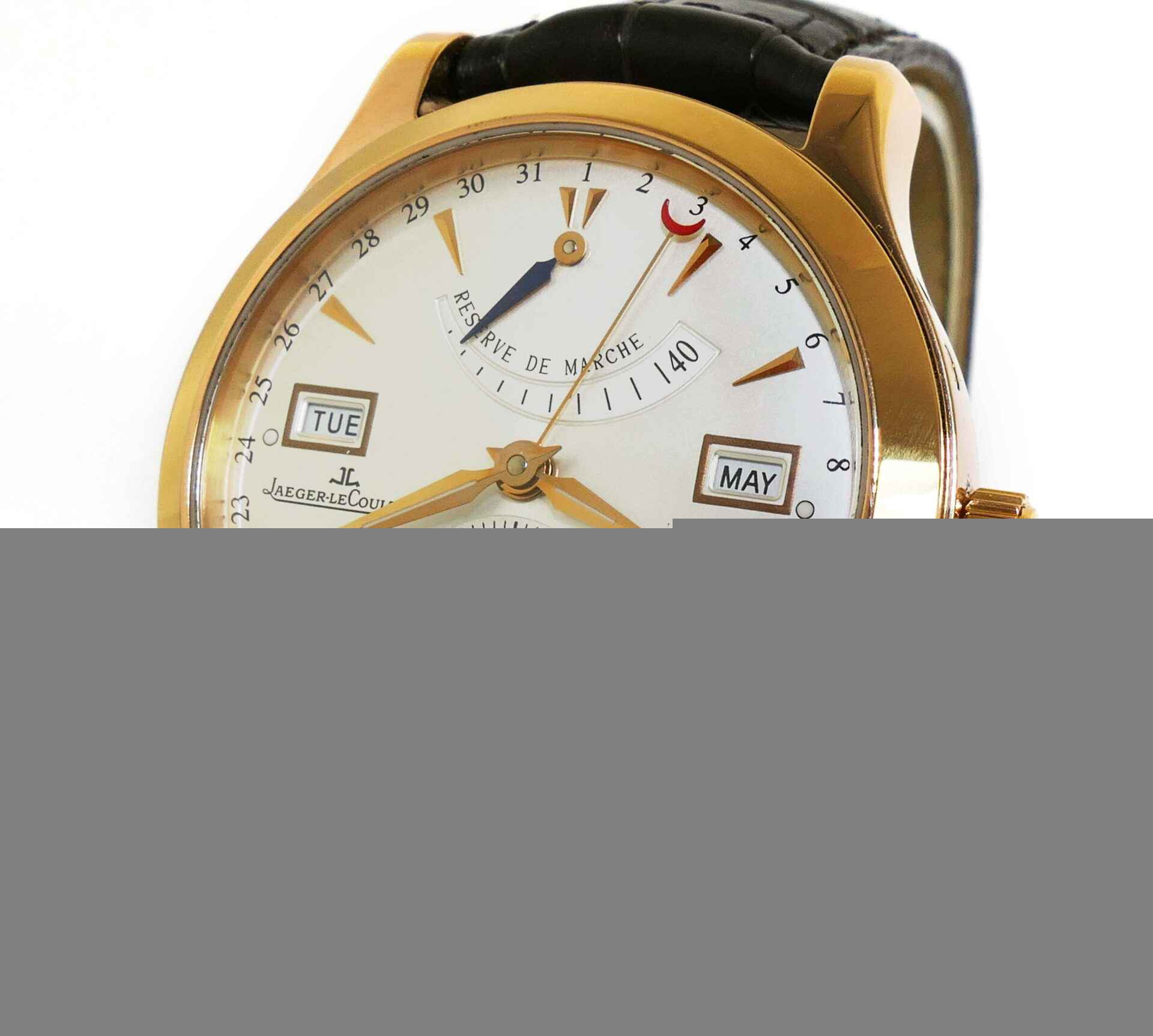 this jlc watch is in excellent condition and functioning properly. It features a day power reserve, moon-phase indicator, and annual calendar function. It comes on a brand new jlc original dark brown strap.