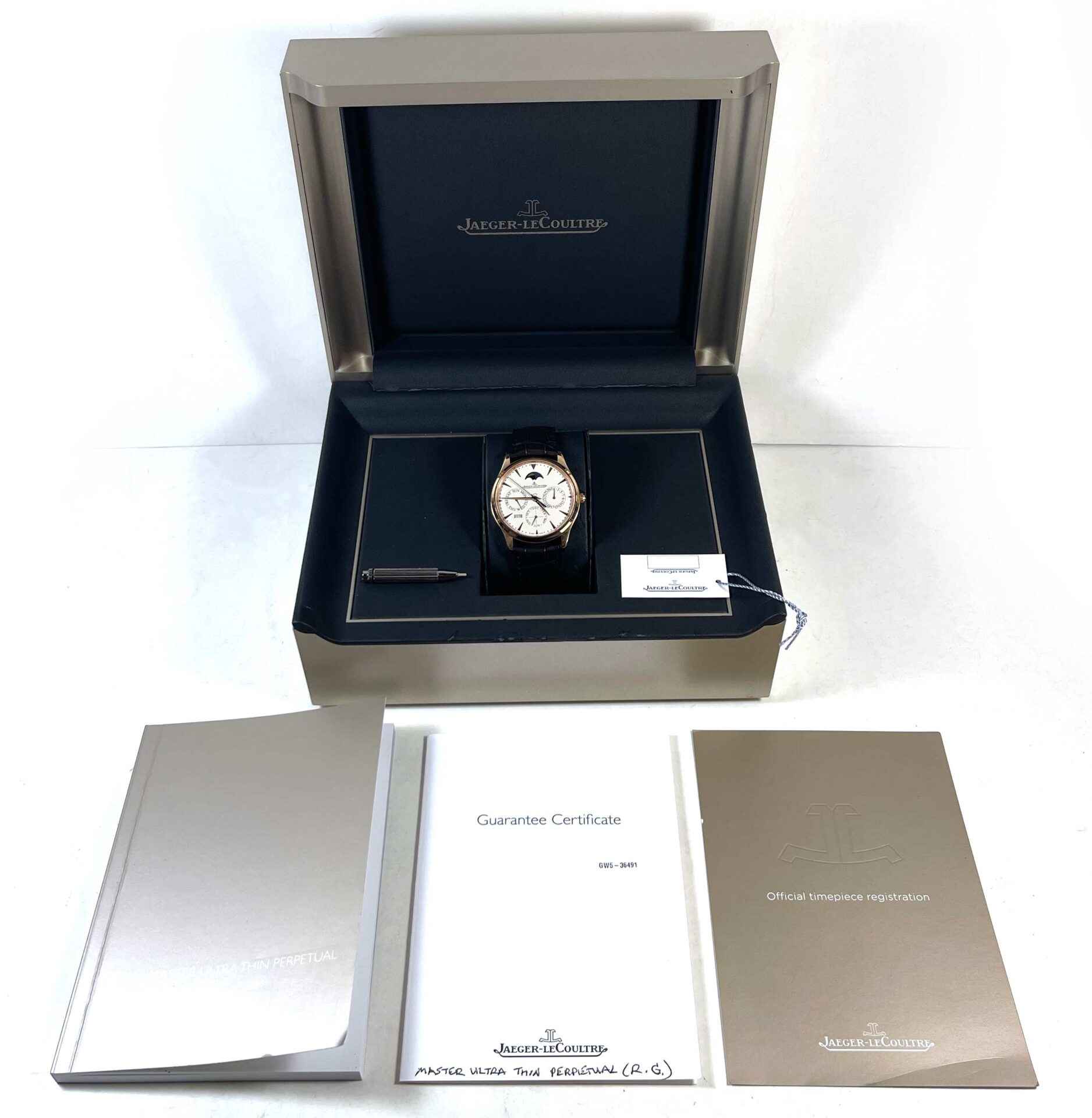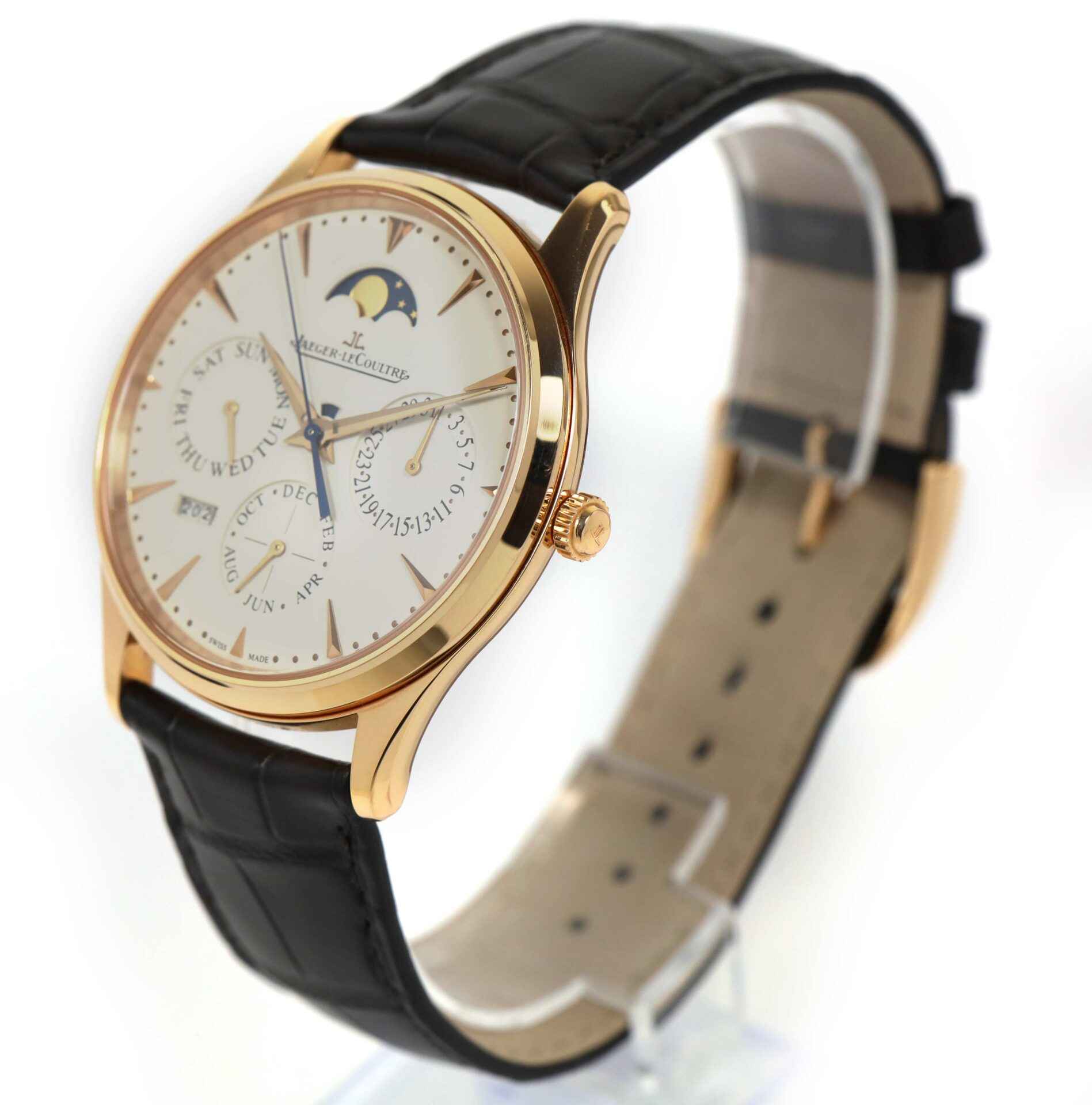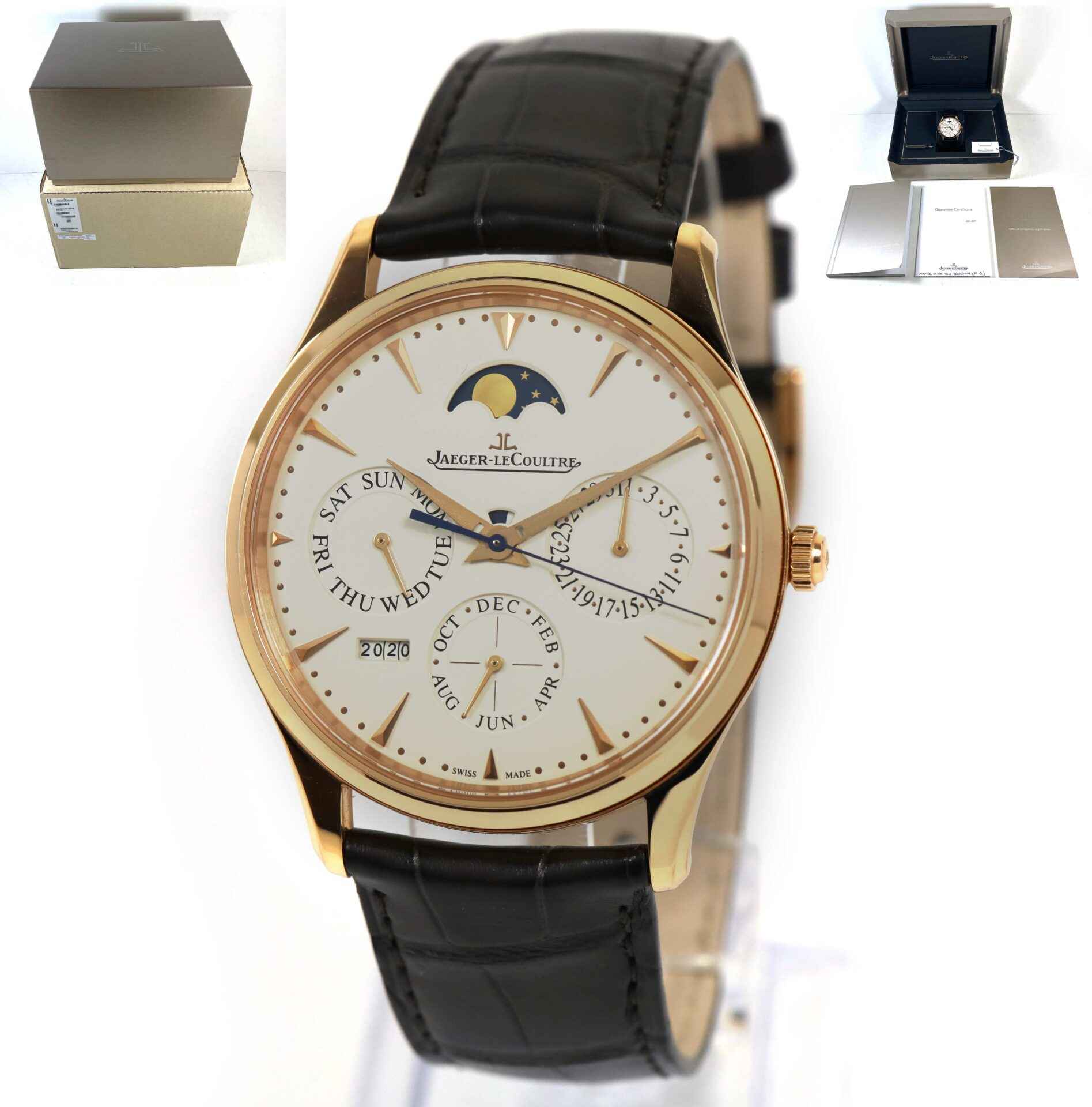 Read Morethis jaeger lecoultre watch is in super condition showing minor signs of wear on the case and comes with its box, papers, and hang tag as shown in the pictures attached. This watch features a 39mm 18k rose gold case surrounding a champagne dial and comes on a brown alligator strap with an 18k rose gold tang buckle. The watch functions include hours, minutes, seconds, day, date, month, moon phase and perpetual calendar. This watch is in stock and available to ship immediately!