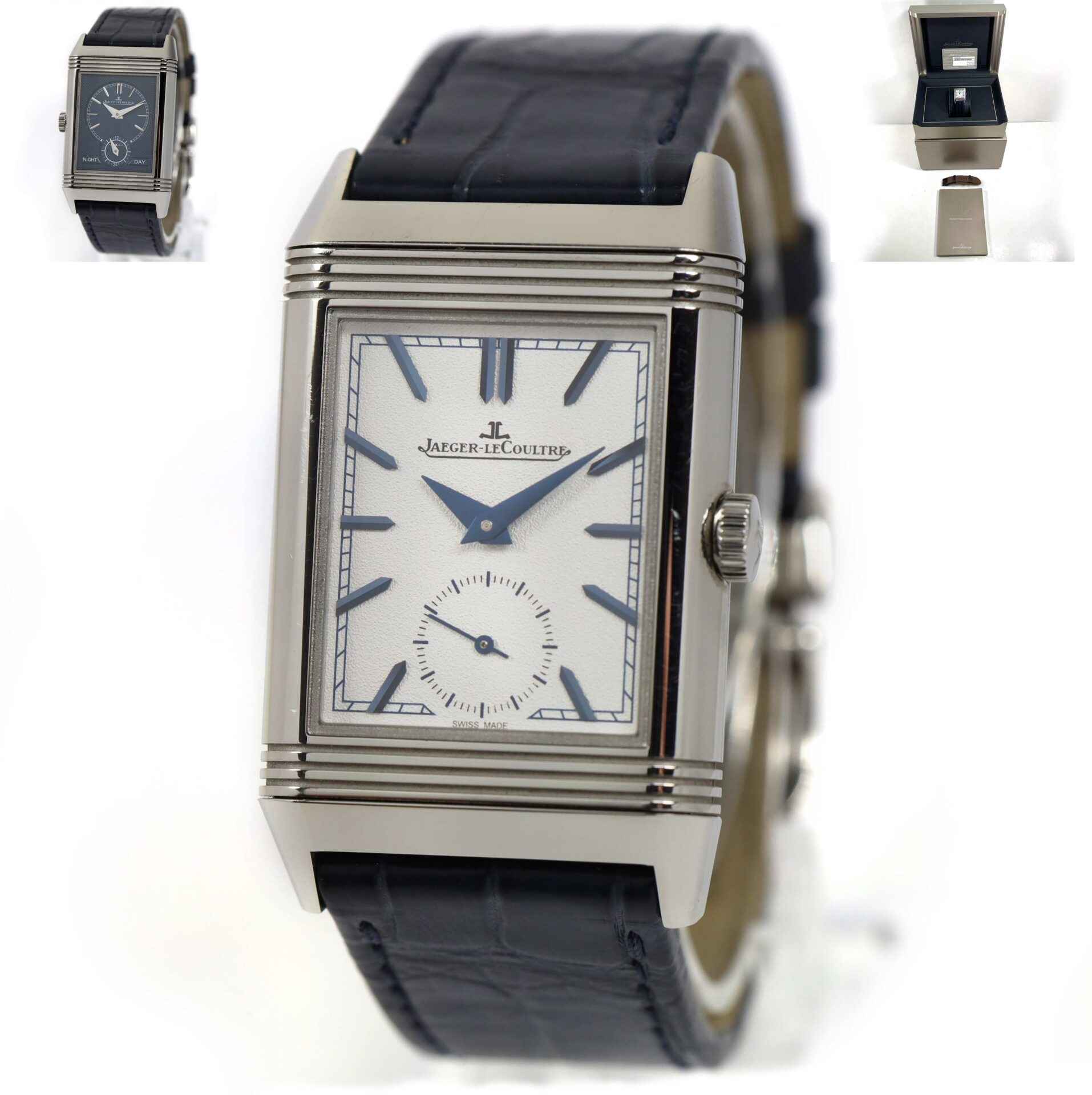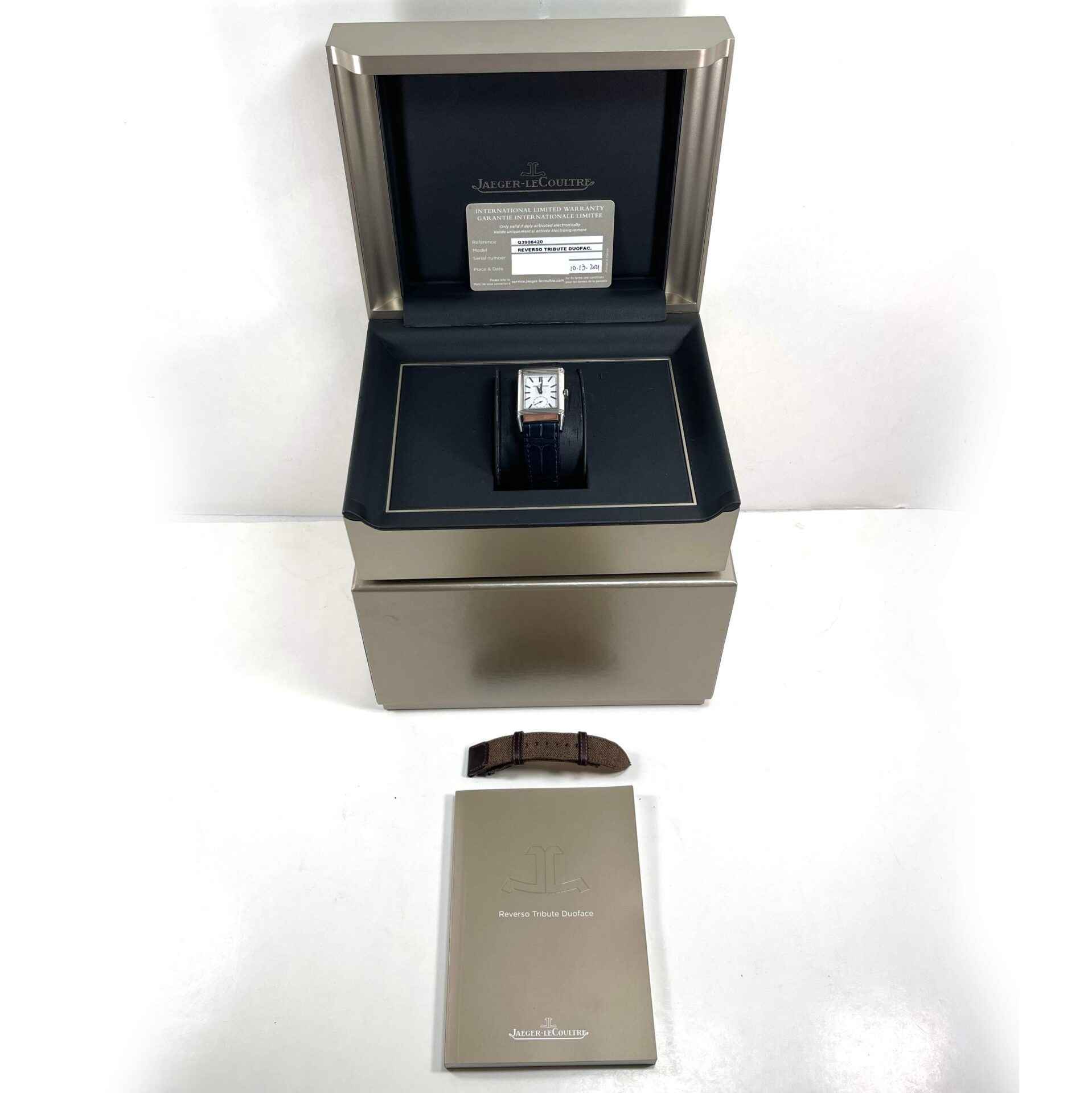 this jaeger lecoultre watch is in excellent condition and comes with its box, papers, one additional strap, and warranty card dated october 13th, 2021. This watch is in stock and ready to ship immediately!