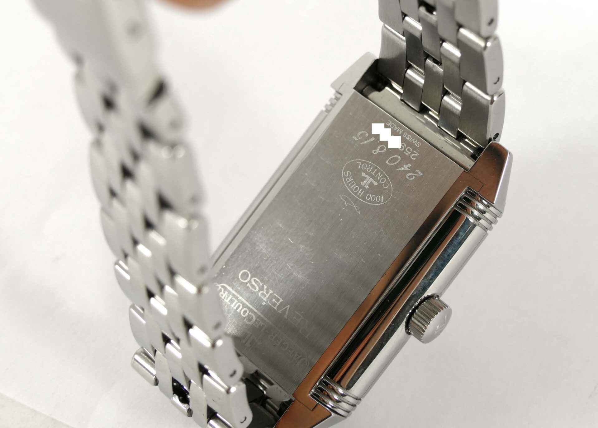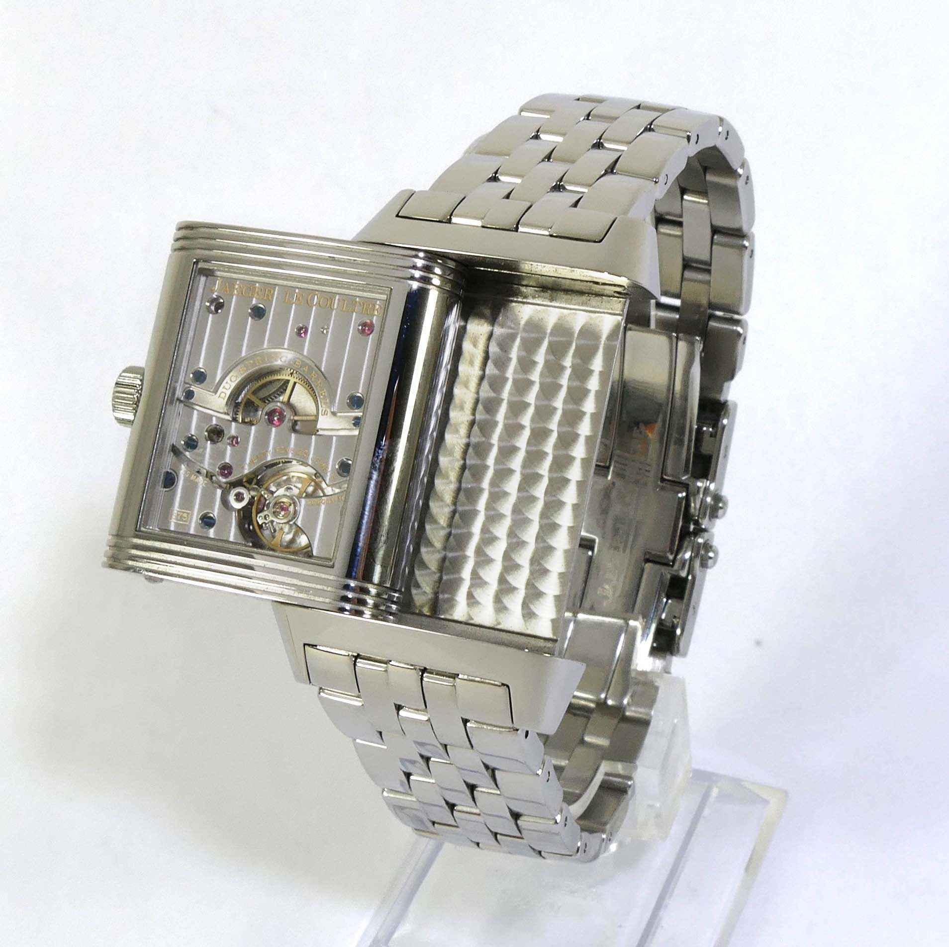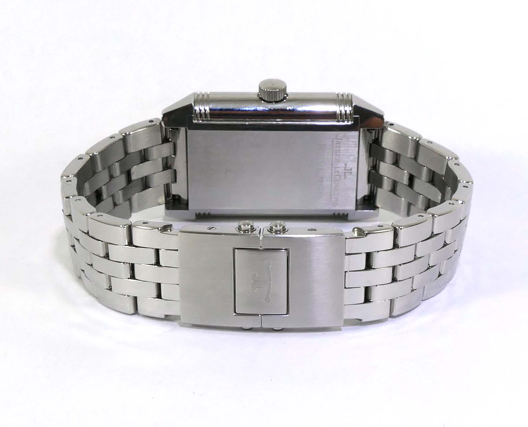 this jlc watch is in excellent condition and functioning properly. It features hours/minutes/small seconds, a big date indicator, and a power reserve. The reverse side displays its beautiful movement, which is quite a conversation piece when you wear it on that side. This watch comes with its original box and papers, dated in december 2009. All of the original links are included and will fit a large wrist. The dimensions of this watch are 47mm x 29mm.