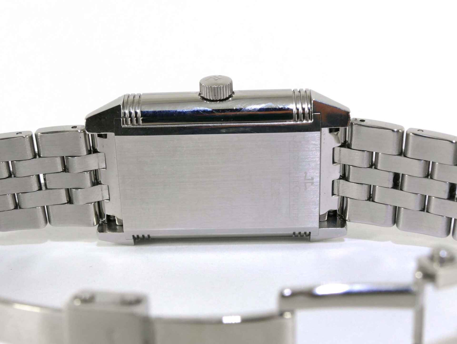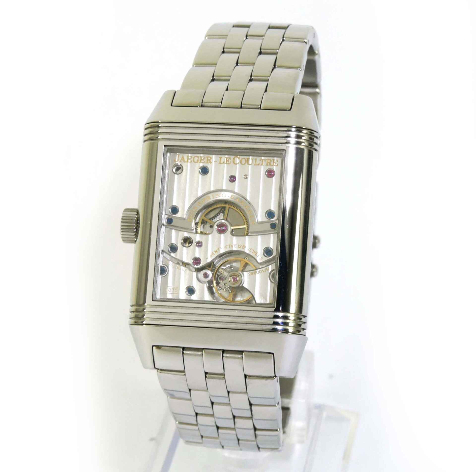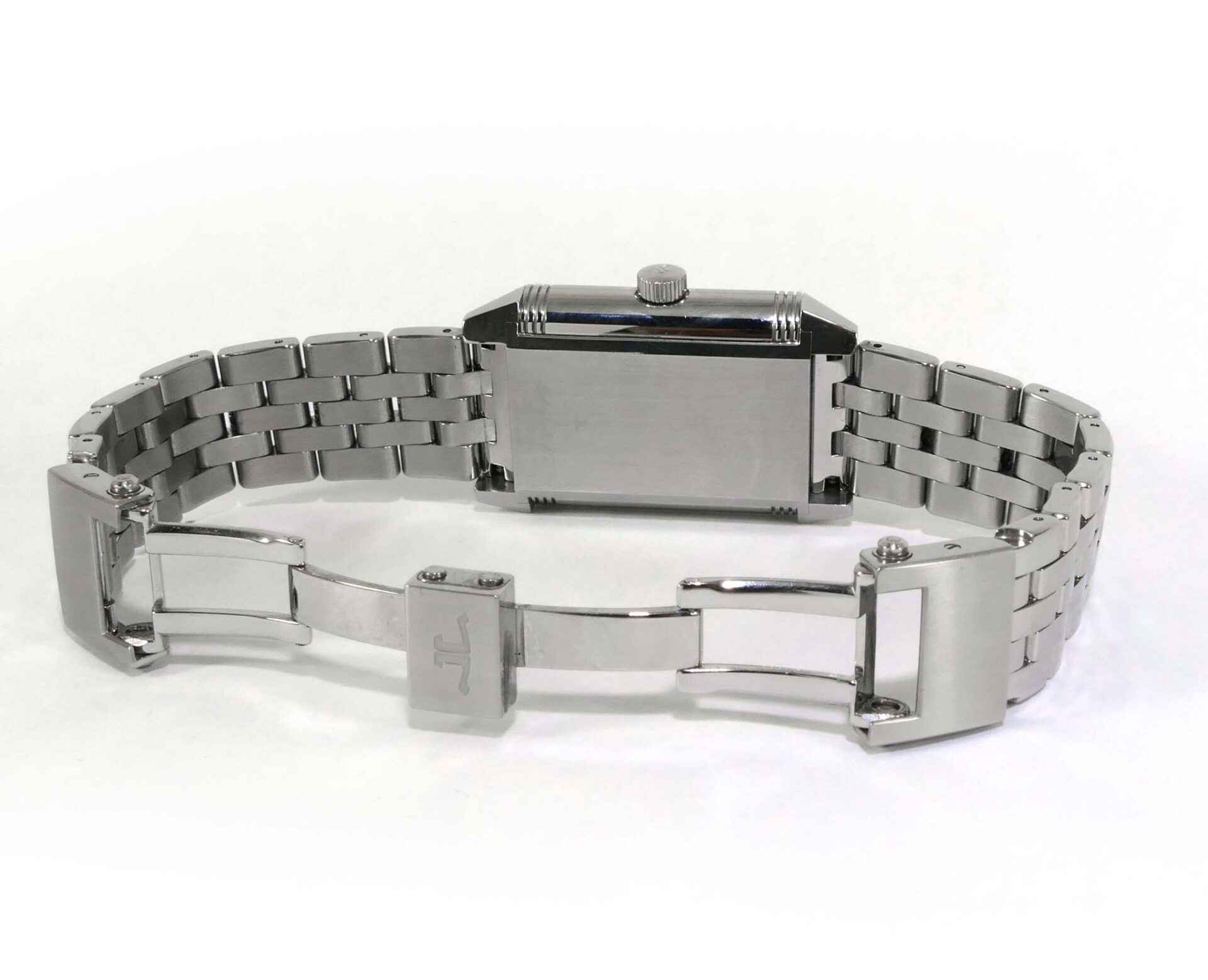 this jlc watch is in excellent condition and functioning properly. It features hours/minutes/small seconds, a big date indicator, and a power reserve. The reverse side displays its beautiful movement, which is quite a conversation piece when you wear it on that side. This watch comes with its original box and papers, dated in december 2009. All of the original links are included and will fit a large wrist. The dimensions of this watch are 47mm x 29mm.