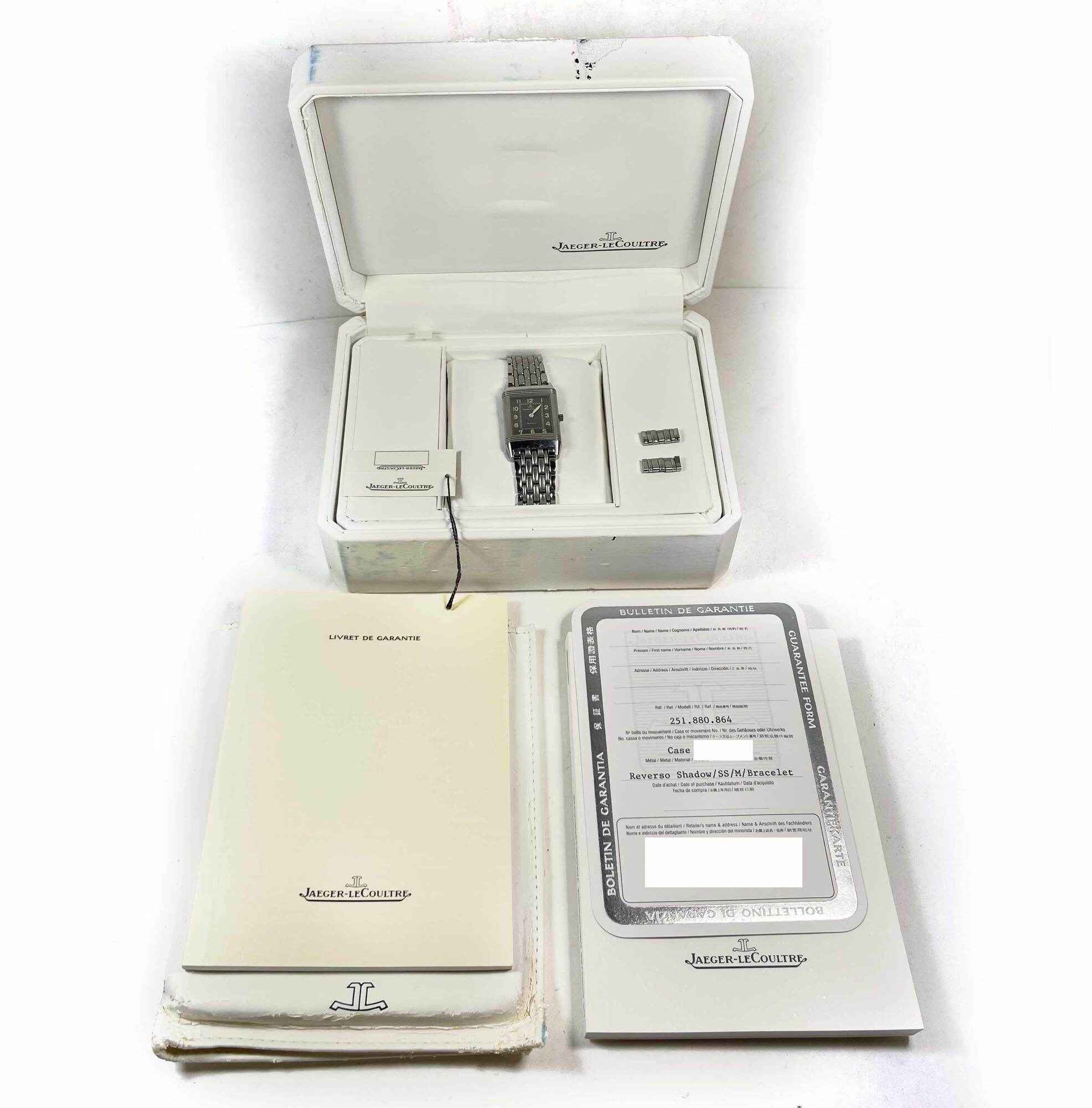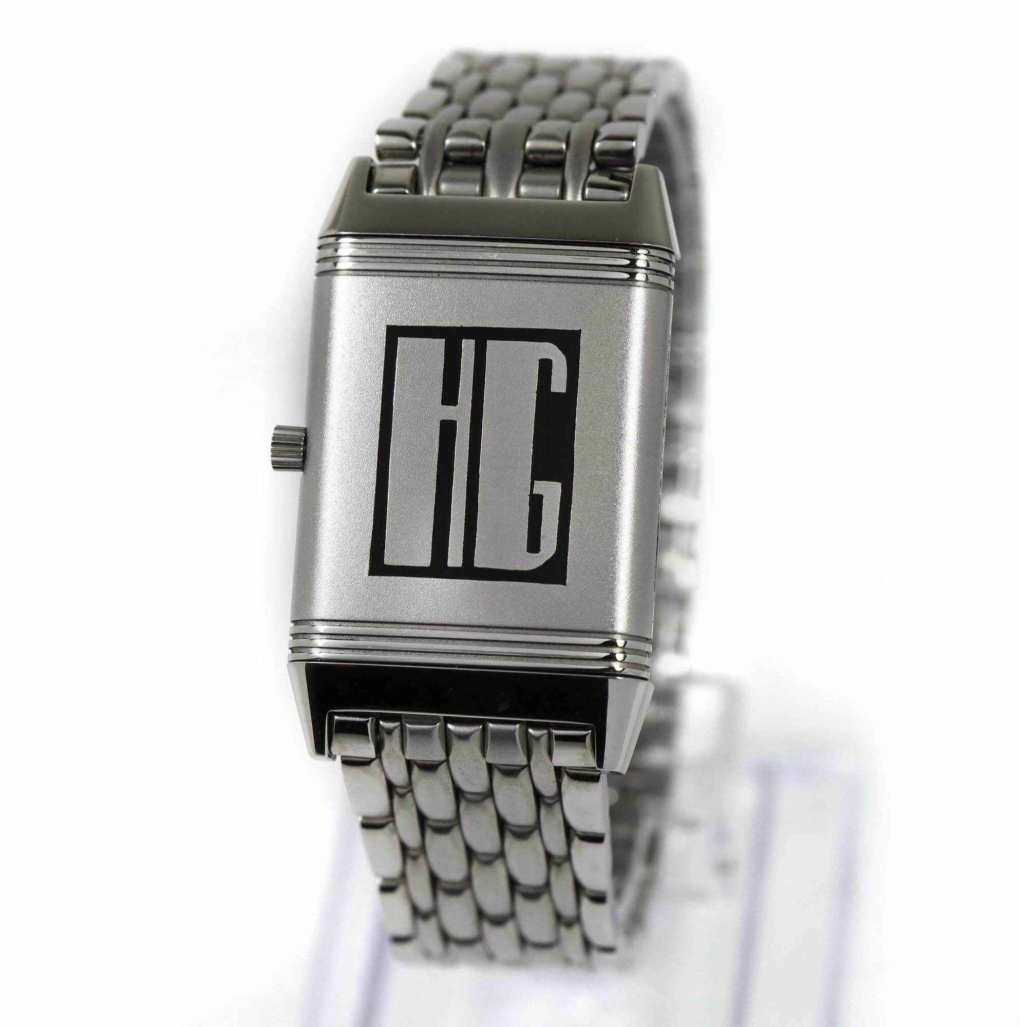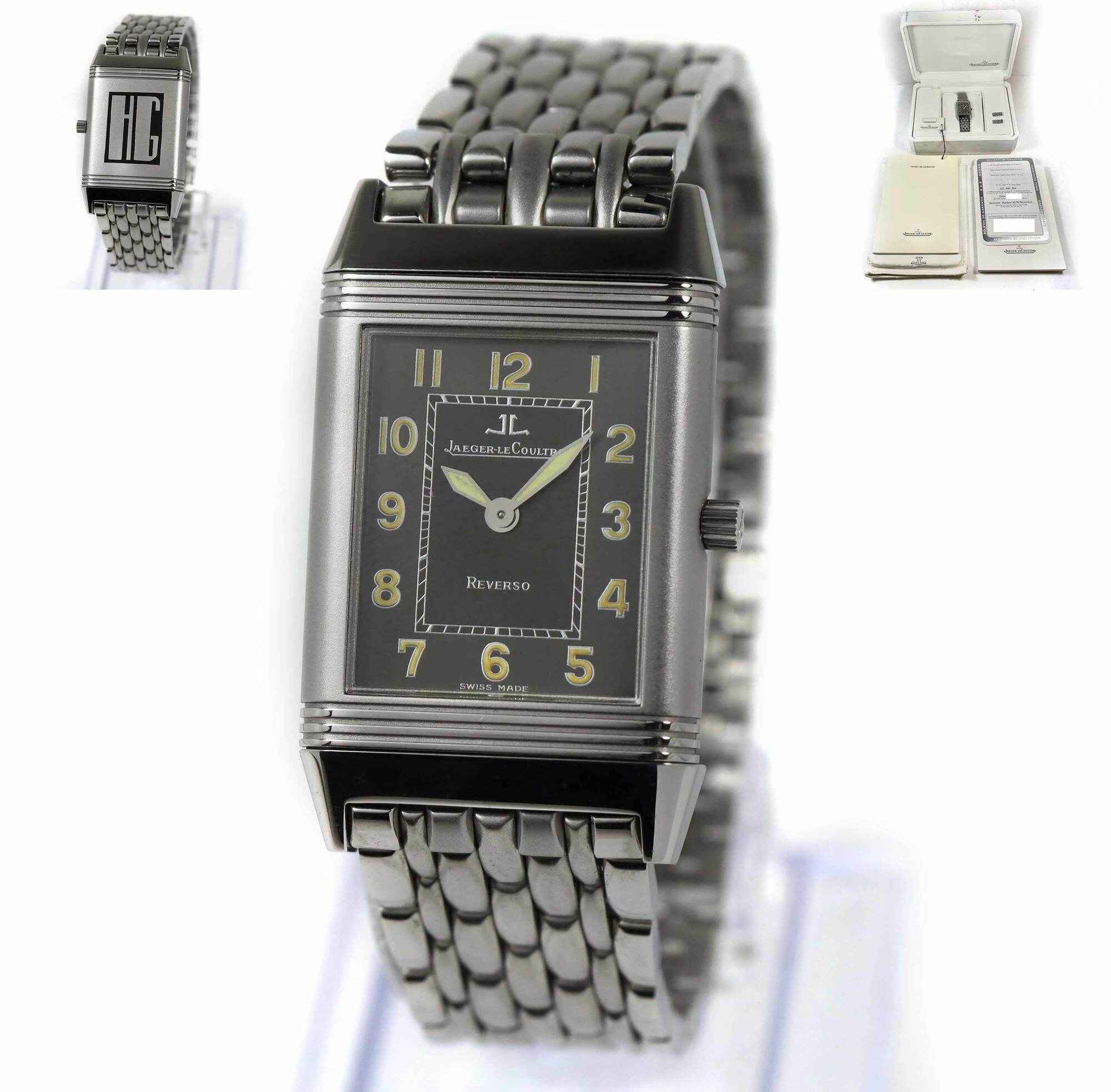 THIS JAEGER-LECOULTRE IS IN EXCELLENT OVERALL CONDITION AND COMES WITH ITS BOX, BOOKLETS, SPARE LINKS, HANG TAG, AND WARRANTY PAPER AS SHOWN IN THE PICTURES ATTACHED. THIS WATCH HAS THE PREVIOUS OWNERS INITIALS "HG" ENGRAVED ON ONE SIDE OF THE CASE AS SHOWN...