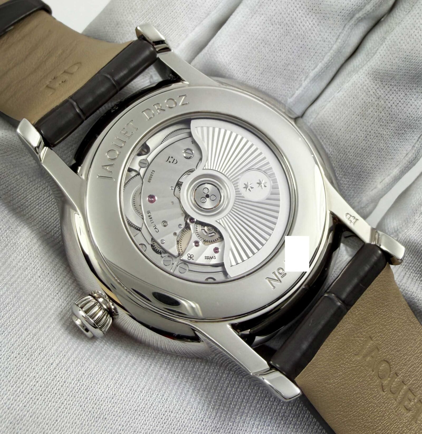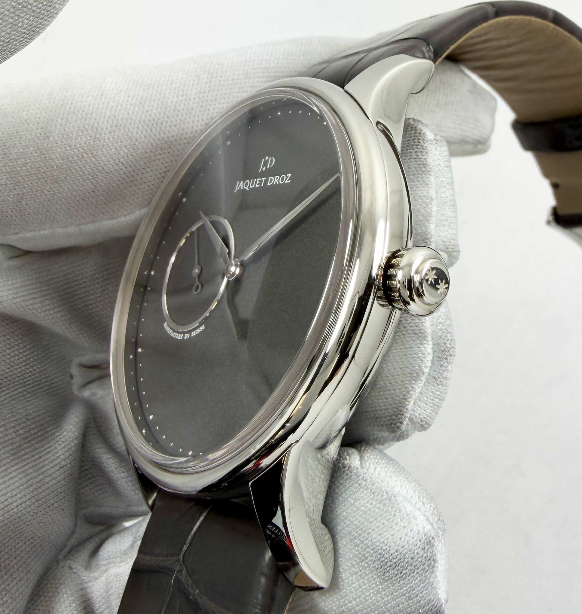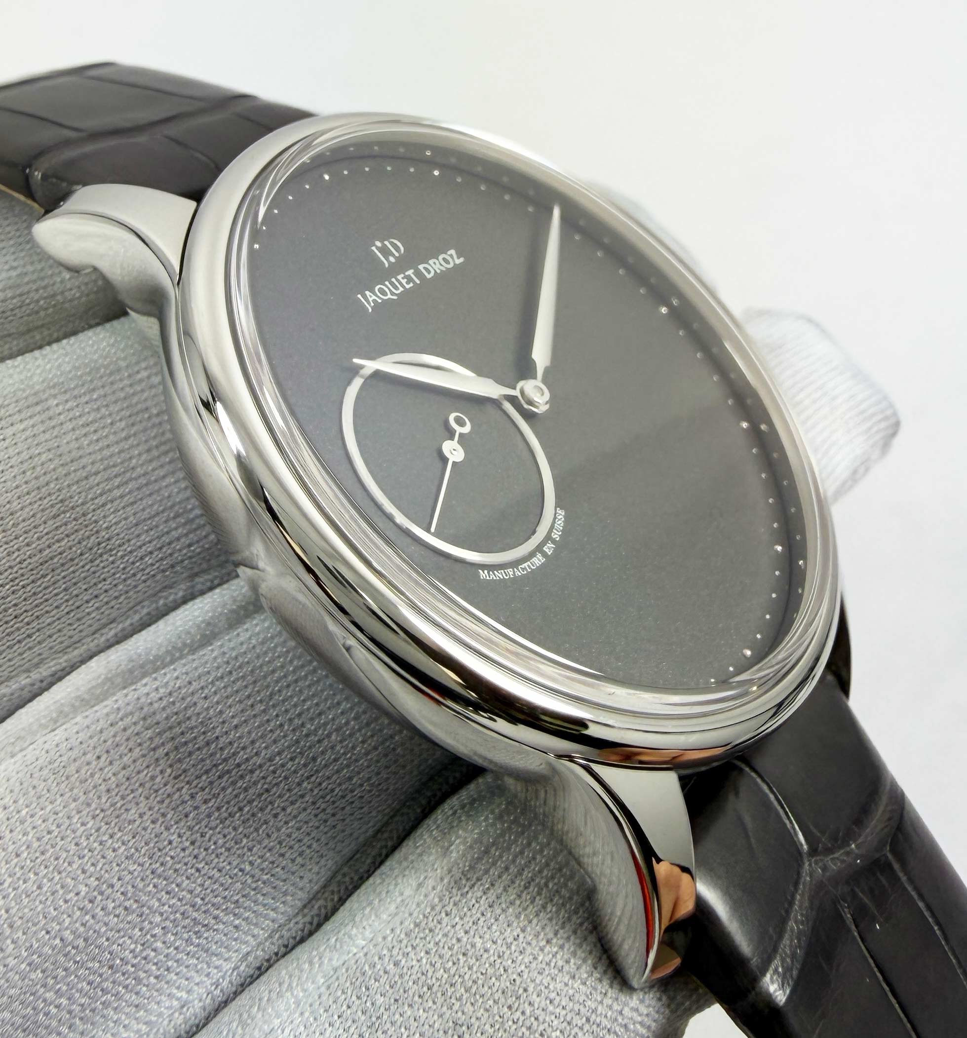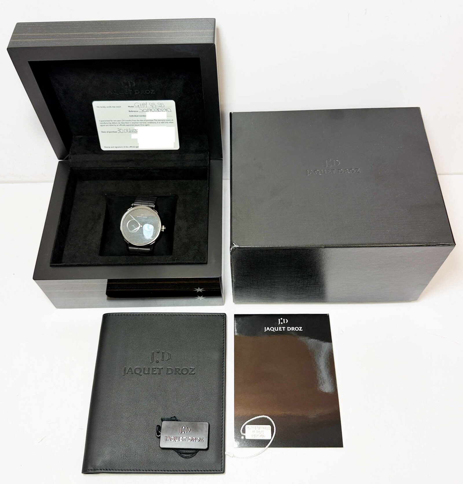 this jaquet-droz watch comes with its box, booklet, hang tag, and warranty card dated january 2023. The photos shown are of the exact watch being sold and accurately represent its condition. This watch is in stock and ready to ship immediately!