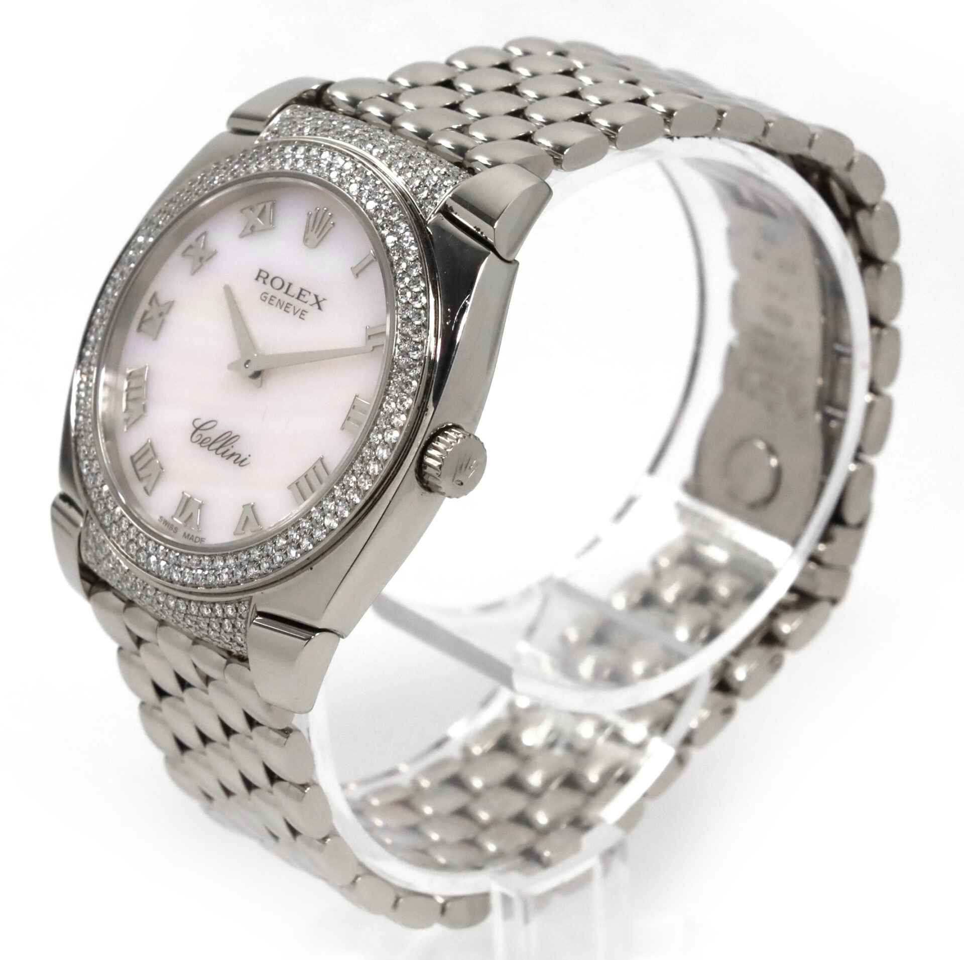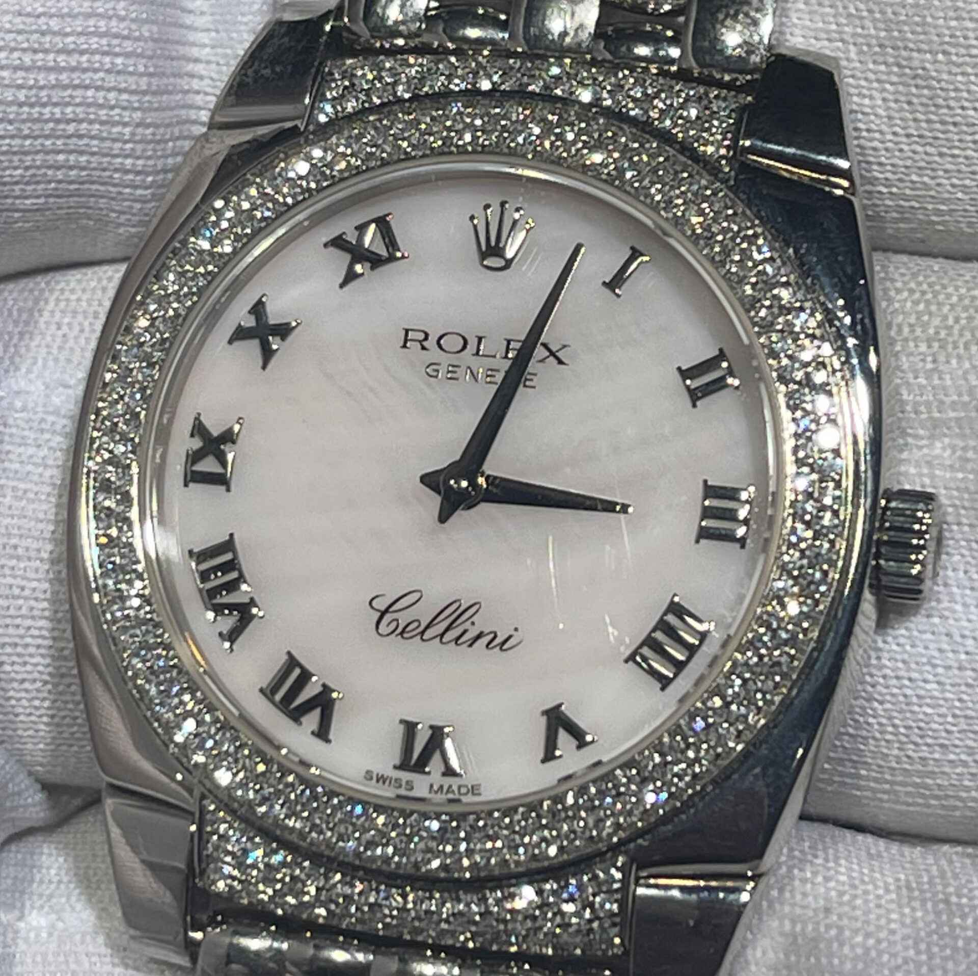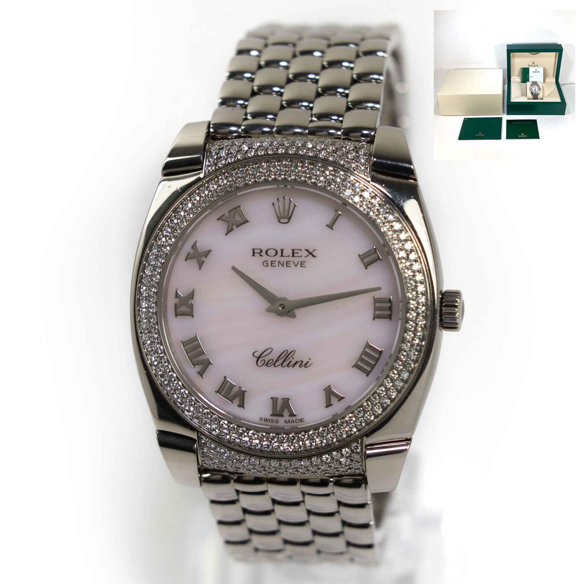 Read Morethis rolex cellini is in good overall condition showing minor signs of wear with a few light scratches on the crystal as shown in the photos attached. This watch comes with box, papers, and warranty card dated december 14th, 2015. This watch features a pink mother-of-pearl dial on a 18k white gold case with factory set diamonds. This unique dial is a factory set pink mother-of-pearl not to be confused with the more common white mother-of-pearl dial. This watch is in stock and available to ship immediately!