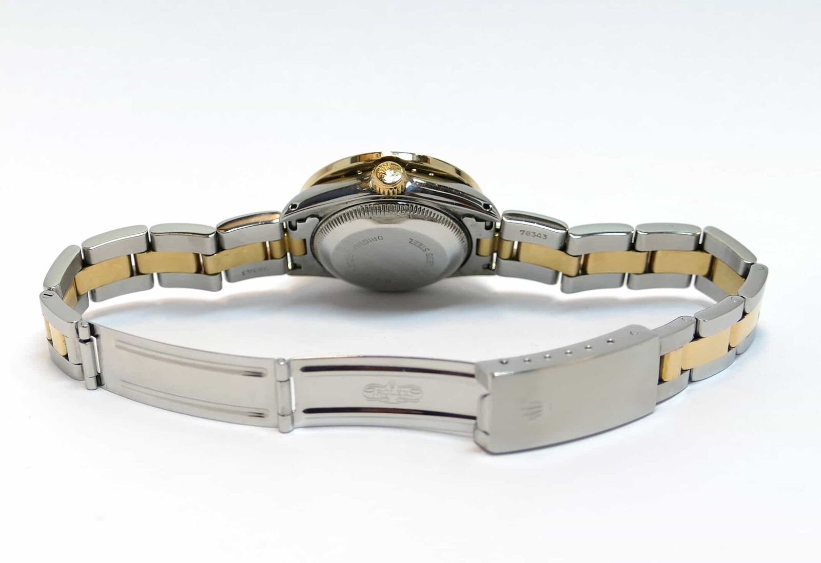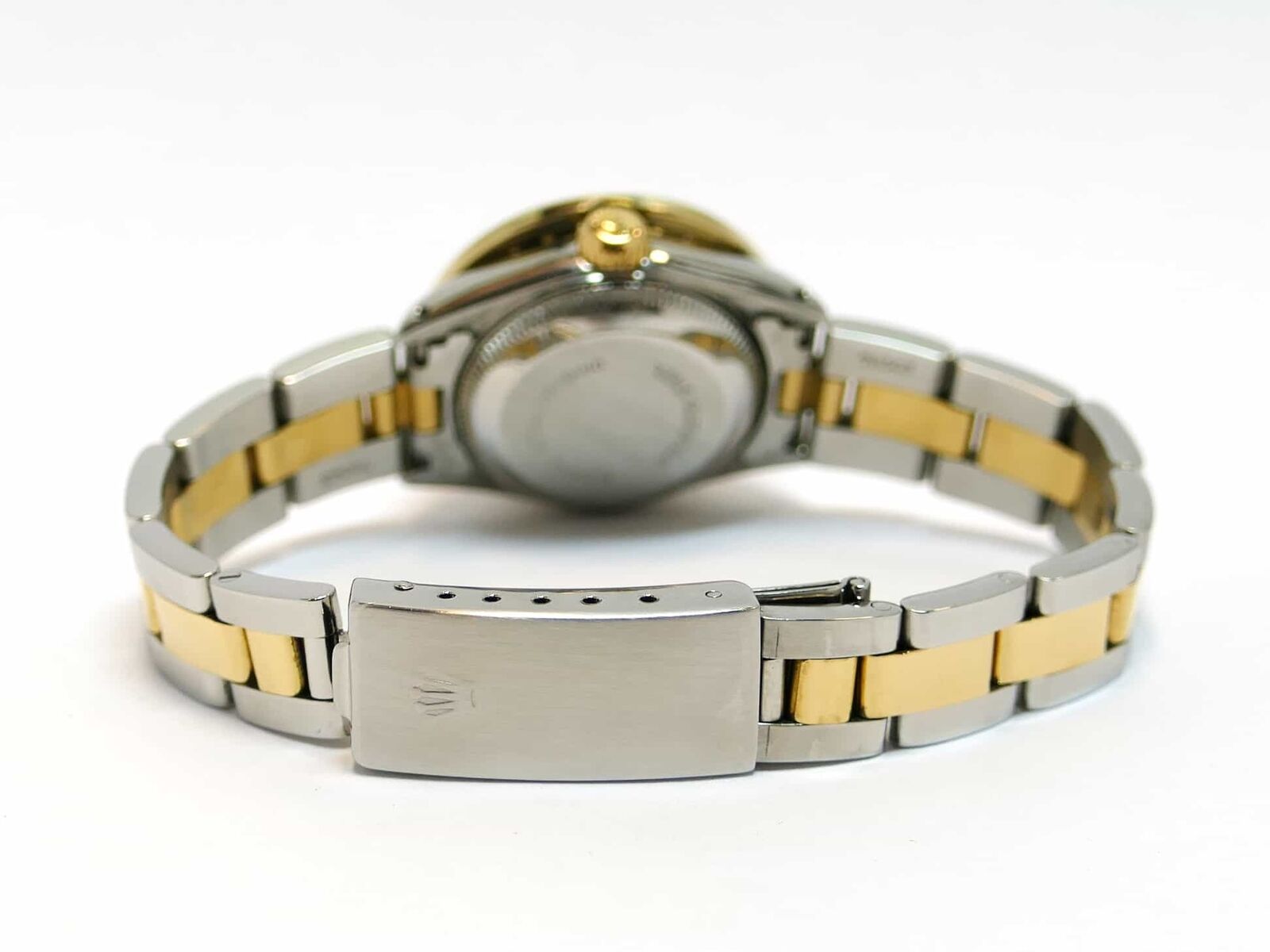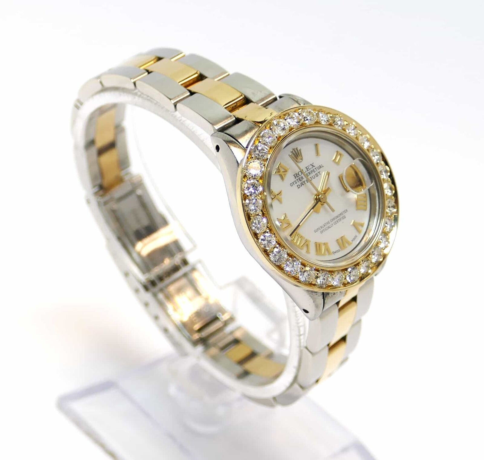 this rolex watch features a custom mother of pearl diamond dial and a custom 2.5 carat diamond bezel. The diamonds in the bezel are si clarity, and h/i color and are set in a yellow gold bezel. This watch comes in an authentic rolex presentation box.