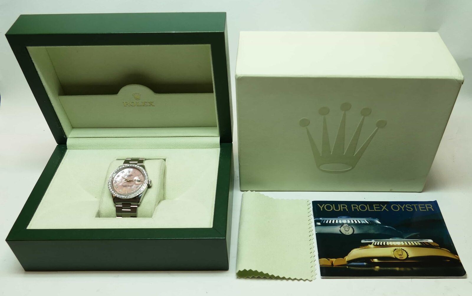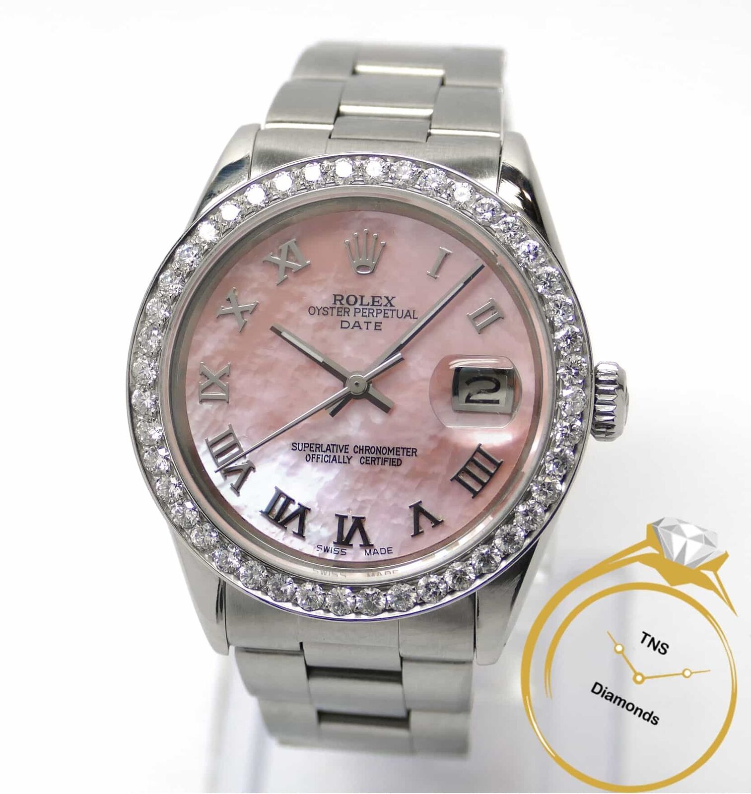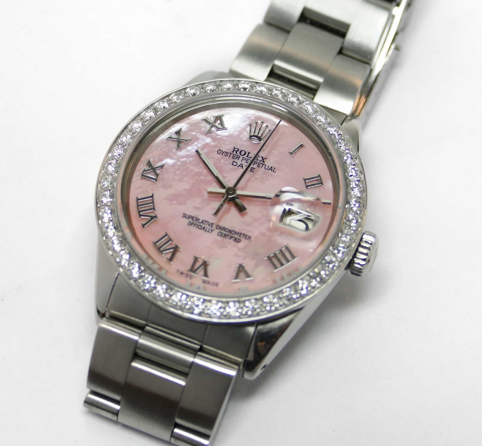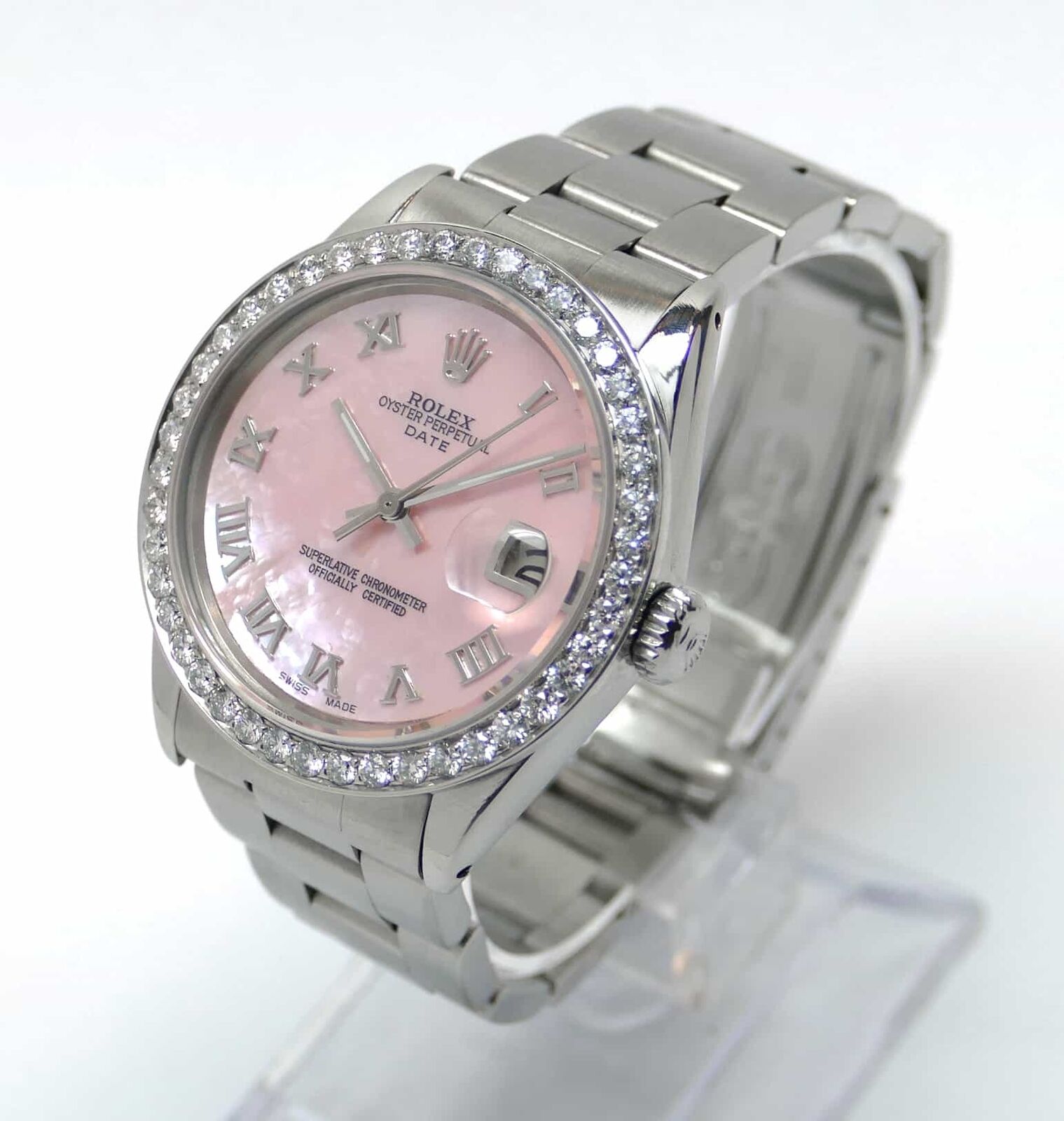 this rolex oyster perpetual date features a beautiful custom mother of pearl pink diamond dial, and a custom 2.2 carat diamond bezel. Everything else on the watch is 100% original. The diamonds are si1 clarity and g color. The condition of this watch is excellent and it is keeping accurate time. It comes in an authentic rolex box.