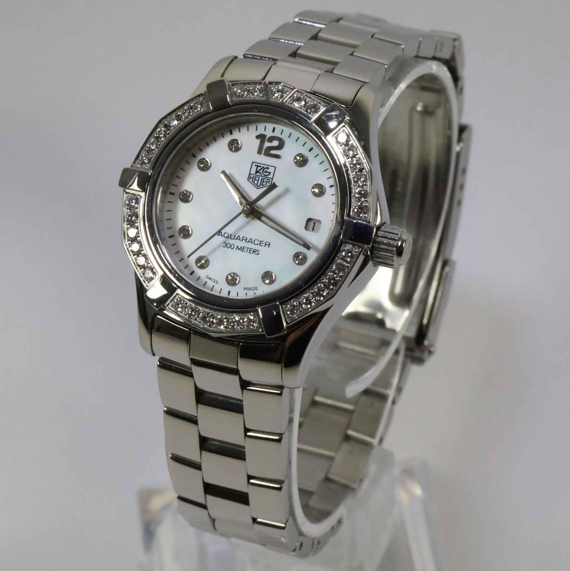 Read Morethis tag heuer watch is in excellent condition showing some minor signs of wear consistent with regular use. This watch comes as watch only as shown in the pictures attached. This tag is a quartz watch and features a factory diamond bezel that surrounds a mother of pearl dial and comes on a stainless steel bracelet. This watch is in stock and available to ship immediately!