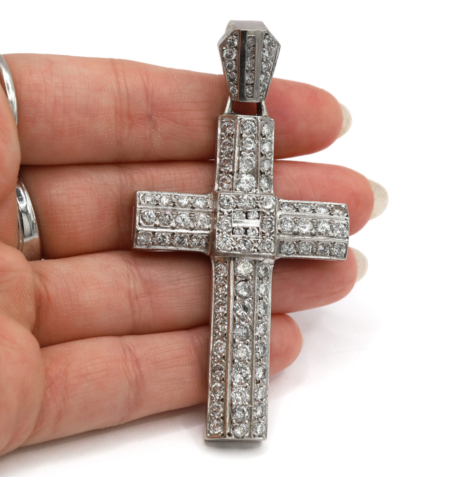 Material: 14k White Gold Gemstone: Natural Diamond Carat Weight: Approximately 4.00 Carat Clarity: SI1 Color: F/G Cut: Round Type: Cross Pendant Measurements: 2.75 x 1.5” Weight: 28.9 Grams