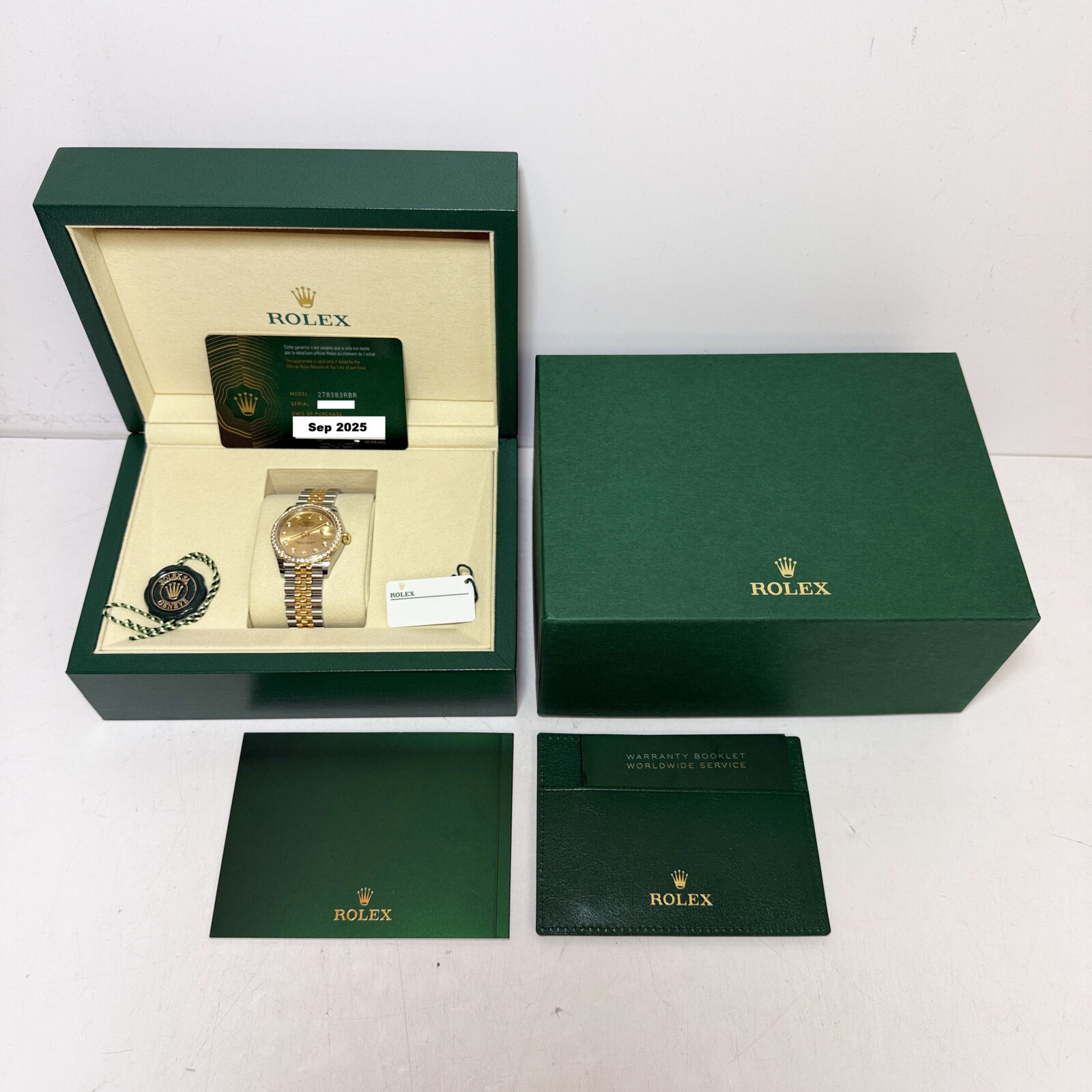 this rolex datejust watch comes with its box, booklets, hangtags, and warranty card dated april, 2025. The photos shown are of the exact watch being sold and accurately represent its condition. This watch is in stock and ready to ship immediately!