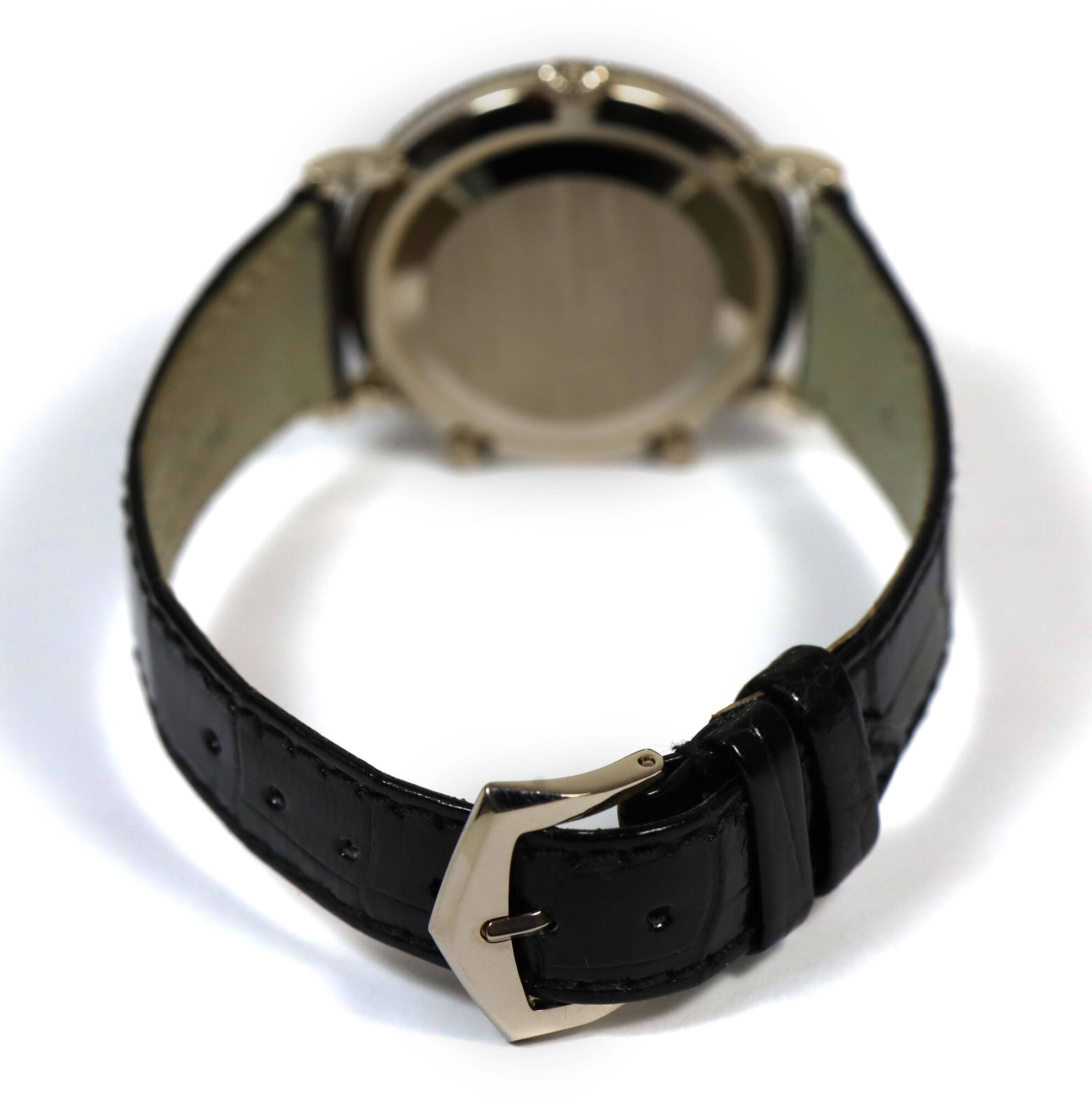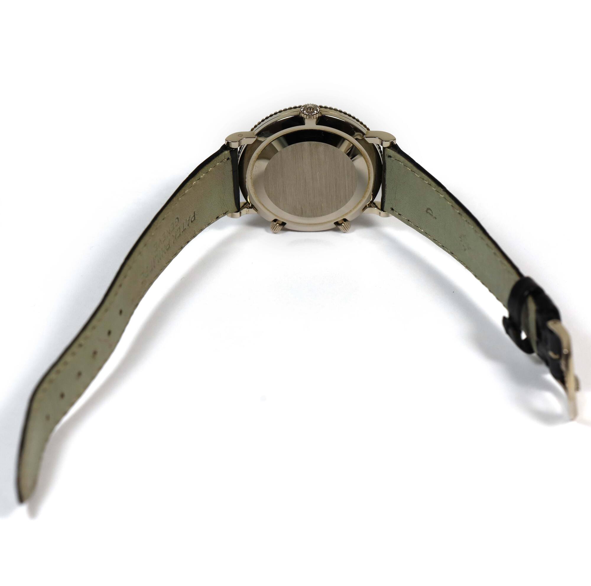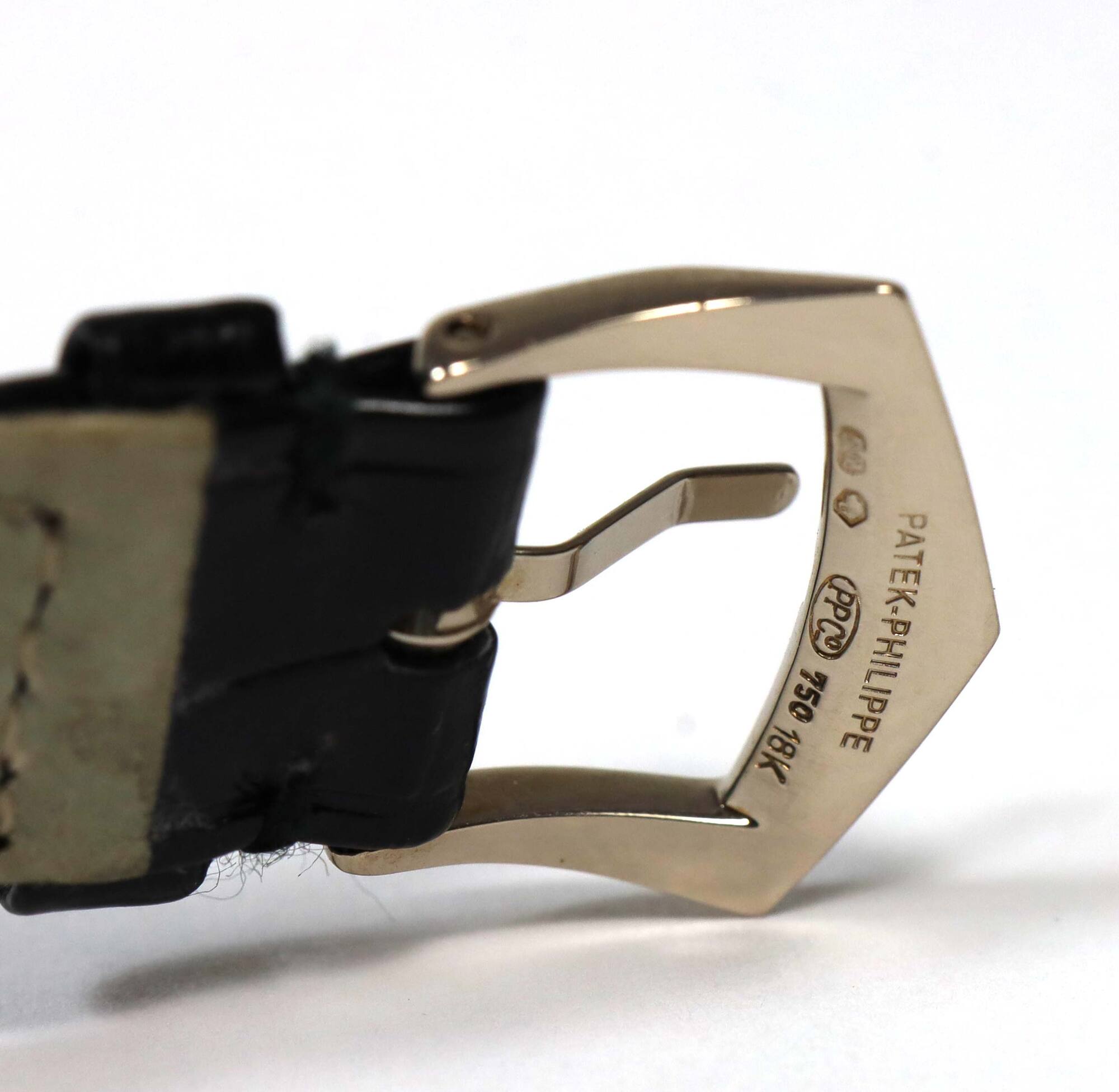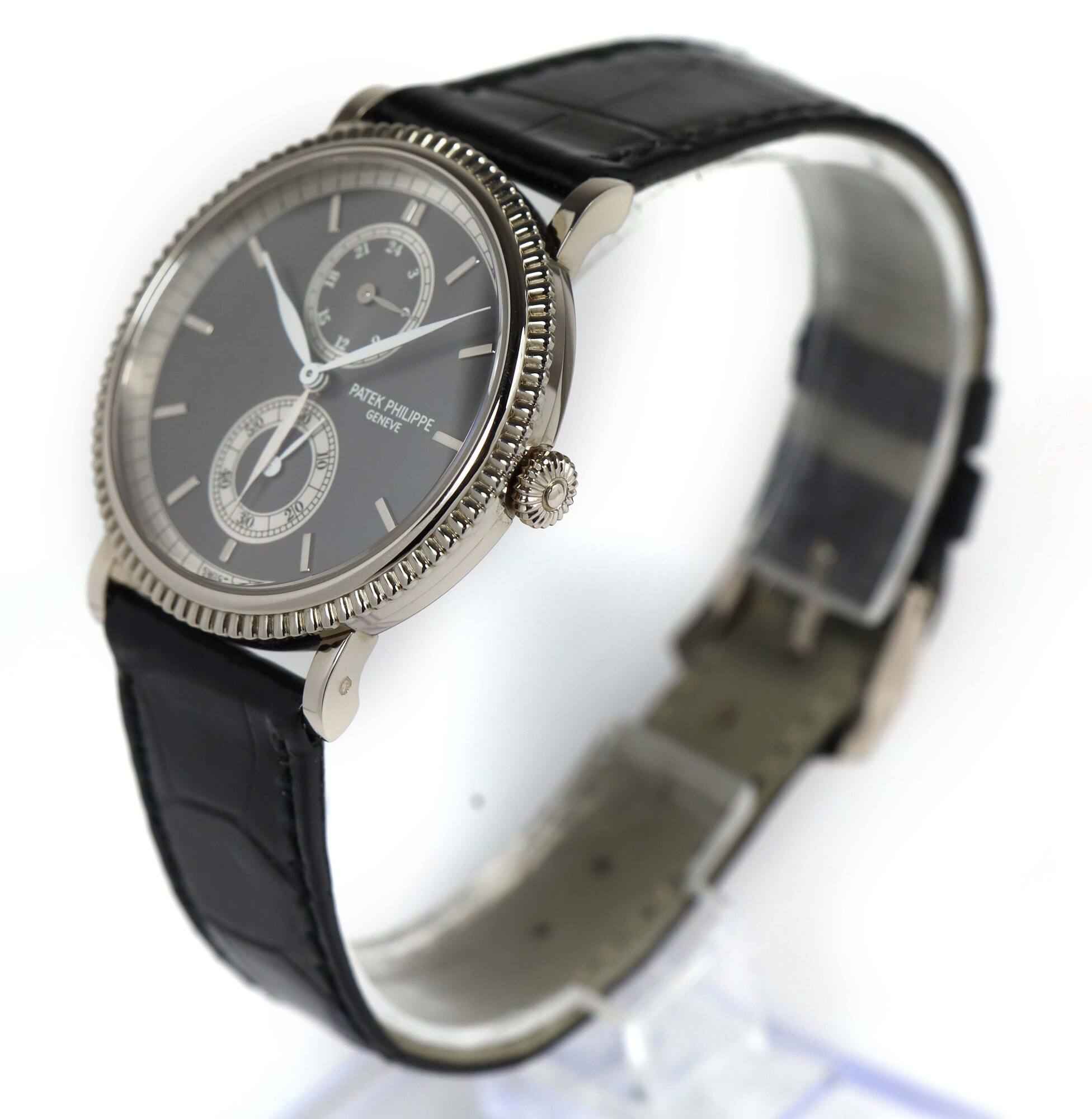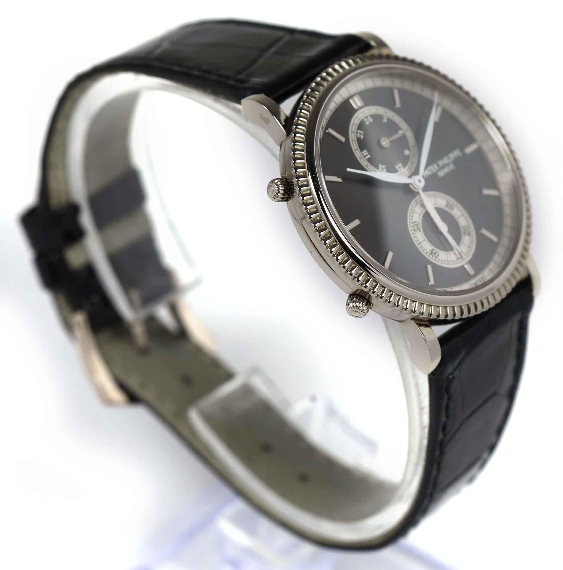 Read Morethis patek is 99% lnib and comes with its warranty paper and travel pouch as shown in the pictures attached. This watch features a 34mm white gold case that surrounds a grey dial and comes on a black leather strap with a white gold buckle. This watch is in stock and available to ship immediately!
