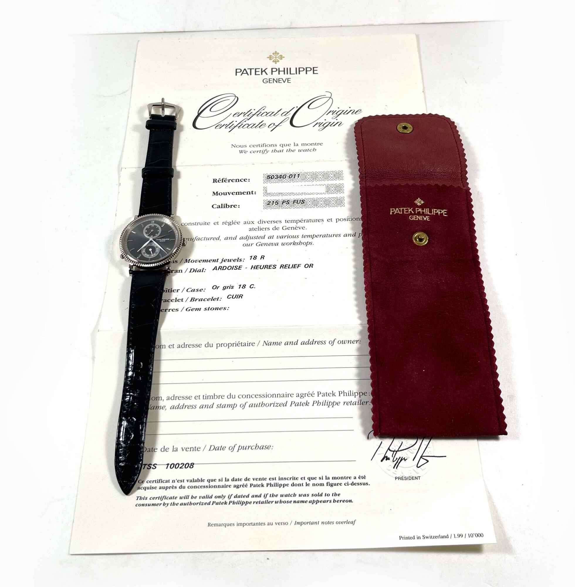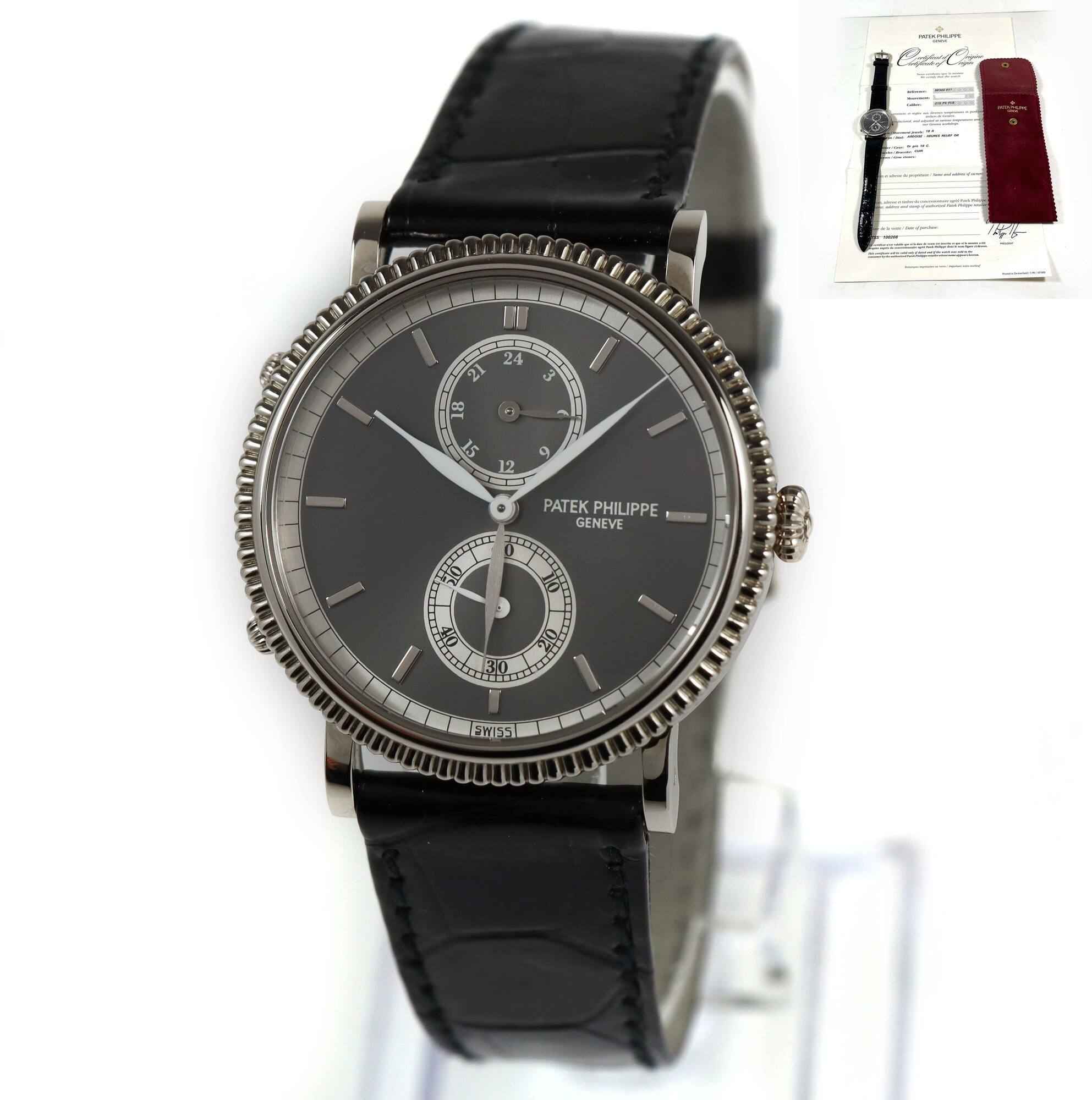 THIS PATEK IS 99% LNIB AND COMES WITH ITS WARRANTY PAPER AND TRAVEL POUCH AS SHOWN IN THE PICTURES ATTACHED. THIS WATCH FEATURES A 34MM WHITE GOLD CASE THAT SURROUNDS A GREY DIAL AND COMES ON A BLACK LEATHER STRAP WITH A WHITE GOLD BUCKLE. THIS WATCH IS IN ...