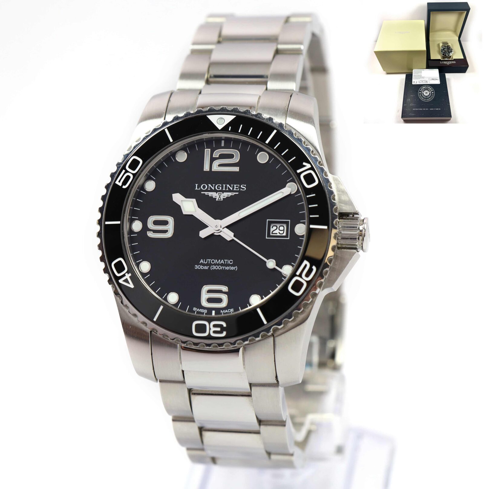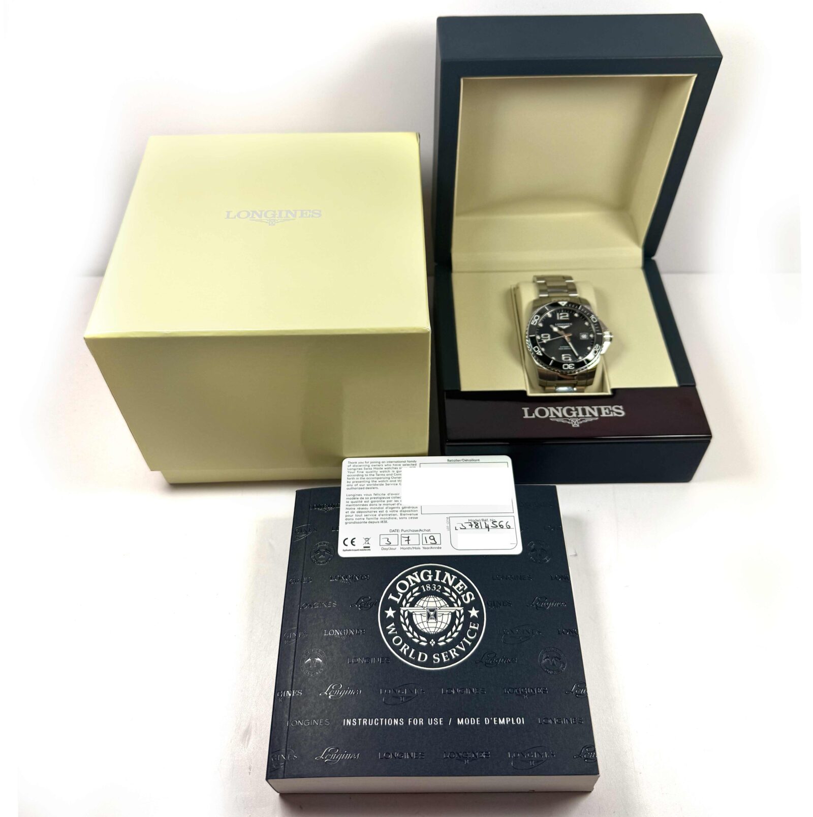 this longines watch is in great overall condition showing some light signs of wear consistent with preowned watches. This comes with its box, booklets, and warranty card dated july 3rd, 2019 as shown in the pictures attached.